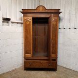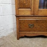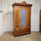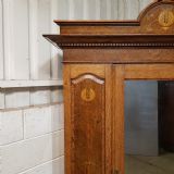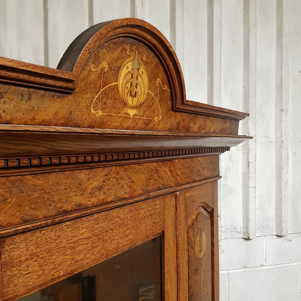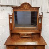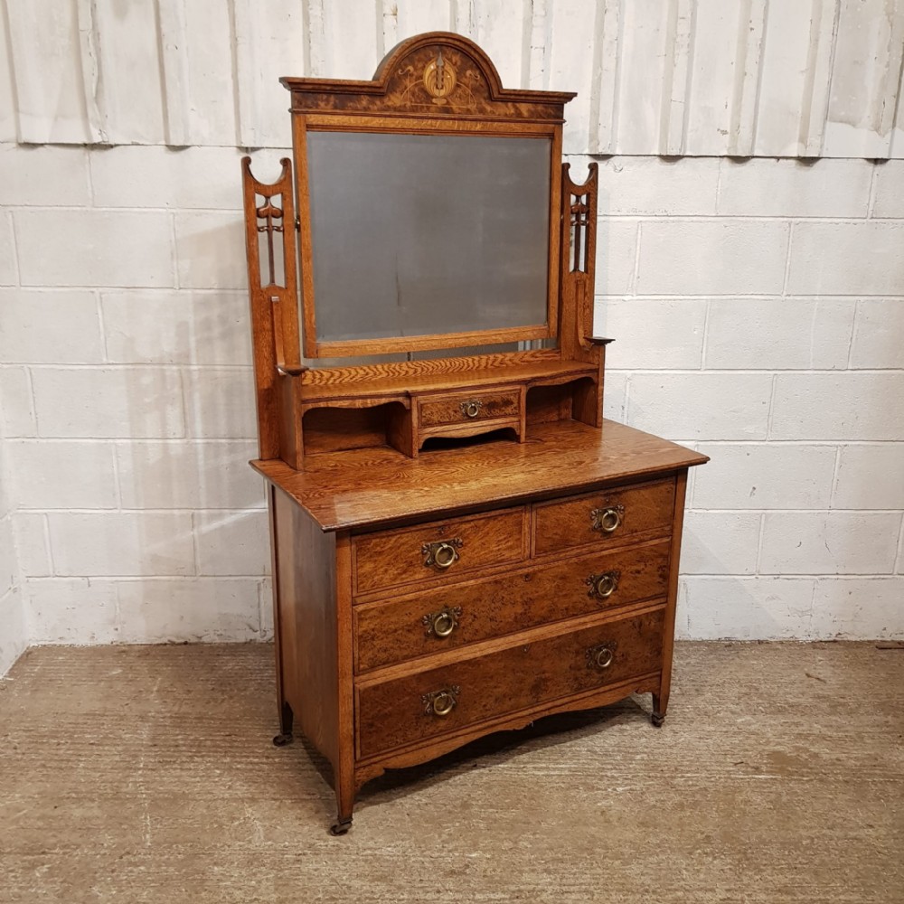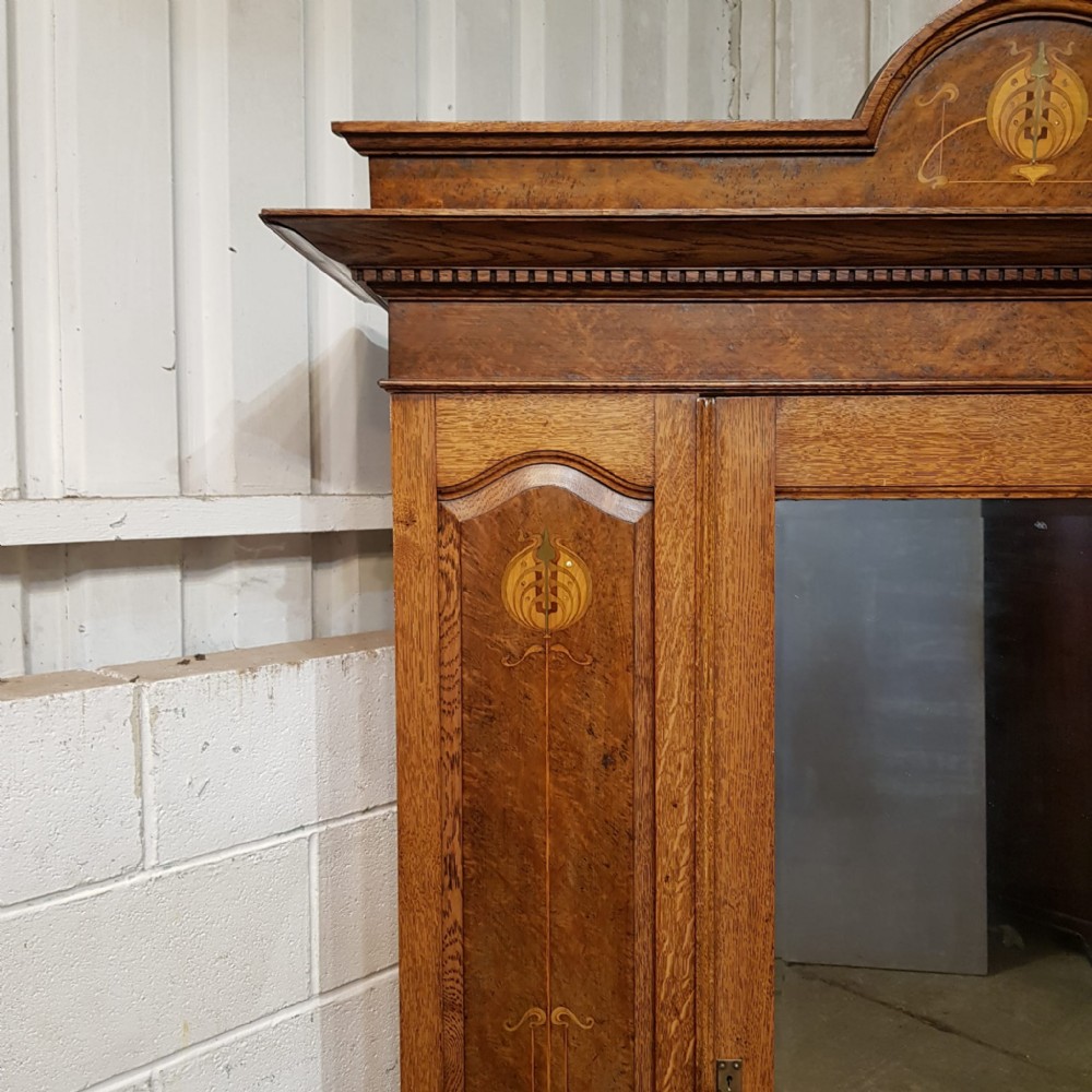 Wardrobe: The wardrobe has a moulded cornice with a Burr Oak lip under and a Burr Oak pediment above with an inlaid centre which is mother of pearl, rosewood, satinwood, olive wood and pewter. The washstand and dressing chest all have the same pediment. It has a central mirrored door with original Brass handle and a rail inside. To each side of the door is a fielded inlaid Burr Oak panel. The base has a long deep drawer which is Oak lined with original Brass handles and Burr drawer front. It stands on styled legs with a shaped pediment in between.