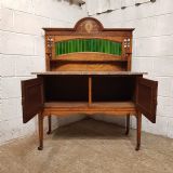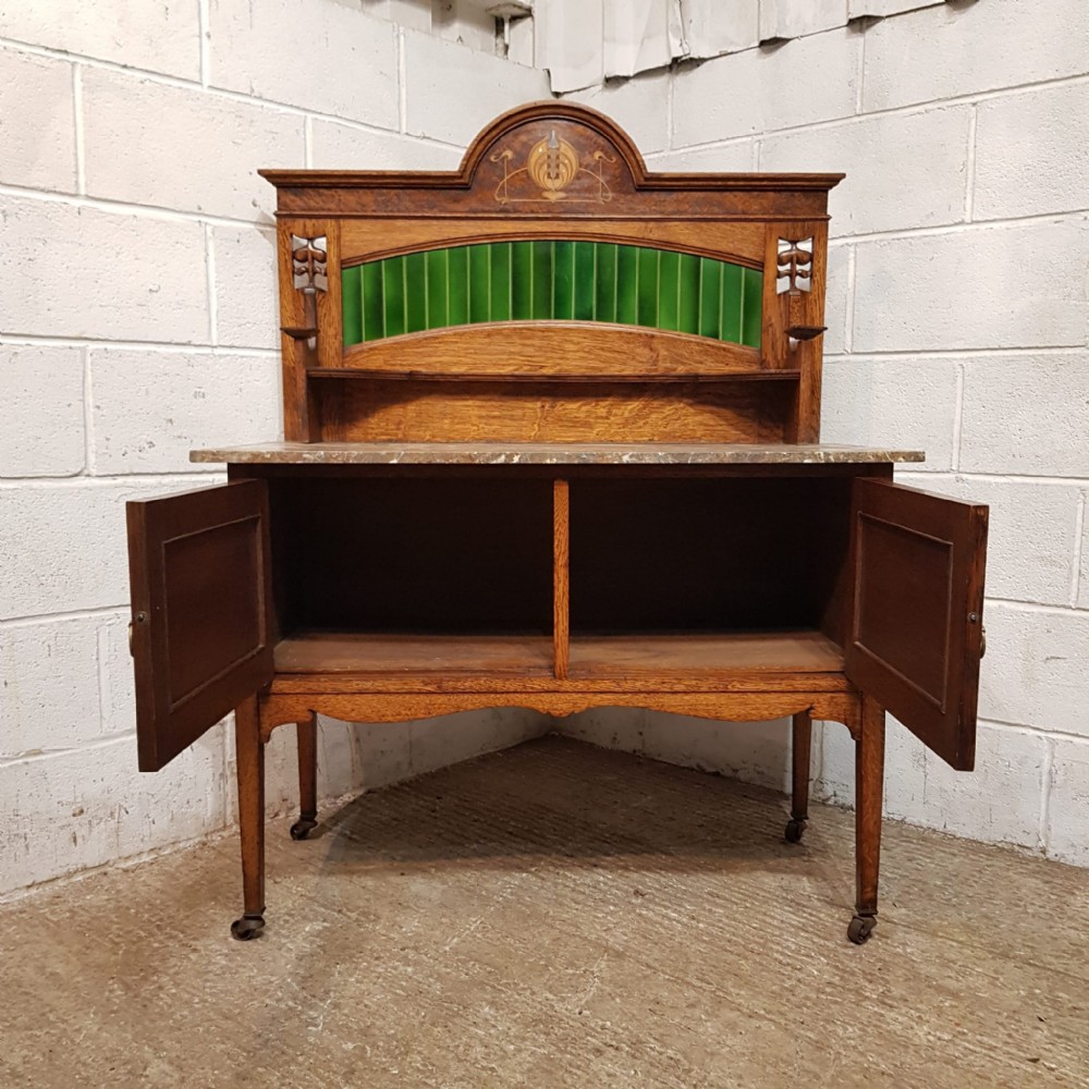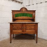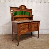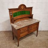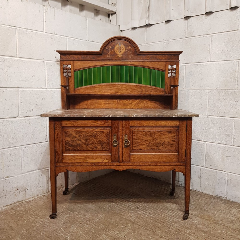 WASHSTAND: The washstand has a tiled back with the same pediment above and pierced supports to each side and a shelf with shaped ends. It has a marble top and two doors to the front both of which has a Burr Oak fielded panel and original Brass handles. It stands on square tapered legs on castors.