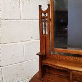 DRESSING TABLE: The dressing table has a framed mirror with the same pediment. It has pierced supports to each end with a shelf in between which has a drawer underneath. It has a moulded edge to the top with two short over two long graduating Oak lined drawers with original Brass handles and Burr Oak drawer fronts. It stands on square tapered legs on castors with a frieze in between.