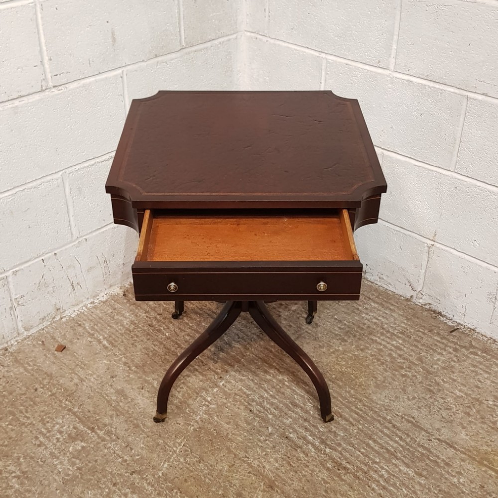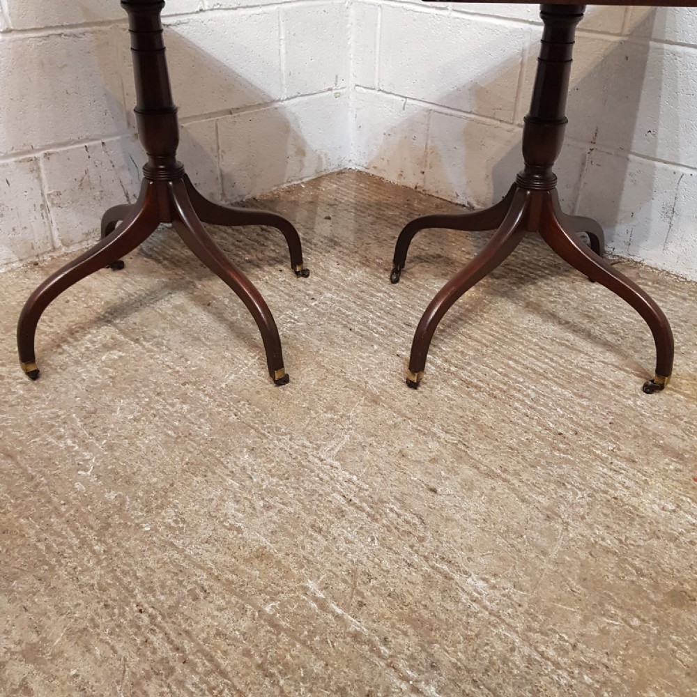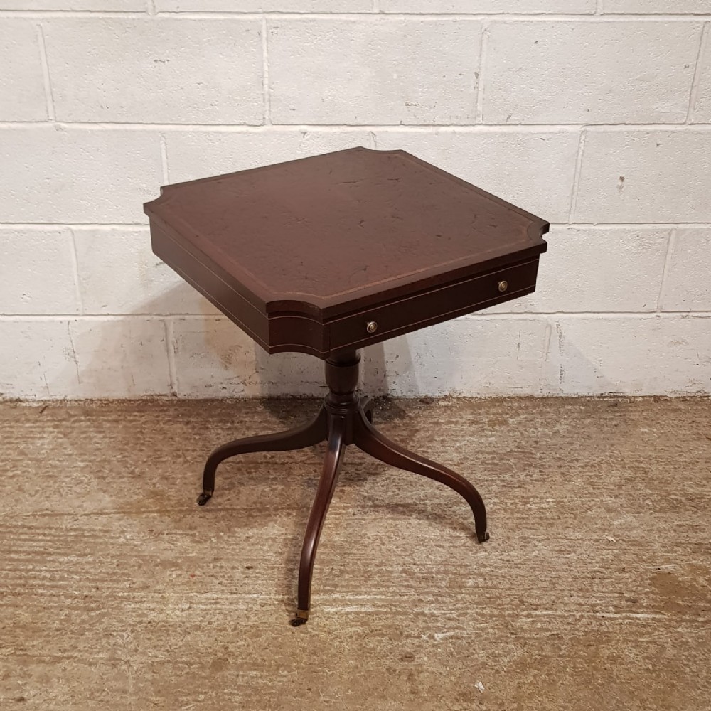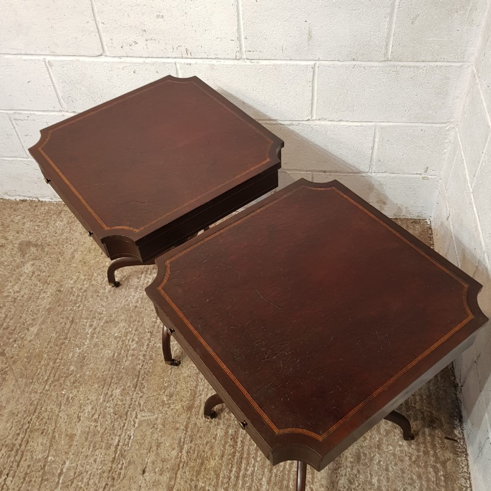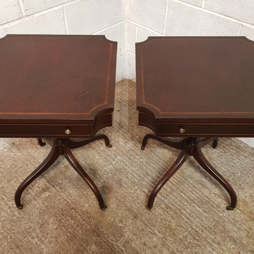 A pair of Mahogany side / bedside tables and dating from around 1920. This original pair of tables have a leather top with a gold embossed edge and a wide strung lip underneath which goes all the way around. They have a drawer to the front which are Oak lined with original Brass handles. They stand on a turned central support on four shaped legs on castors.