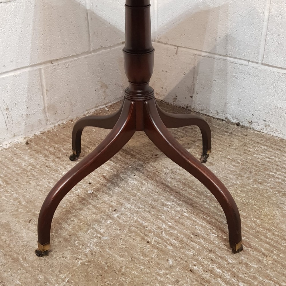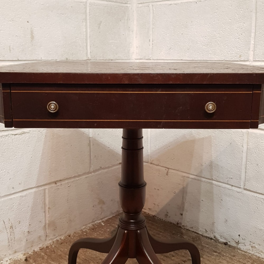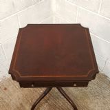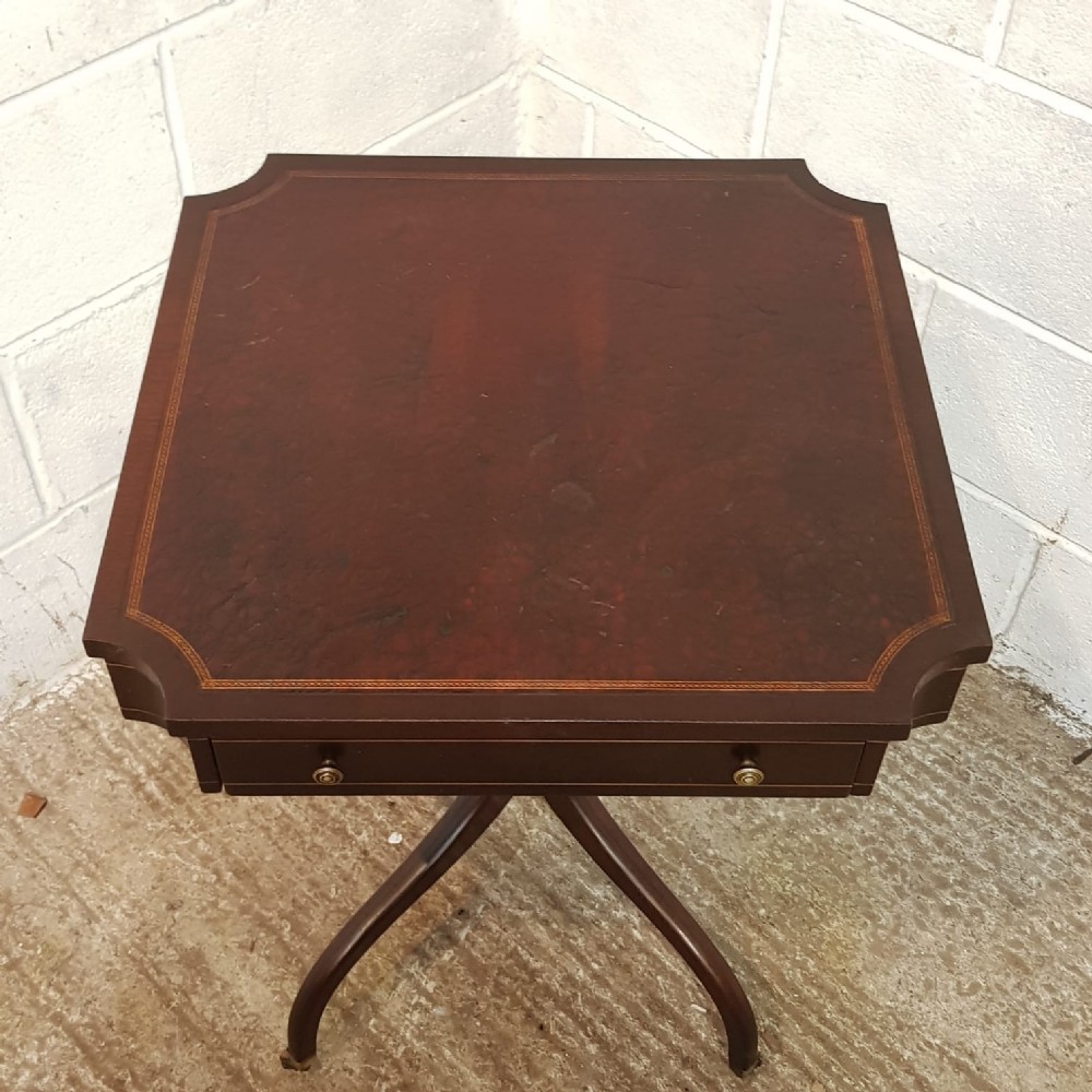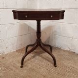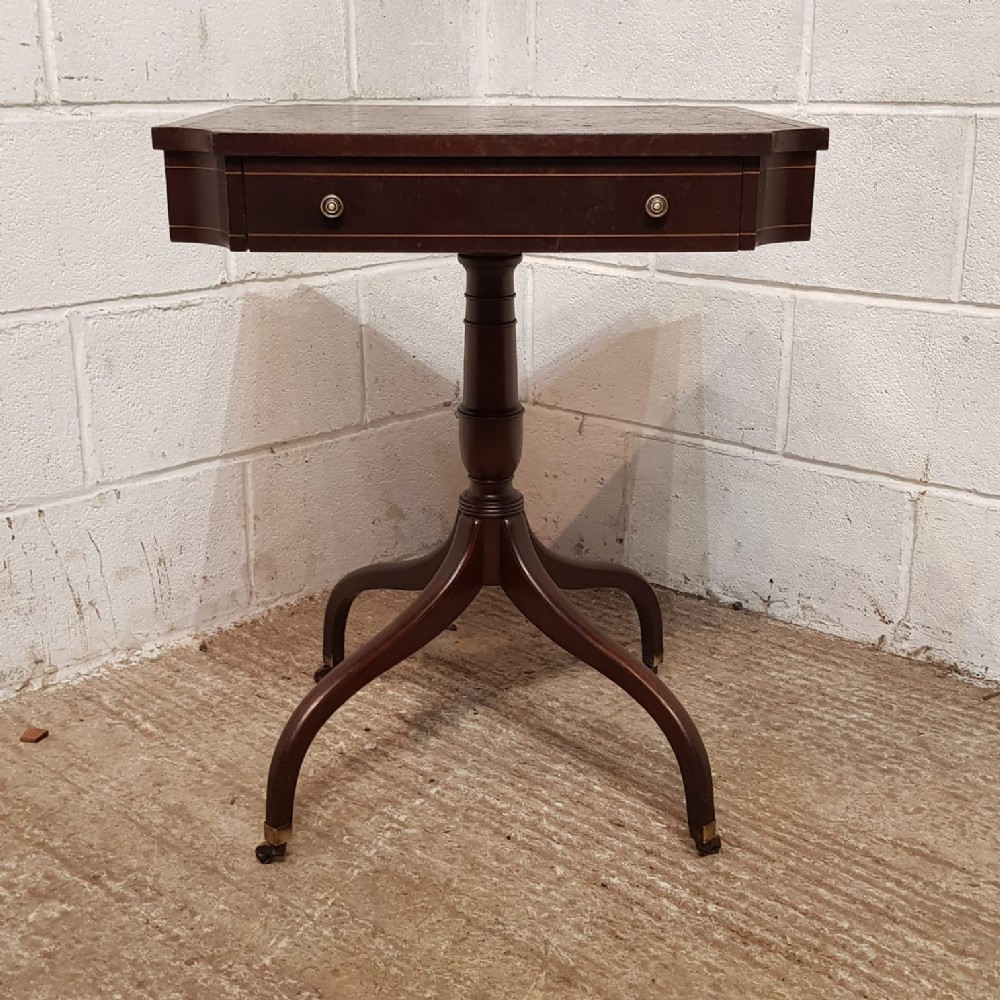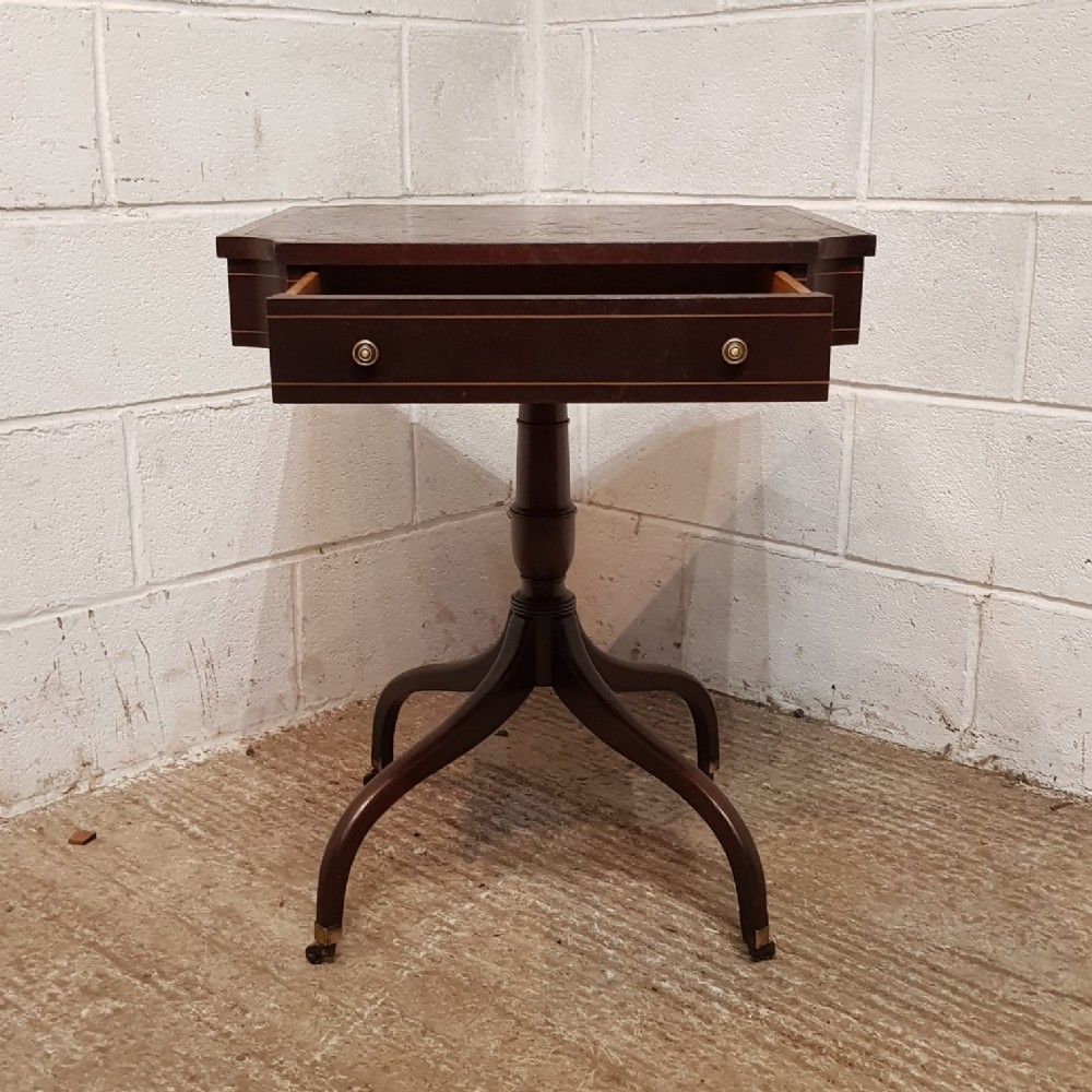 A pair of Mahogany side / bedside tables and dating from around 1920. This original pair of tables have a leather top with a gold embossed edge and a wide strung lip underneath which goes all the way around. They have a drawer to the front which are Oak lined with original Brass handles. They stand on a turned central support on four shaped legs on castors.