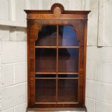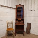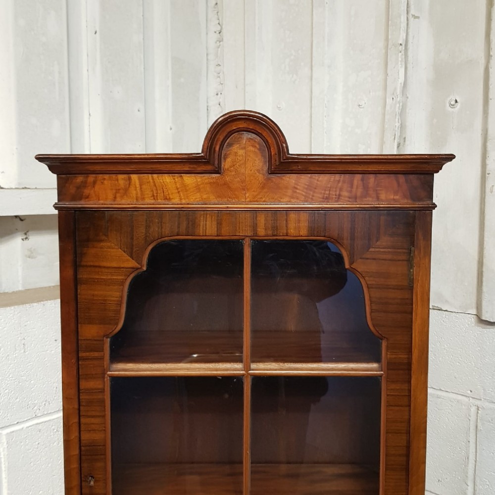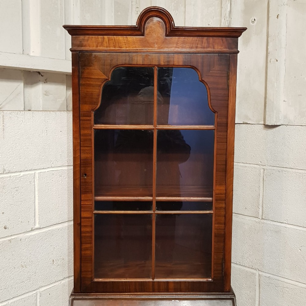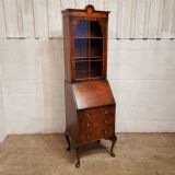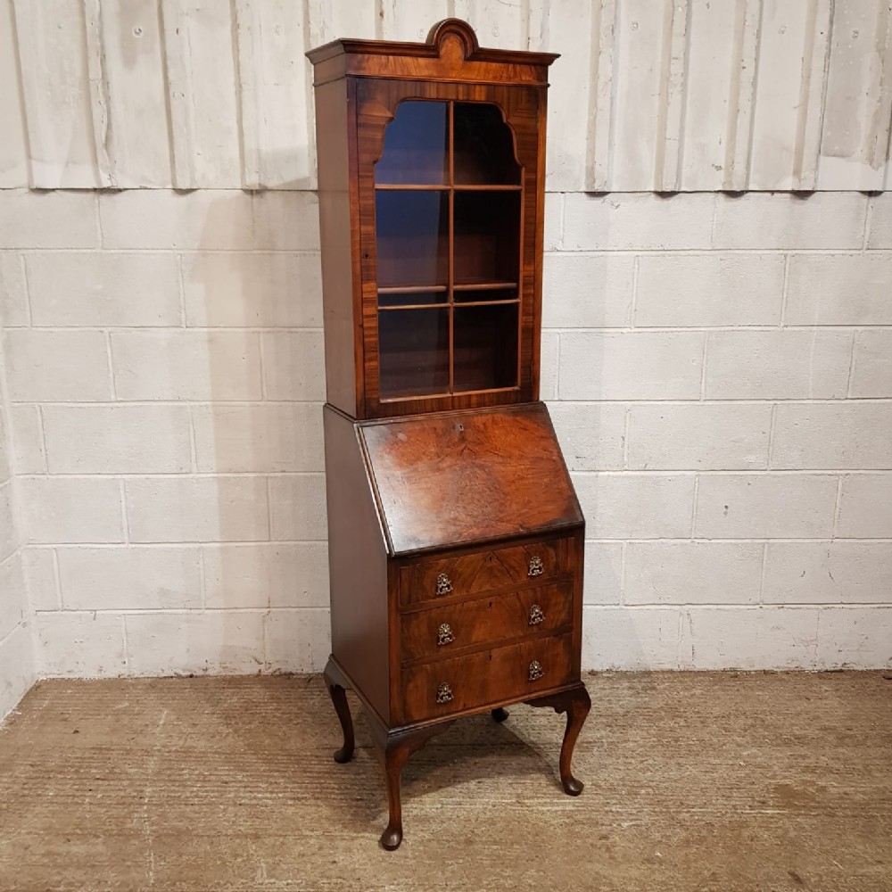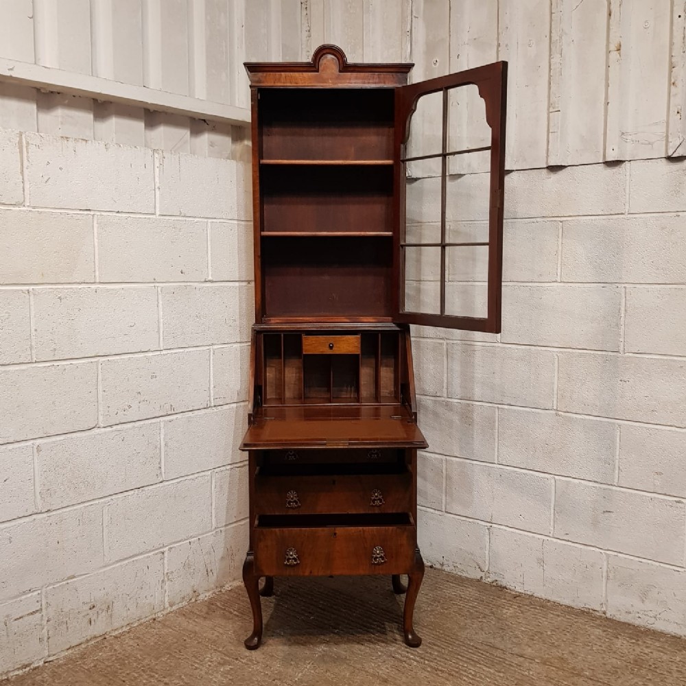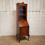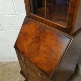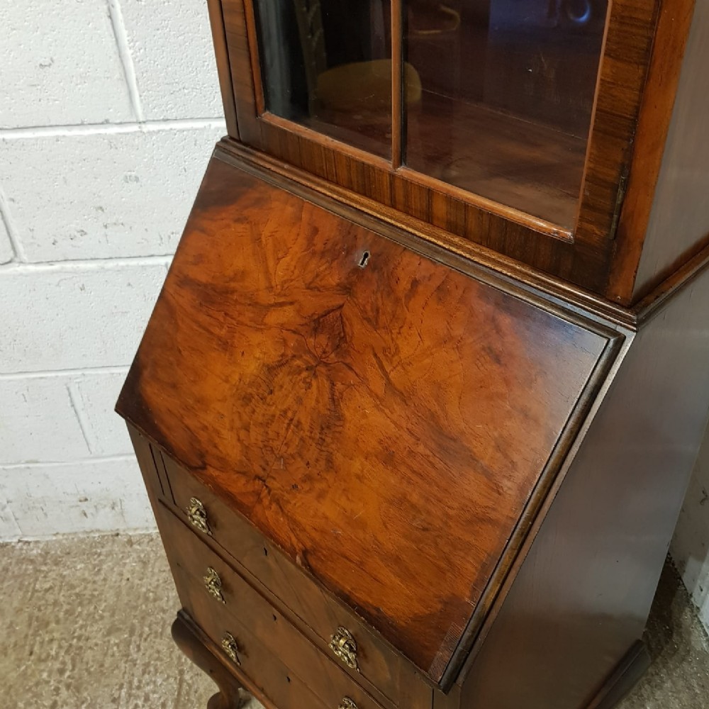 A Burr Walnut tall narrow Bereau bookcase and dating from around 1920. This beareau / bookcase has a moulded cornice with a wide lip underneath and a small pedament above. It features a single glazed door with two adjustable shelves inside. Under this is the fall front of the desk of which, inside is a drawer , assorted pigeon holes and a leather writing surface. It then has three long graduated drawers all of which are Mahogany lined with original Brass handles. It is moulded around the bottom and stands on cabriole legs. The top lifts off the base for ease of movement.