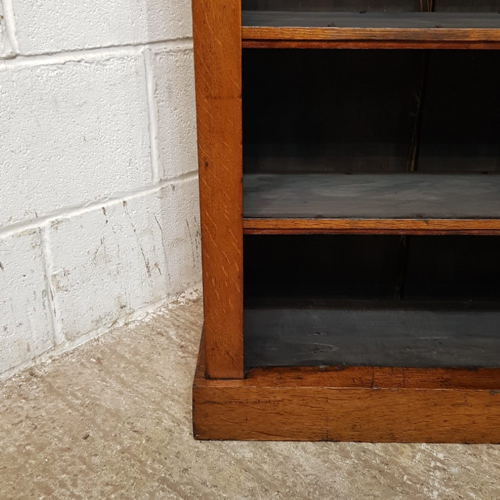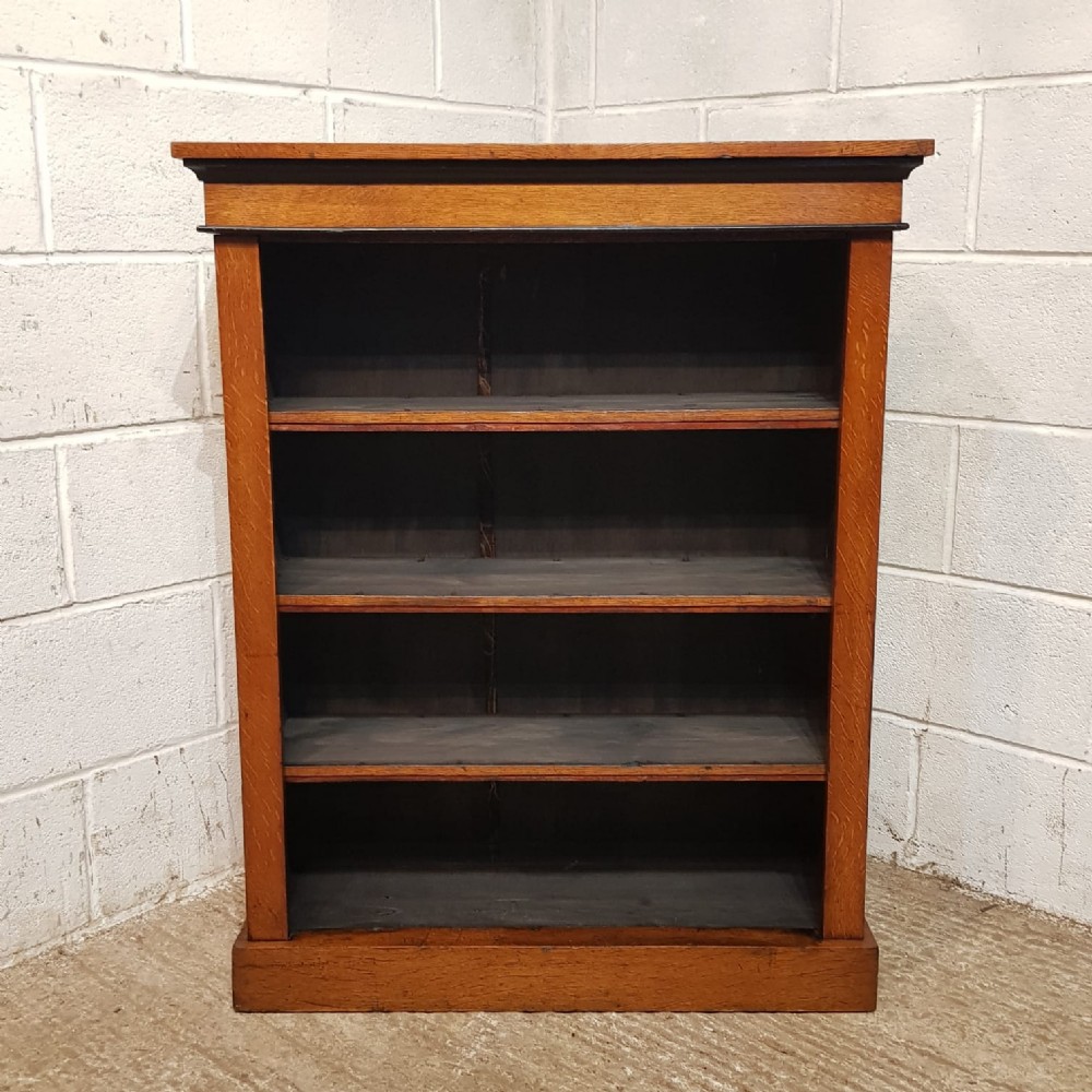 An antique small medium Oak open bookcase and dating from around 1900. This bookcase has a square edge to the top with a wide lip underneath which has an embossed moulded bottom edge. It has three original shelves and it stands on a plinth base.
