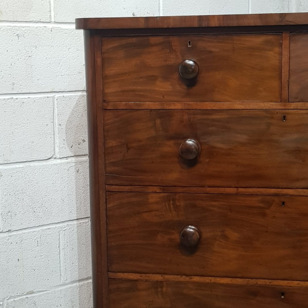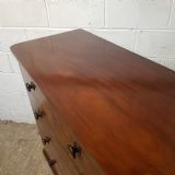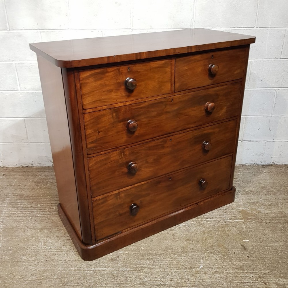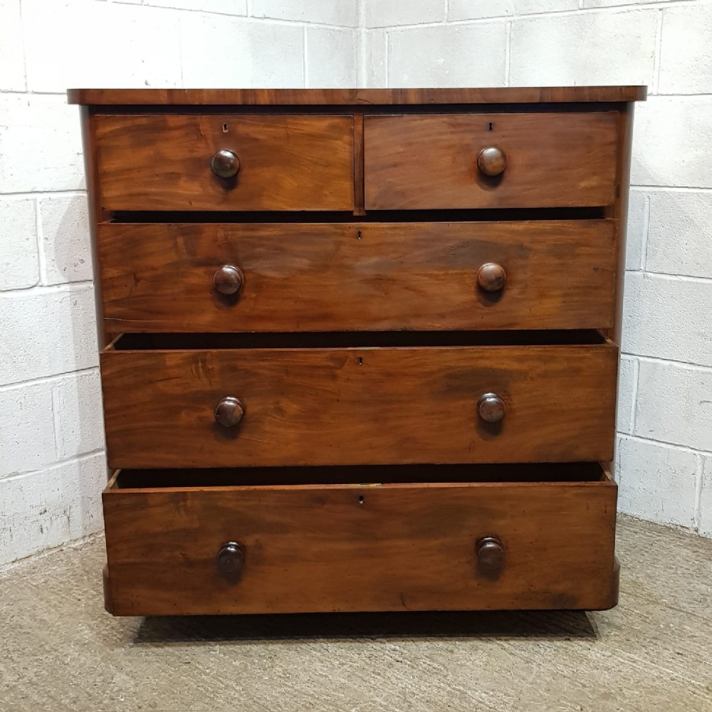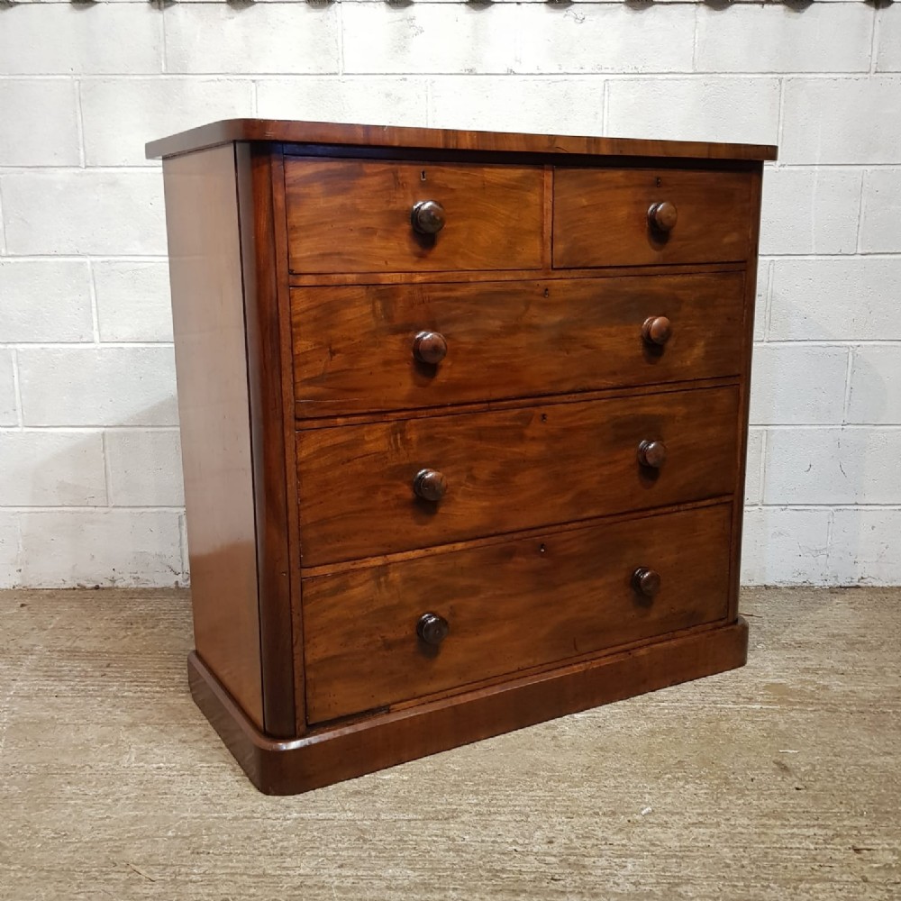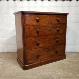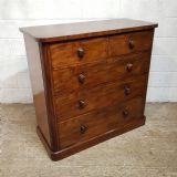 A Victorian Mahogany 4 height chest of drawers and dating from around 1860. This chest of drawers is of extremely good quality and has a square edge to the top with two short drawers over three long graduating drawers all of which are Oak lined with original knob handles. The chest has rounded corners and stands on a plinth and is of high quality.