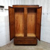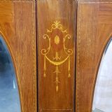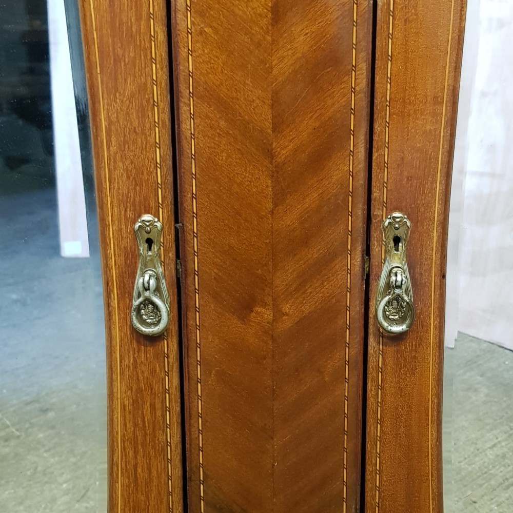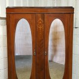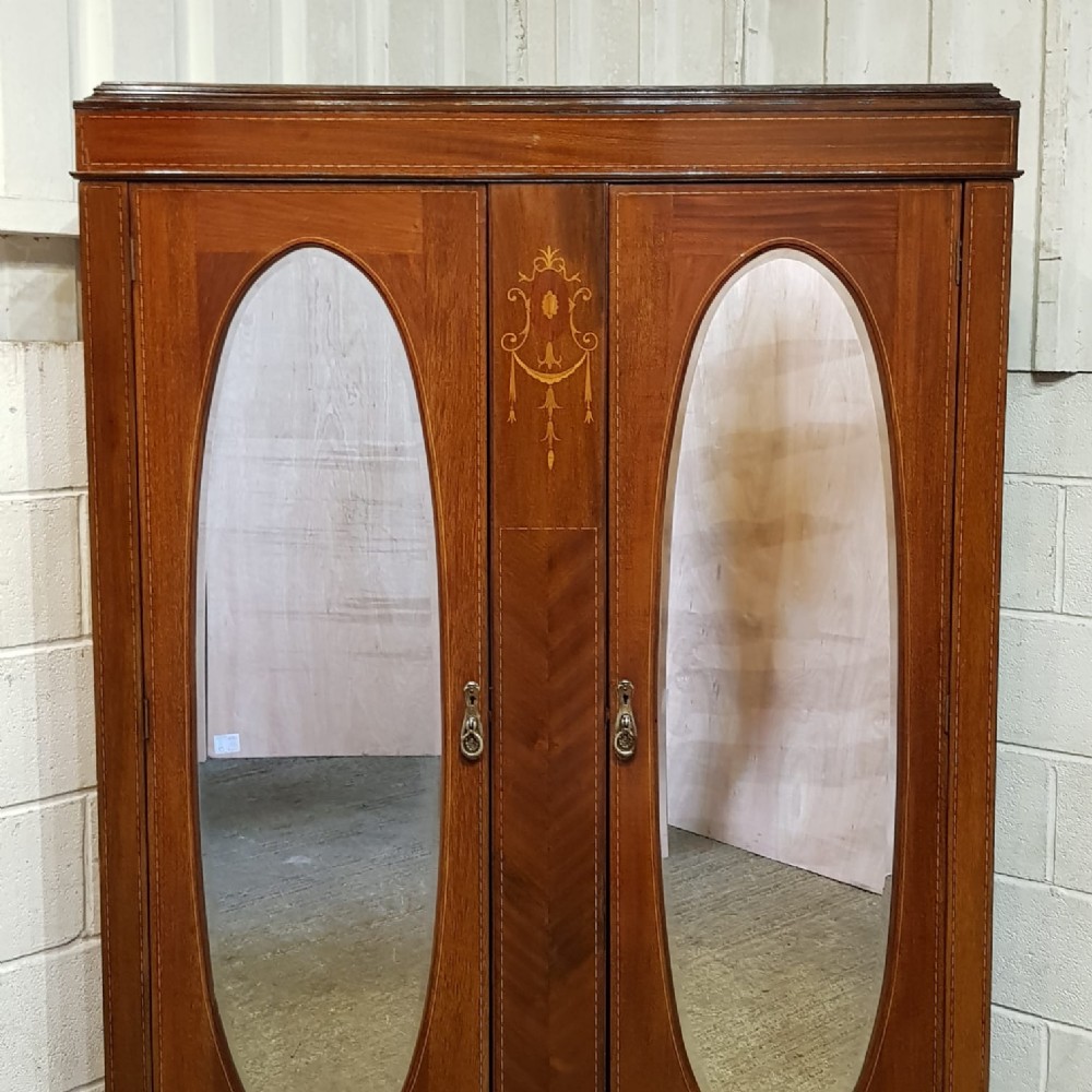 An Edwardian Mahogany double wardrobe and dating from around 1900. This wardrobe has a moulded caddy cornice with satin wood strung lip underneath. It has two mirrored doors in satin wood strung door frames with original handles. Between the doors is an inlaid and strung panel. The base has a deep Oak lined drawer with original handles satin wood strung drawer front and it stands on bracket feet and separates for ease of movement.