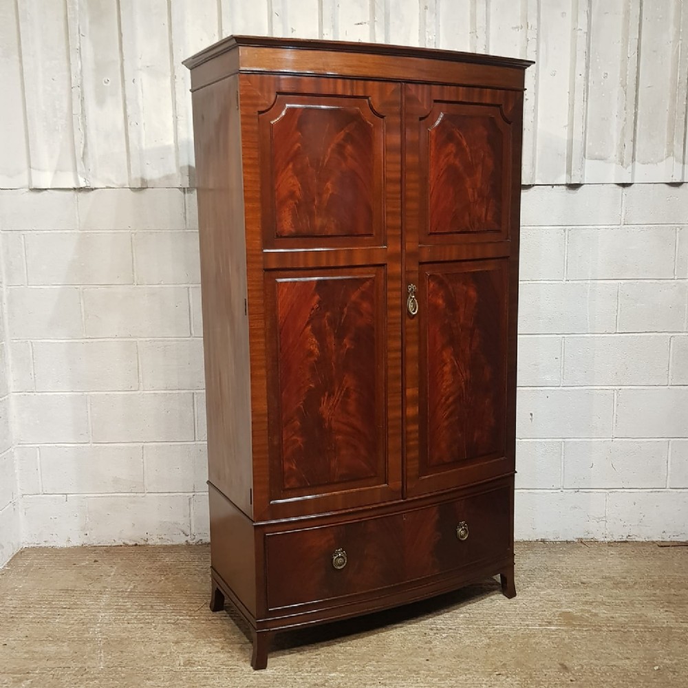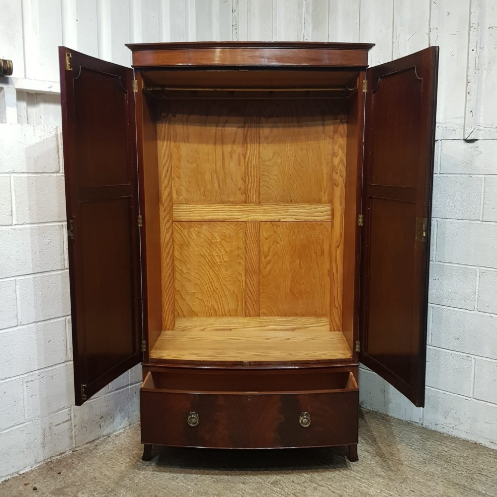 An Edwardian Mahogany bow fronted wardrobe and dating from around 1900. This fully original wardrobe has a moulded cornice with a wide lip underneath. It features two doors to the front both of which have two fielded panels with original brass handle and key. Inside is a rail and the base has a long Oak lined deep drawer with original brass handles. It is moulded around the bottom and stands on spayed bracket feet. It separates into five pieces for ease of movement.