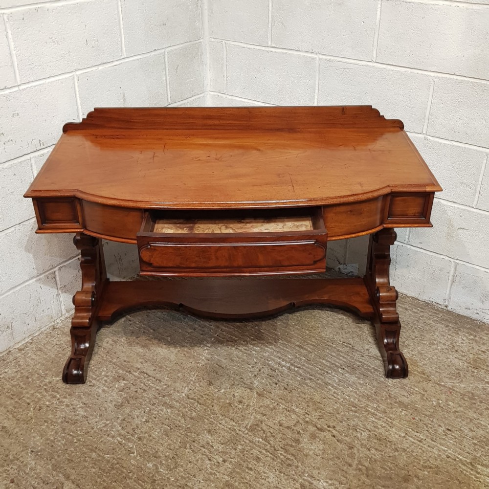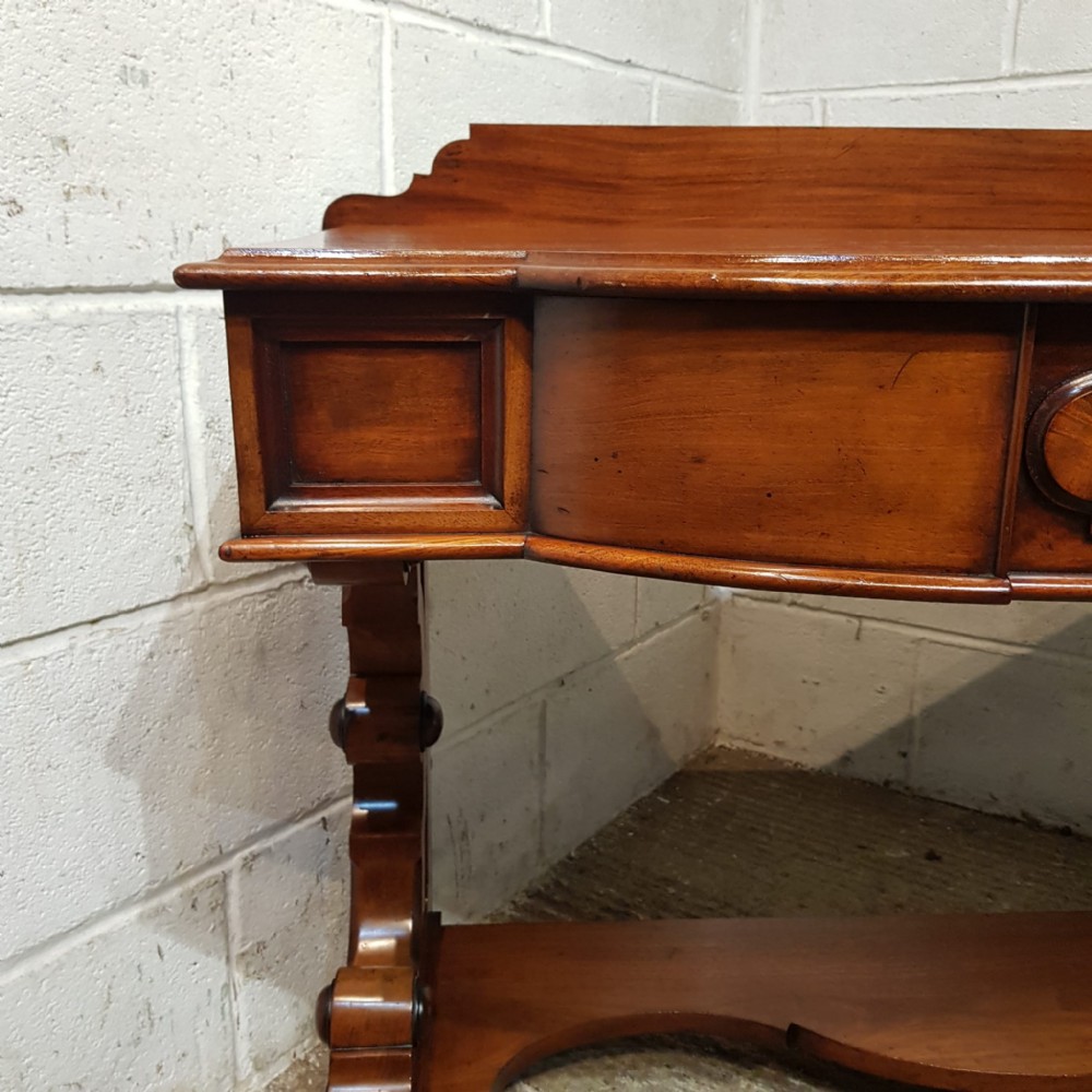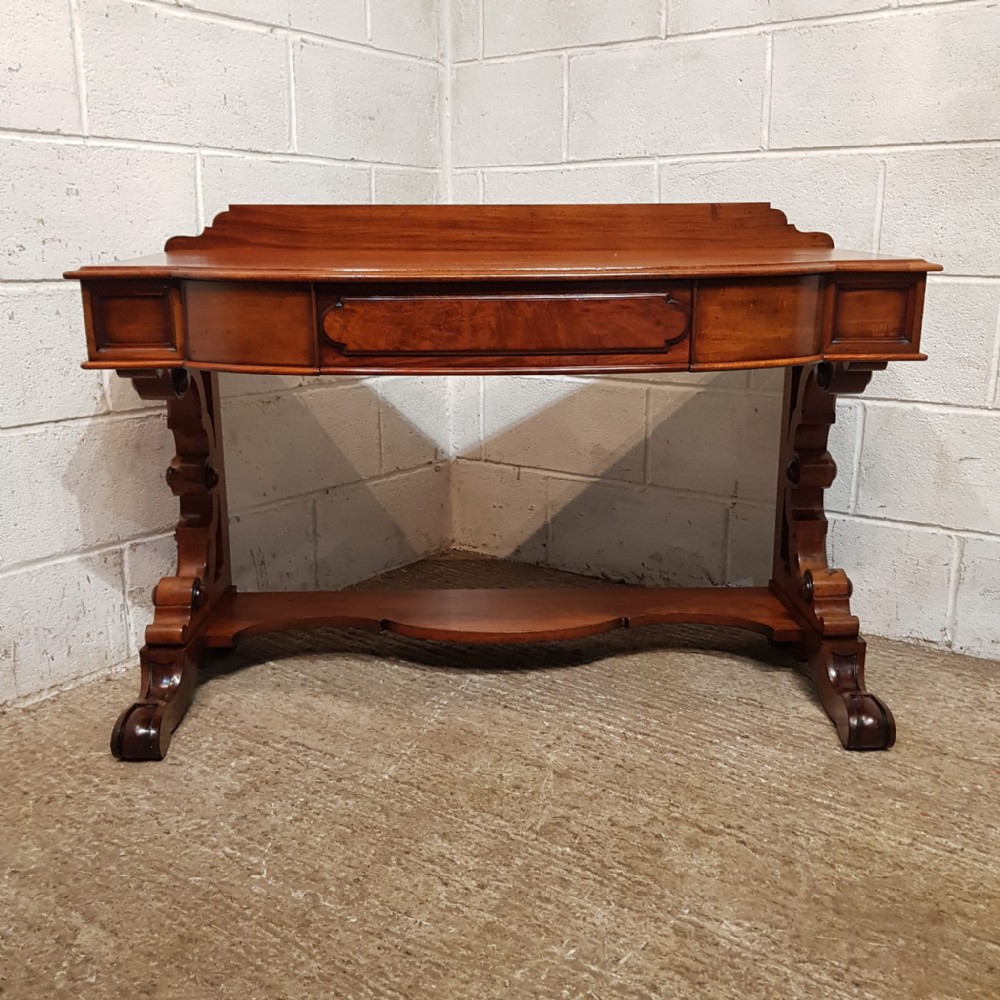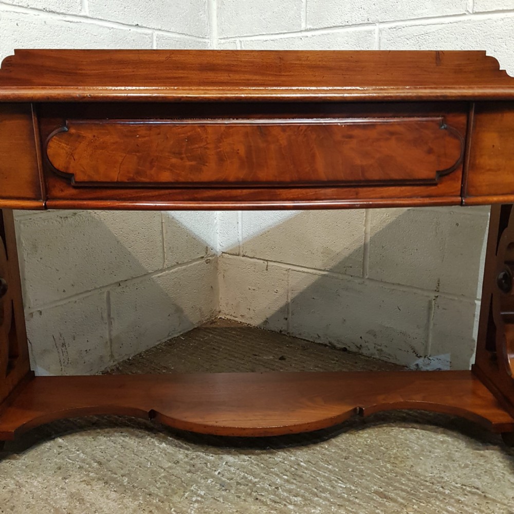 A Victorian Mahogany console table and dating from around 1880. This beautiful console table has a low gallery back and a moulded edge to the top. It is serpentine fronted with a wide lip underneath and it has a Mahogany lined frieze drawer to the centre and the drawer front is moulded as well. It has pierced and carved supports to each end and stands on a carved foot with a shaped shelf across the bottom.
