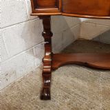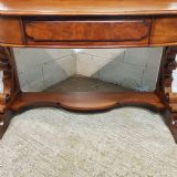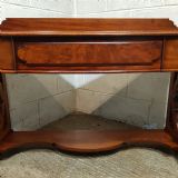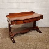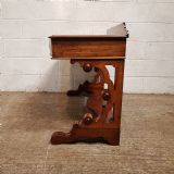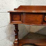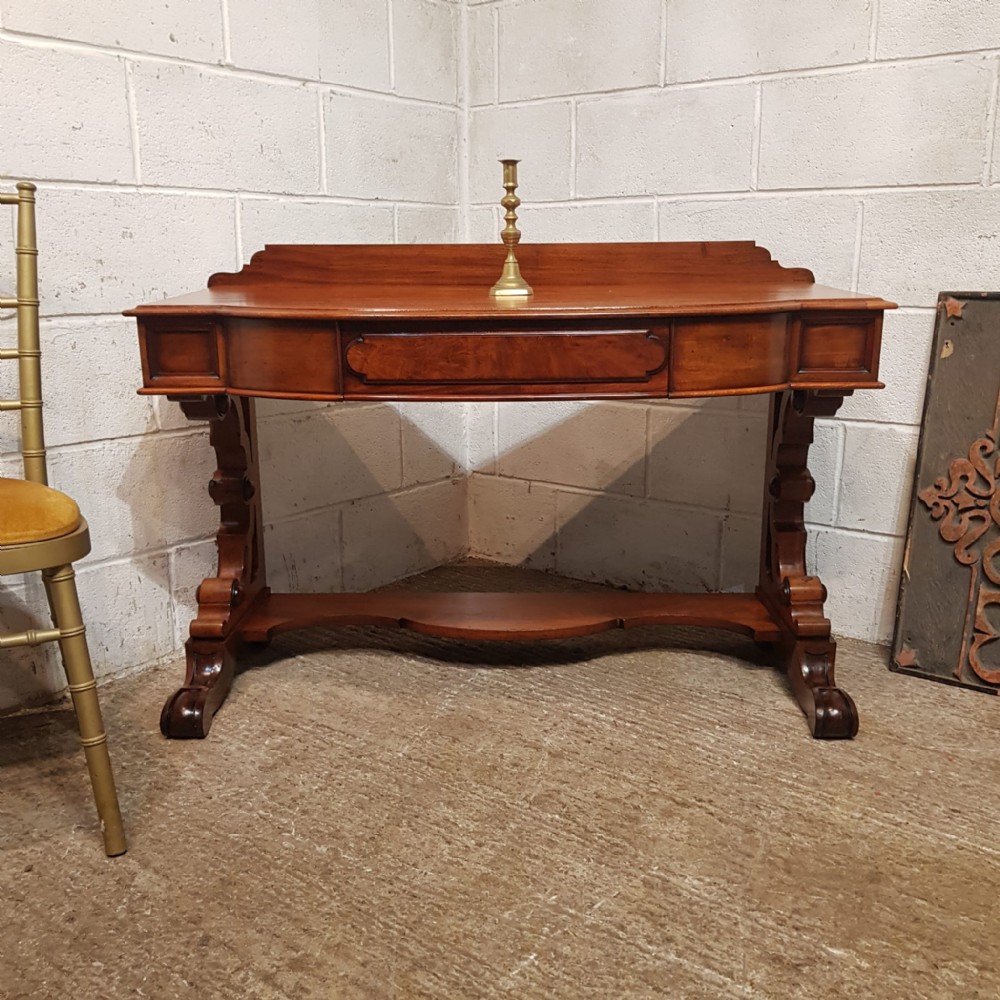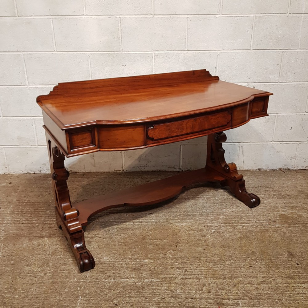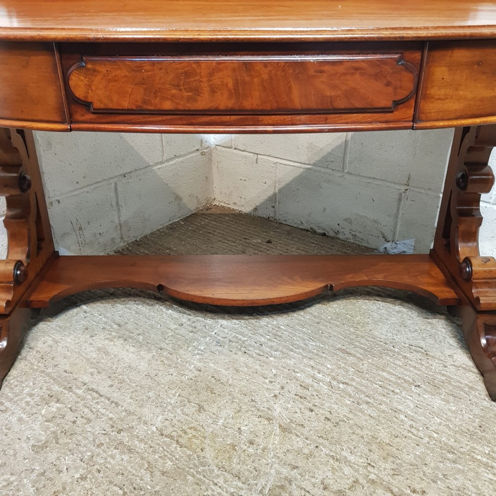 A Victorian Mahogany console table and dating from around 1880. This beautiful console table has a low gallery back and a moulded edge to the top. It is serpentine fronted with a wide lip underneath and it has a Mahogany lined frieze drawer to the centre and the drawer front is moulded as well. It has pierced and carved supports to each end and stands on a carved foot with a shaped shelf across the bottom.