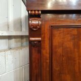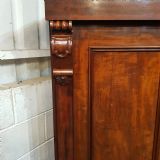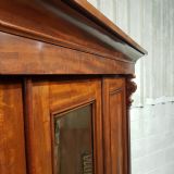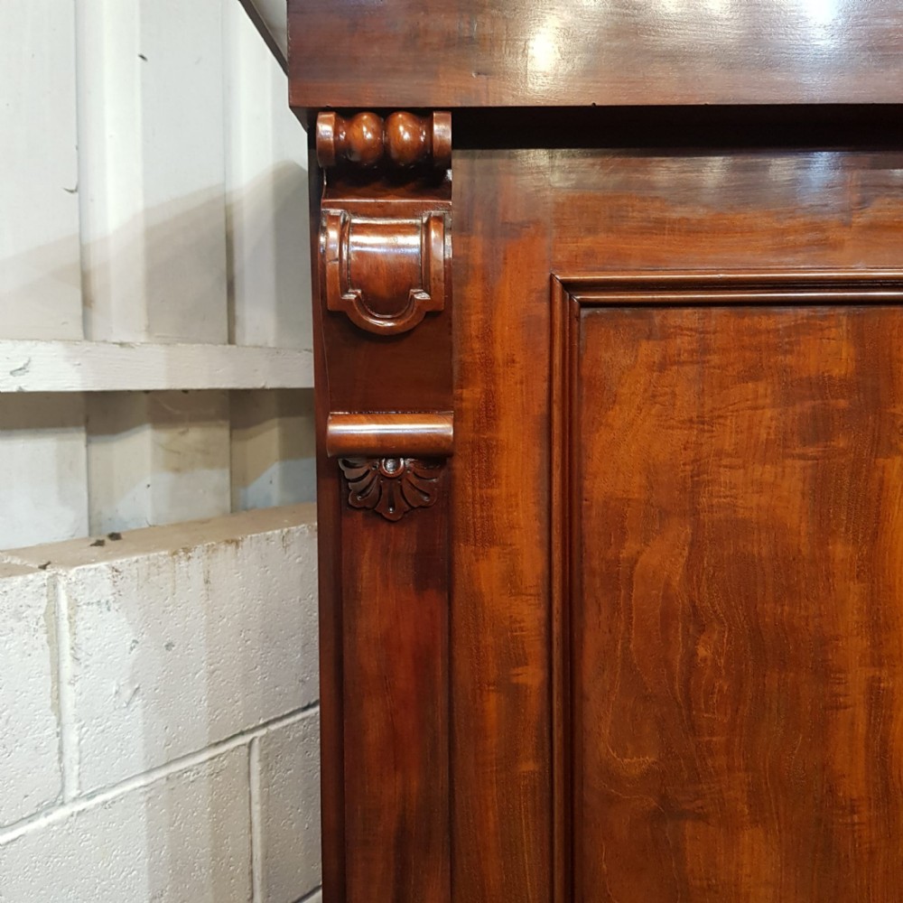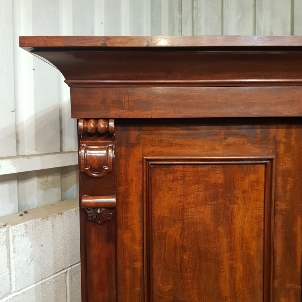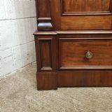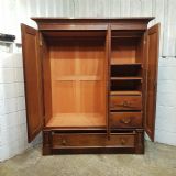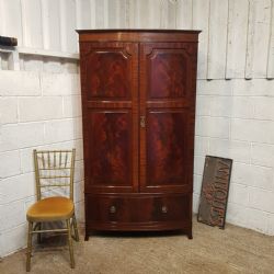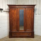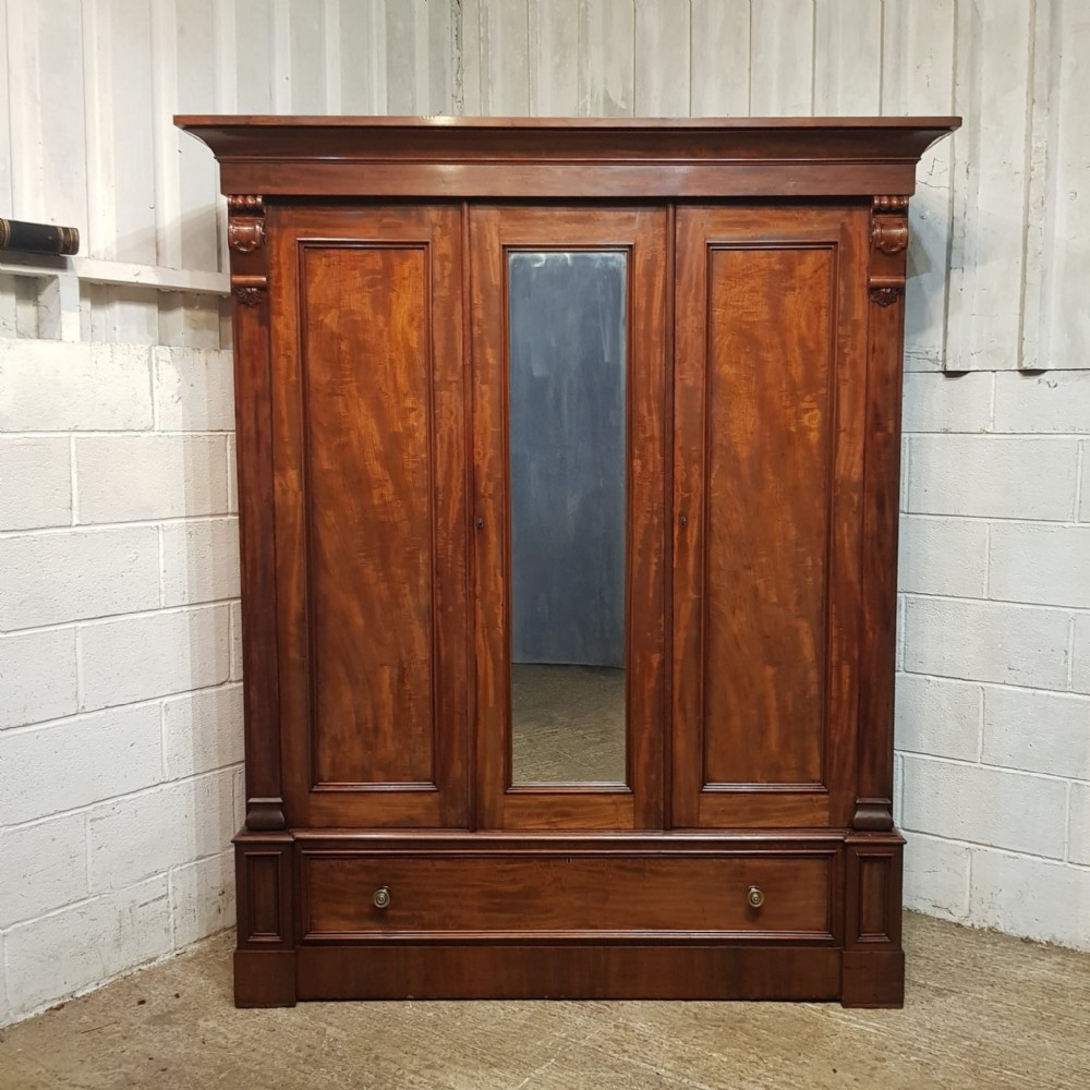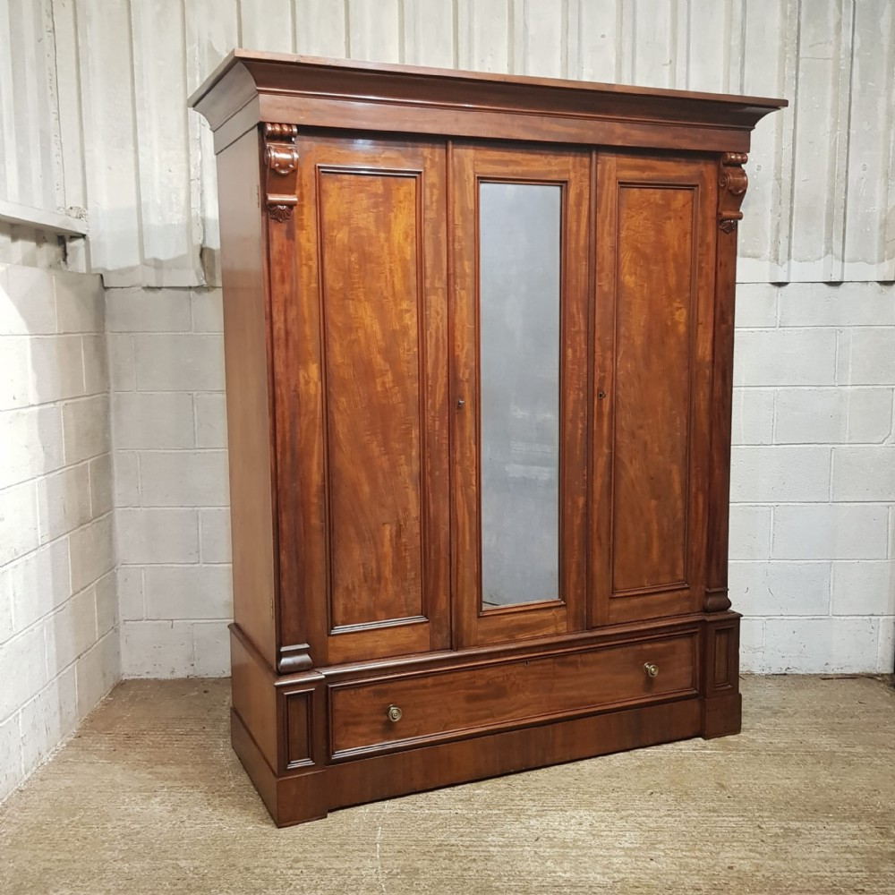 A William 4th Mahogany triple wardrobe and dating from around 1830. This original wardrobe has a moulded cornice with a lip underneath and a central mirrored door with a key. The doors to both ends have a long moulded panel and a key. To each end under the cornice is a carved corbal. Inside on the right is a hanging rail with two removable shelves under of which is two drawers. Behind the left and centre door is a hanging rail. The base has a long deep drawer with original brass knobs with a moulded edge to the drawer fronts. To each end of the base is a small moulded panel and it stands on a plinth base. The wardrobe separates into six pieces for ease of movement.