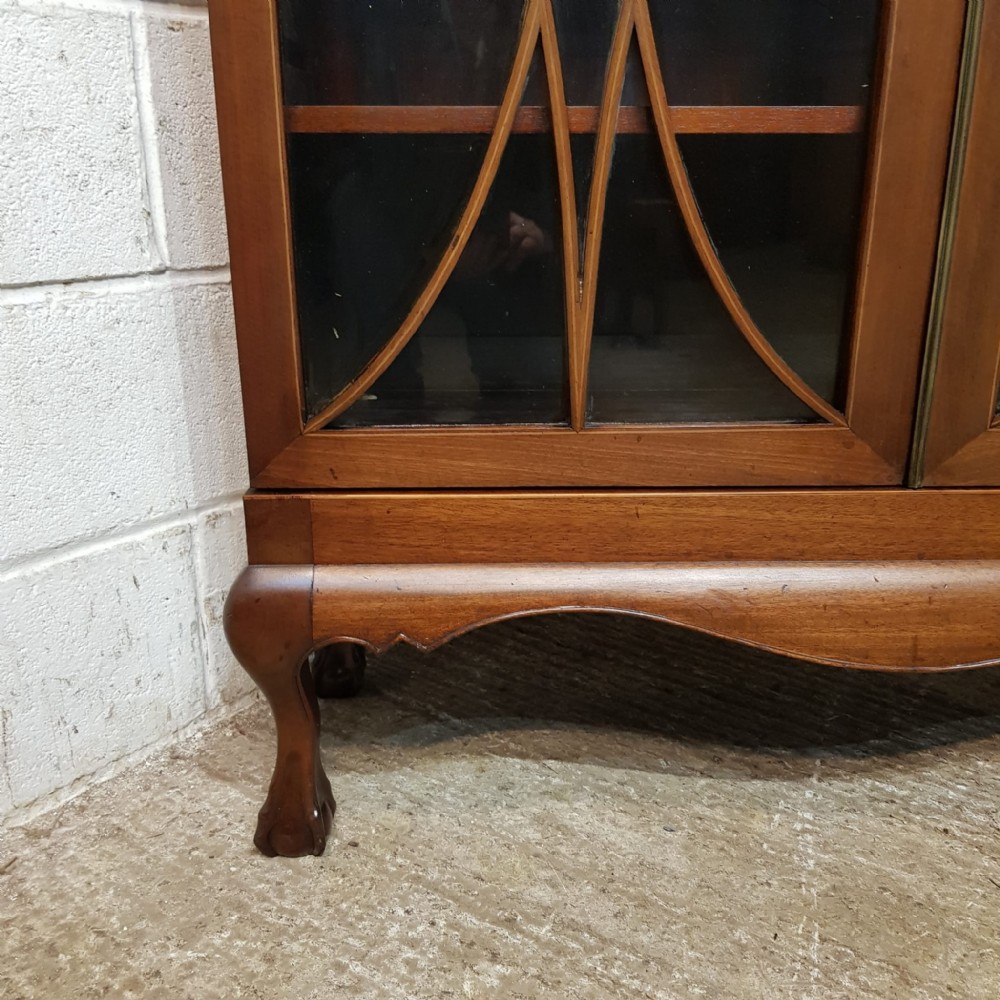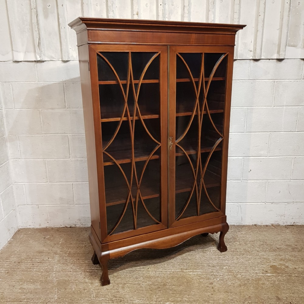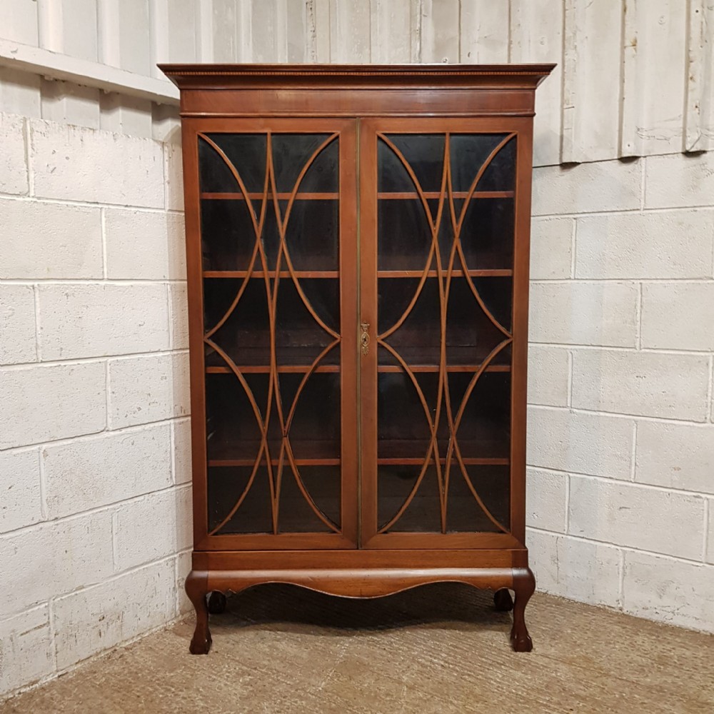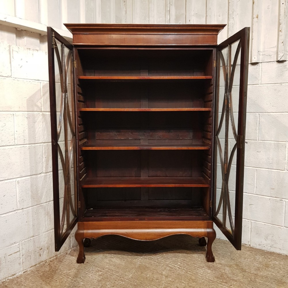 An Edwardian Mahogany astragal glazed bookcase on stand and dating from around 1900. This original bookcase has a flared moulded cornice with inlaid dental moulding and a wide strung lip underneath. Two astragal glazed doors with brass handles and key and four fully original and adjustable shelves inside. It stands on a plinth base on cabriole legs on claw and ball feet with a shaped frieze inbetween.