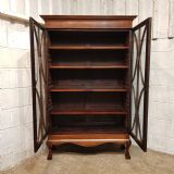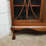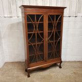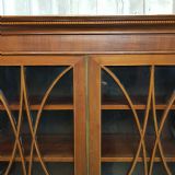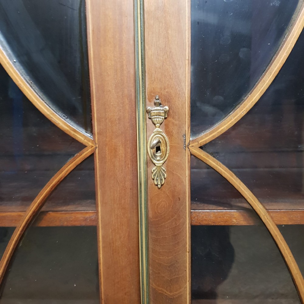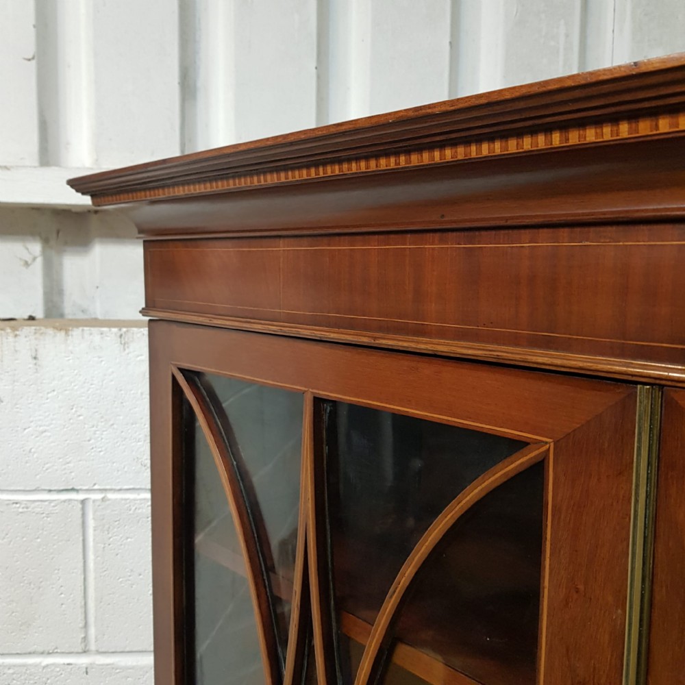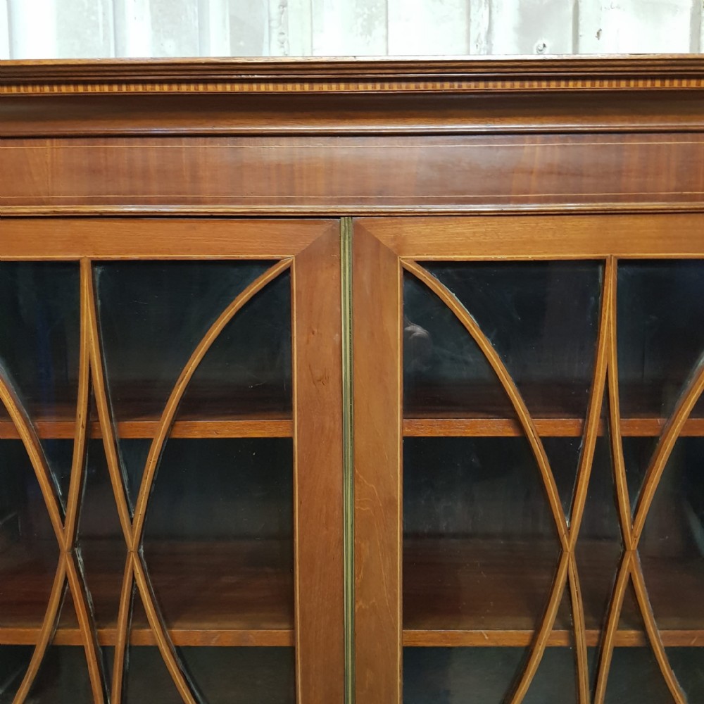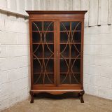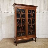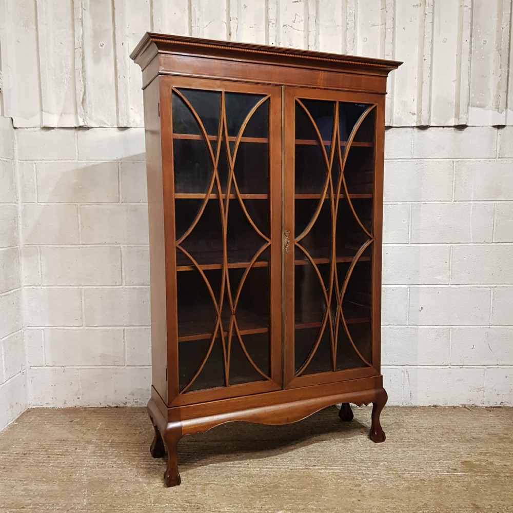 An Edwardian Mahogany astragal glazed bookcase on stand and dating from around 1900. This original bookcase has a flared moulded cornice with inlaid dental moulding and a wide strung lip underneath. Two astragal glazed doors with brass handles and key and four fully original and adjustable shelves inside. It stands on a plinth base on cabriole legs on claw and ball feet with a shaped frieze inbetween.