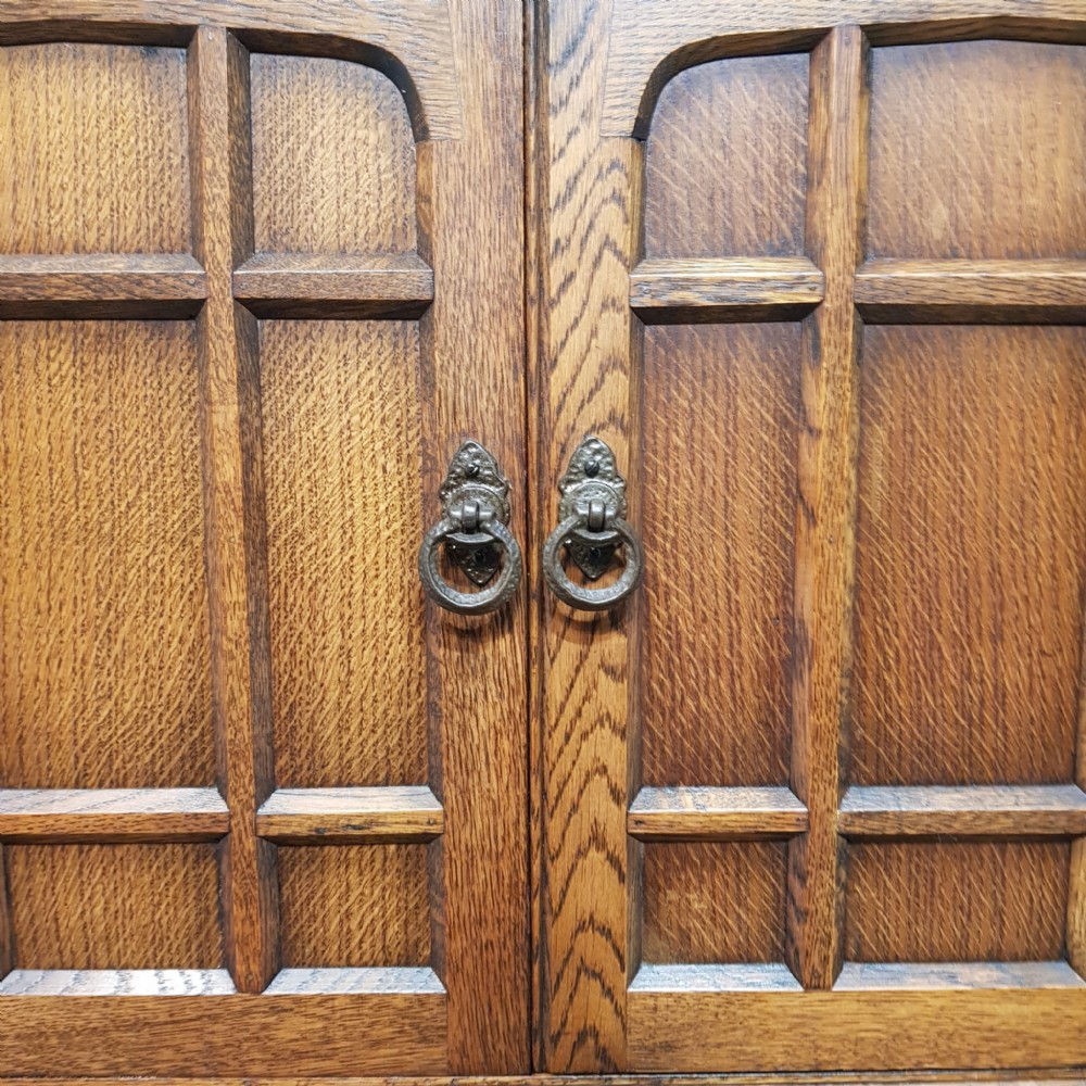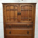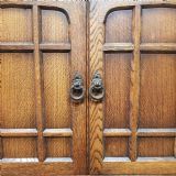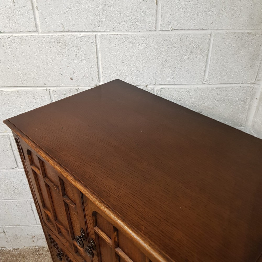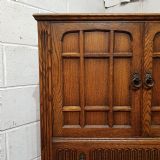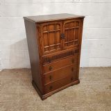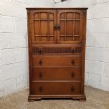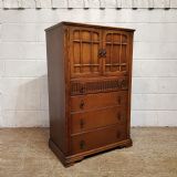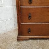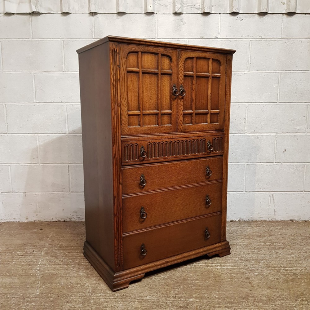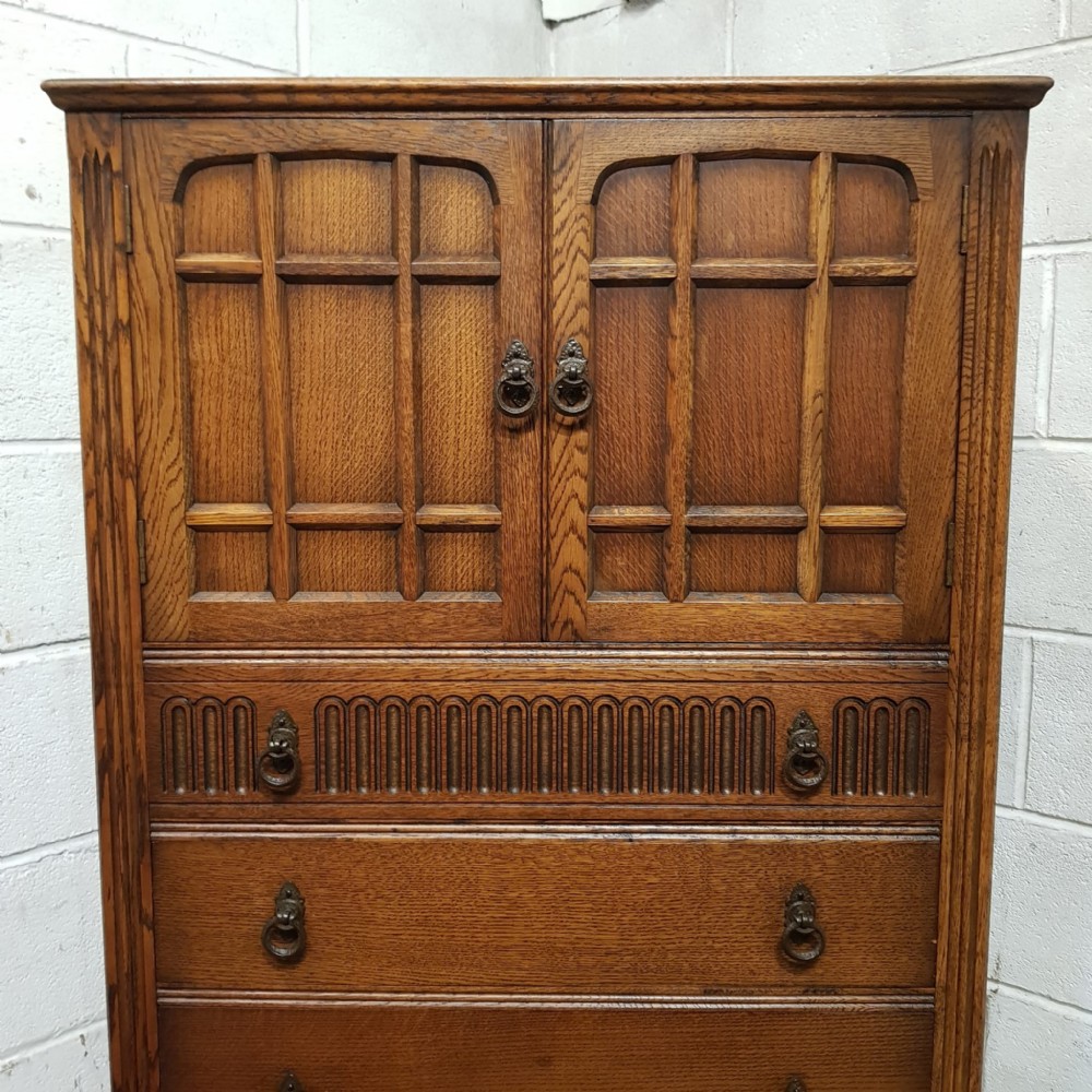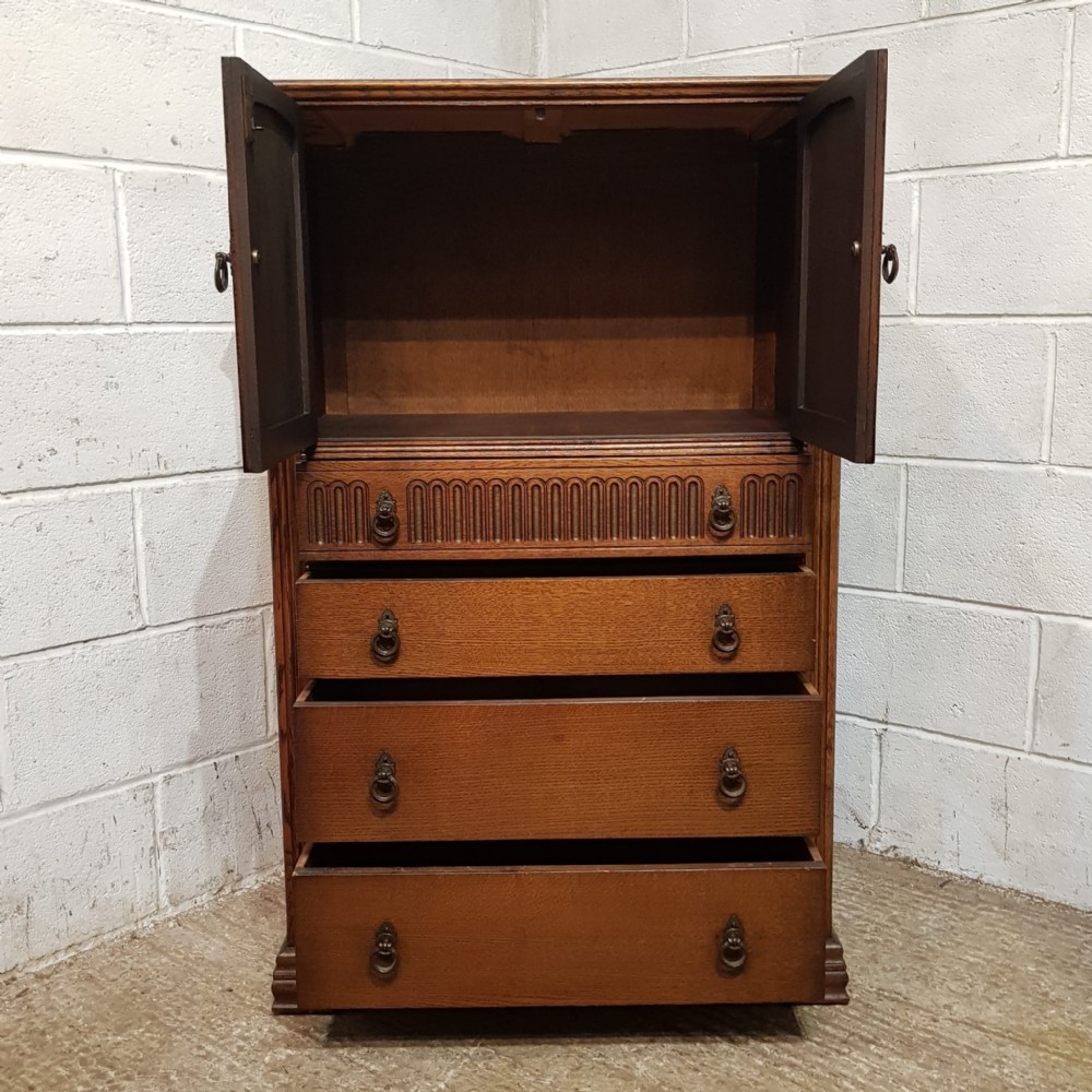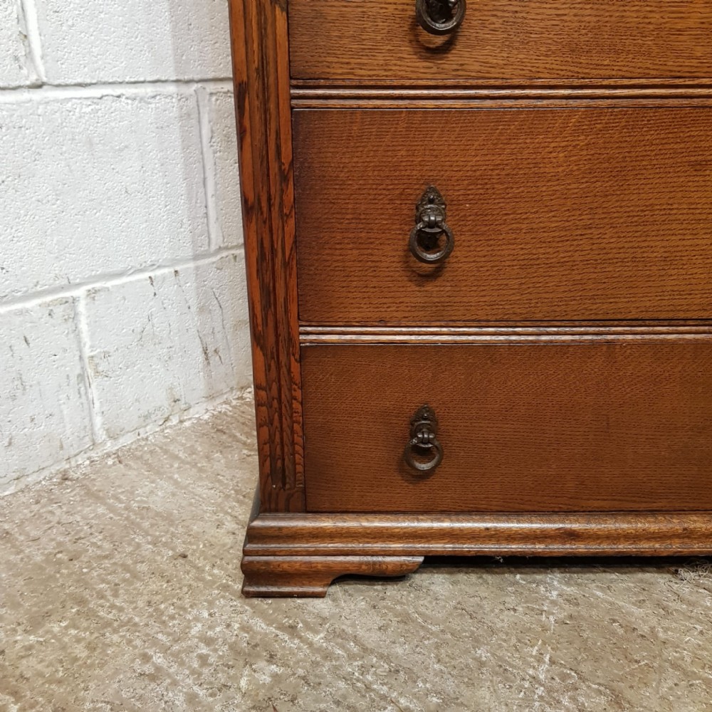 An Oak Tallboy and dating from around 1920. This lovely Tallboy has a moulded edge to the top with two doors underneath, each of which has a moulded panel and Iron handles. Following this are four long graduated drawers all of which are Oak lined with Iron handles. The top drawer has a moulded drawer front and it is moulded down each side. It stands on a moulded plinth on bracket feet.