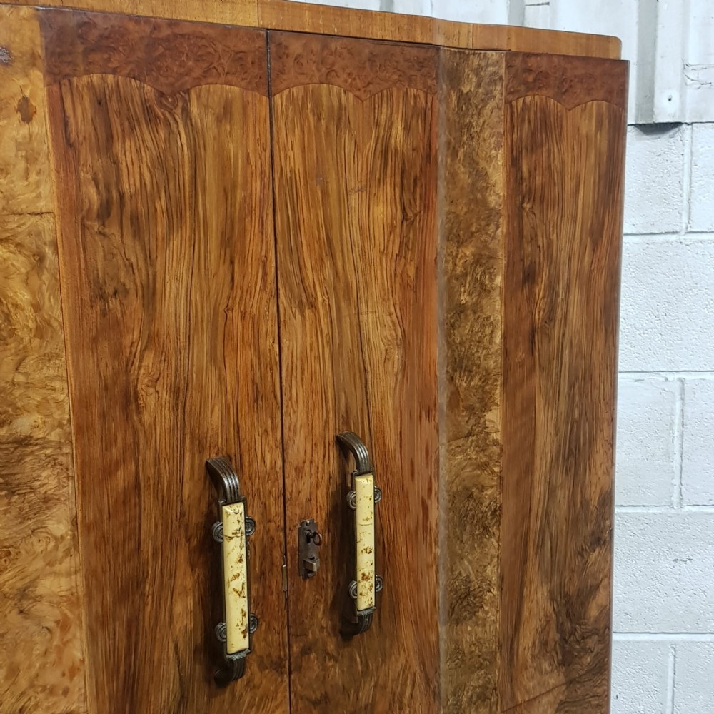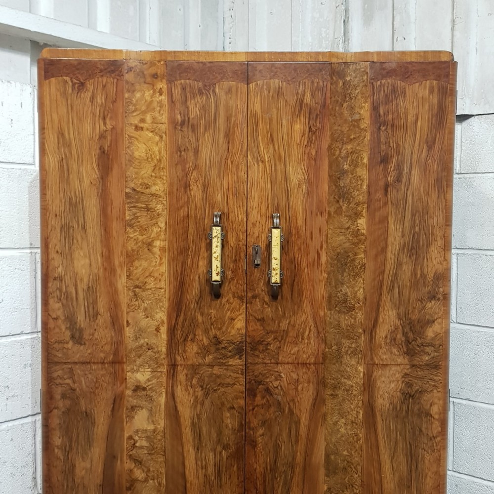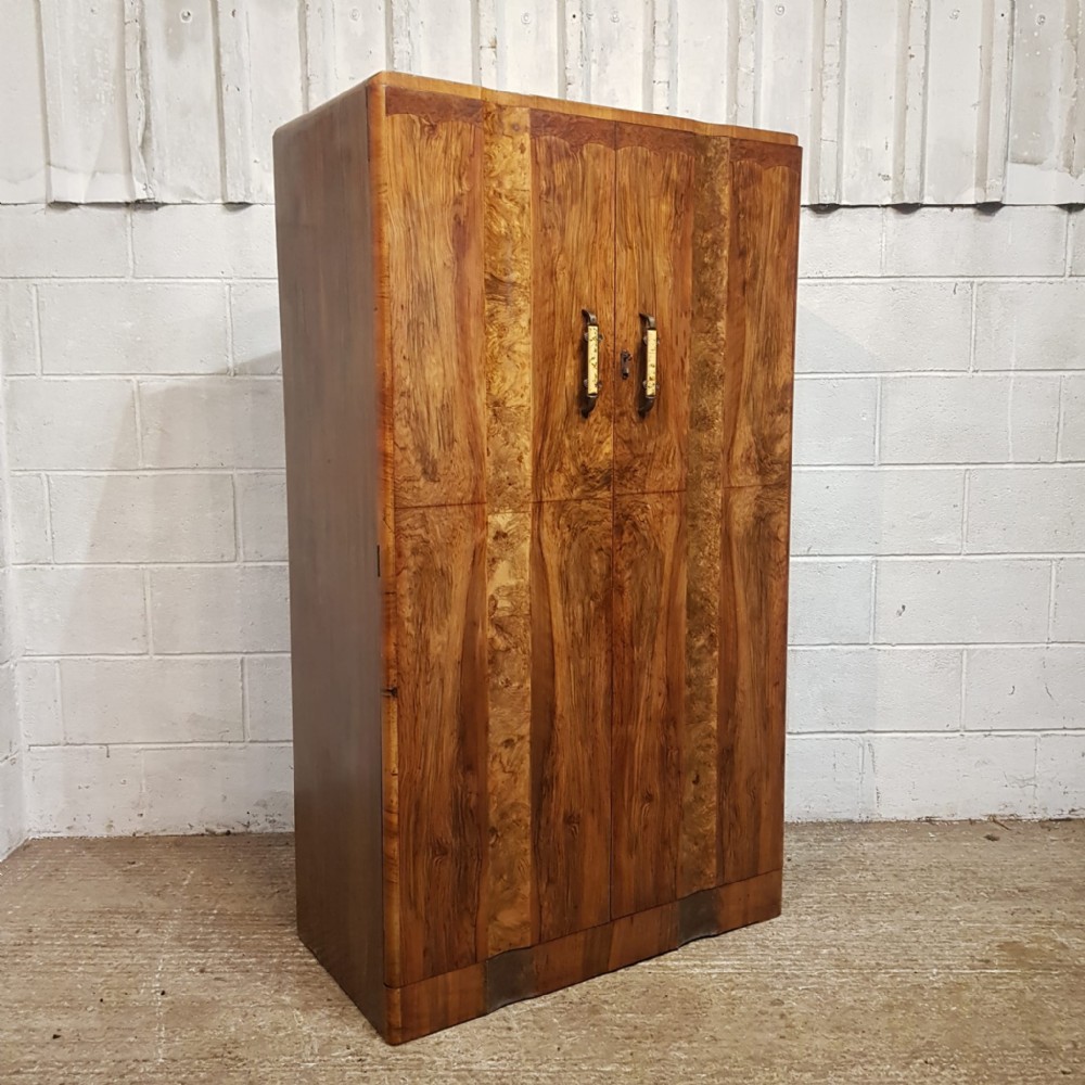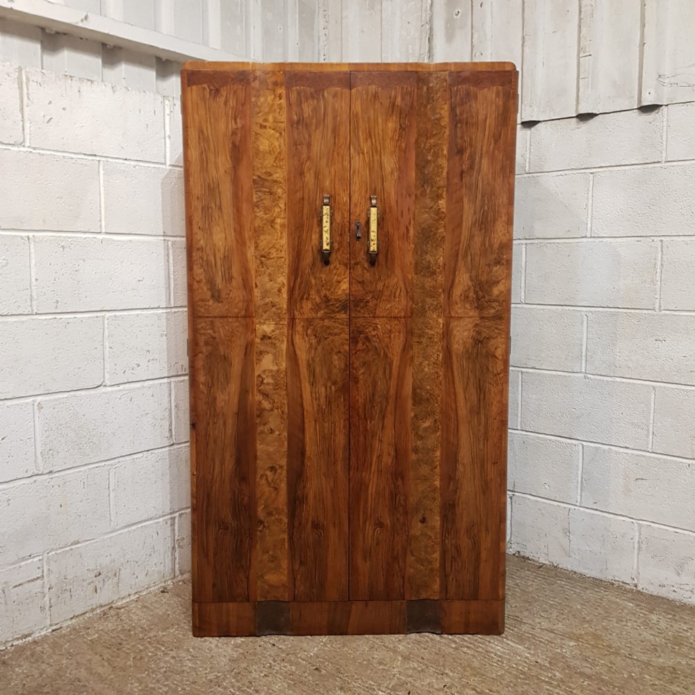 An Art Deco Burr Walnut small fitted wardrobe and dating from around 1920. This original Art Deco wardrobe has a square edge to the top with two serpentine shaped doors with original handles and escutcheons with a key. Inside is a hanging rail with shelves on the right hand side and it stands on a plinth base.