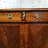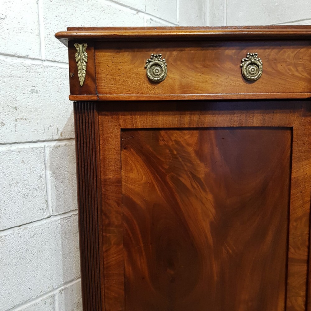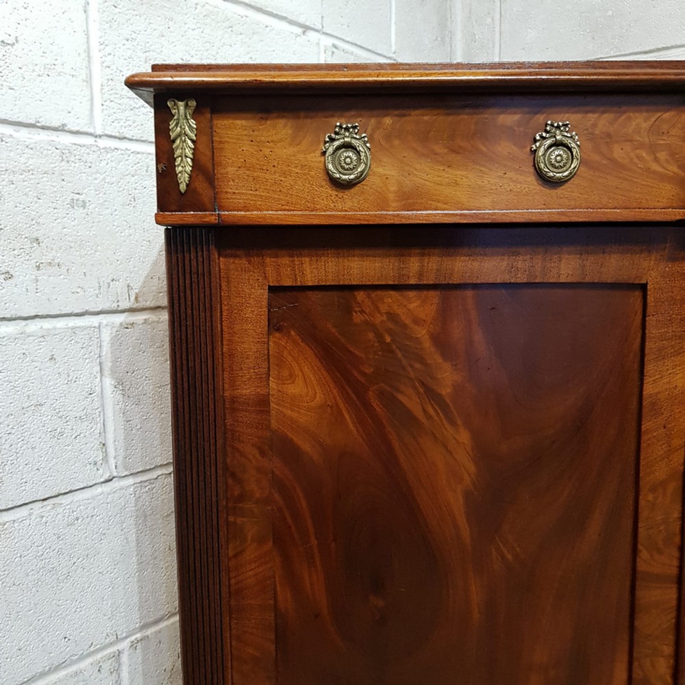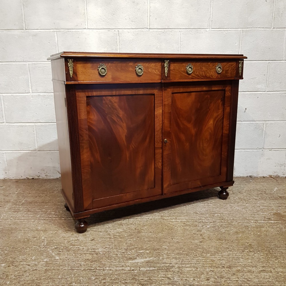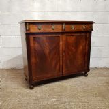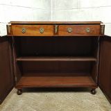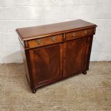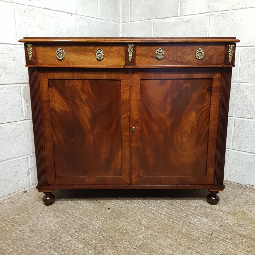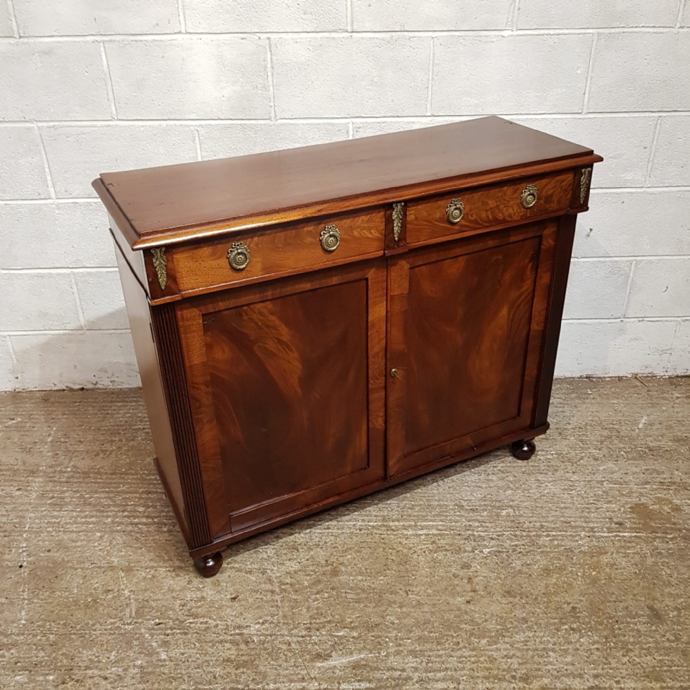 A Regency Mahogany chiffonier and dating from around 1810. This lovely piece has a moulded edge to the top with two drawers to the front both of which are Mahogany lined with original brass handles and to each side of the drawers is a gilt mount. Underneath the drawers are two doors both with a moulded panel with a key and a shelf inside. Down each side is a half readed column and it is moulded around the bottom and stands on bun feet.