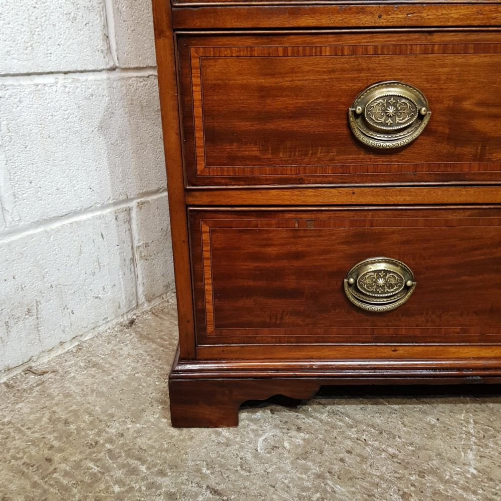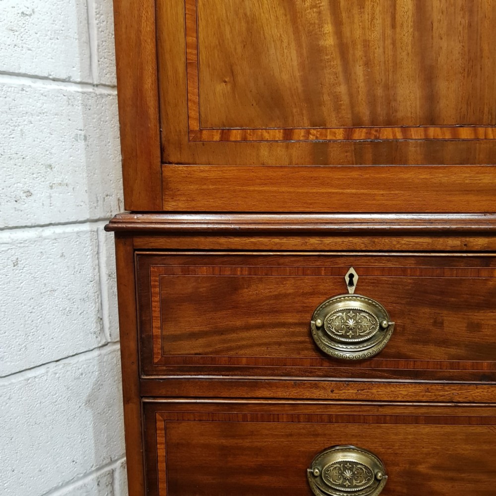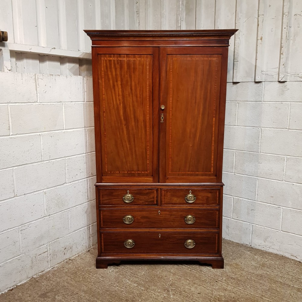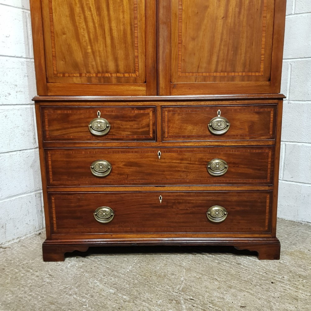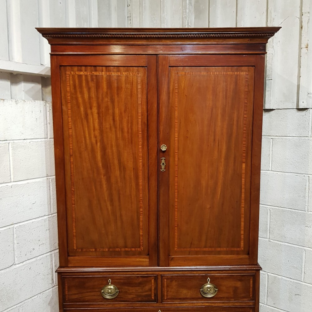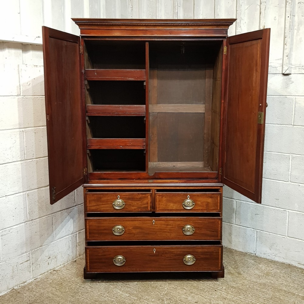 A late Victorian Regency style clothes press and dating from around 1890. This original clothes press has a dental moulded cornice, with a wide lip underneath. It has two doors to the top both of which are moulded with a satin wood cross banded edge with brass handles and escutheons. Inside are shelves on the left and a rail is on the right. The base is moulded around the top with two short drawers over two long graduating drawers all of which are Oak lined with original brass handles and ivoreen escutheons and a satin wood cross banded edge to the drawer fronts. It is moulded around the bottom and stands on bracket feet. The top lifts off the base for ease of movement.