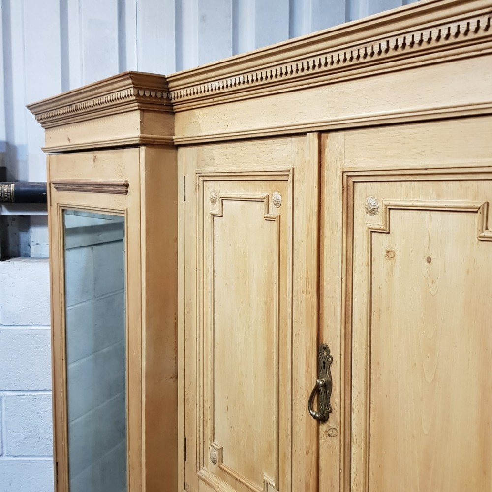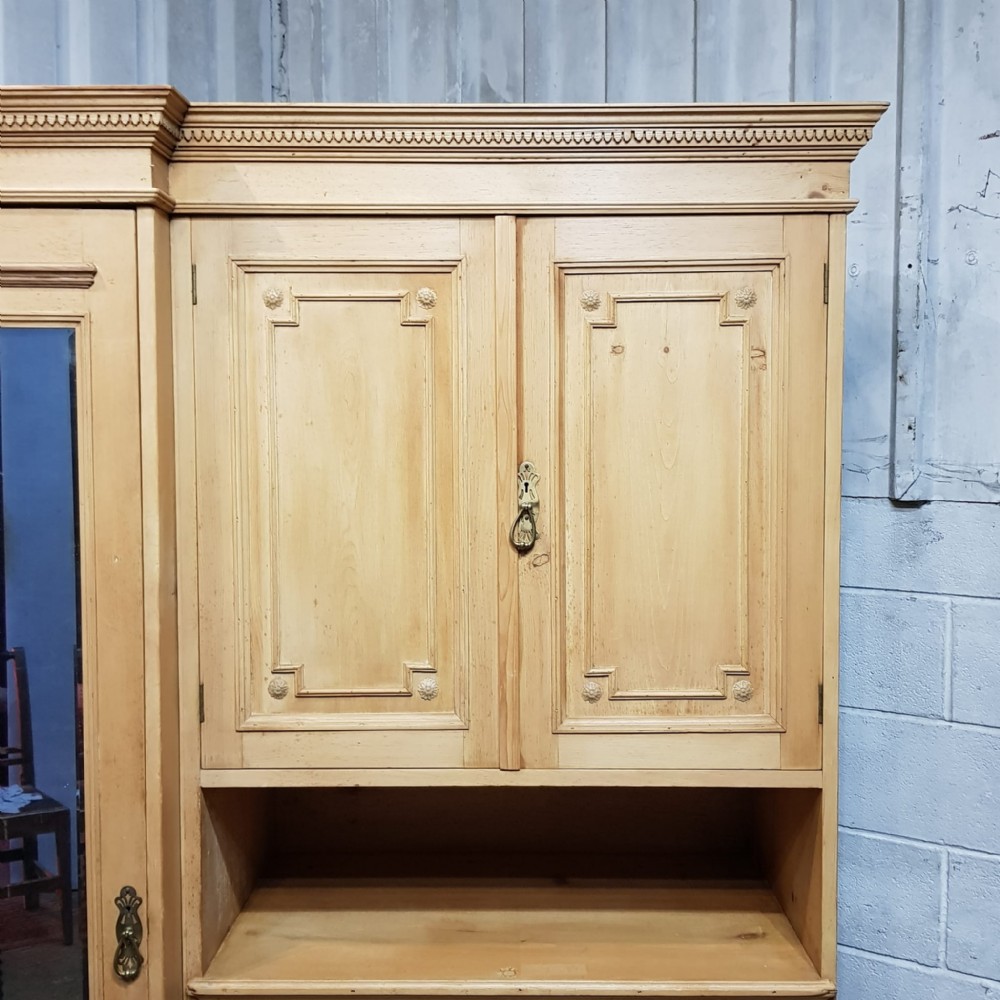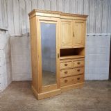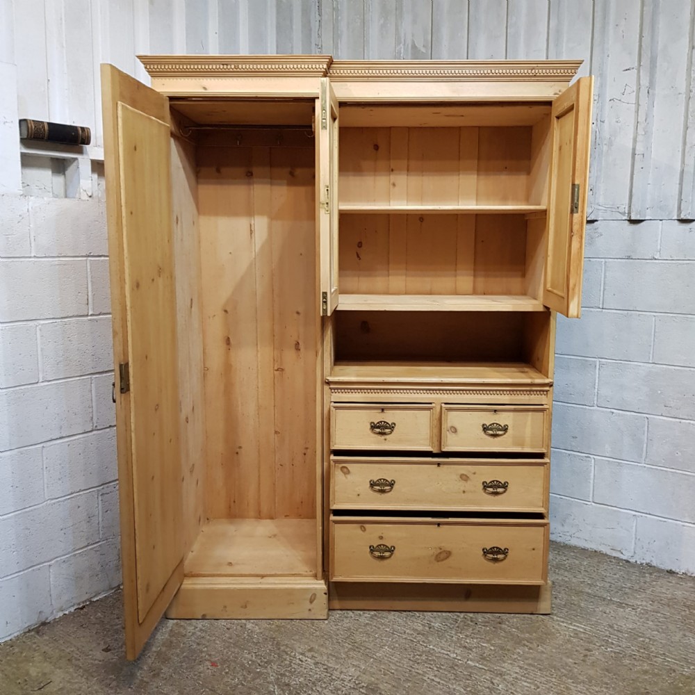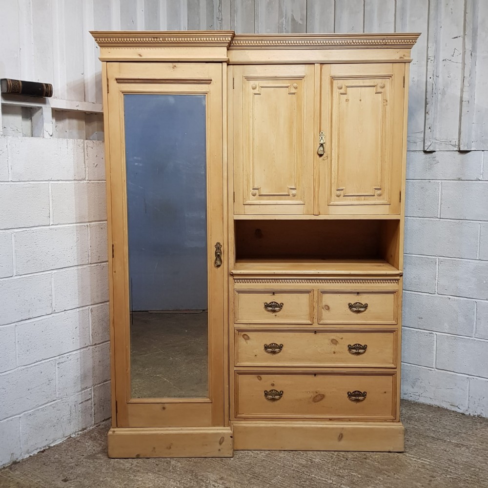 A late Victorian Pine combination wardrobe and dating from around 1890. This wonderful piece has a moulded cornice with dental moulding and a wide lip underneath. On the right hand side is a long mirror door with original brass handle and a hanging rail inside. On the right hand side are tow cupboard doors with moulded panels and a carved spandrell in each corner with original brass handles, inside is a shelf and an open compartment underneath. Following this are two short over two long drawers all of which are pine lined with original brass handles. The wardrobe stands on a plinth base and separates into five pieces for ease of movement,