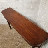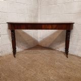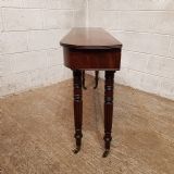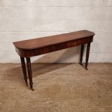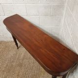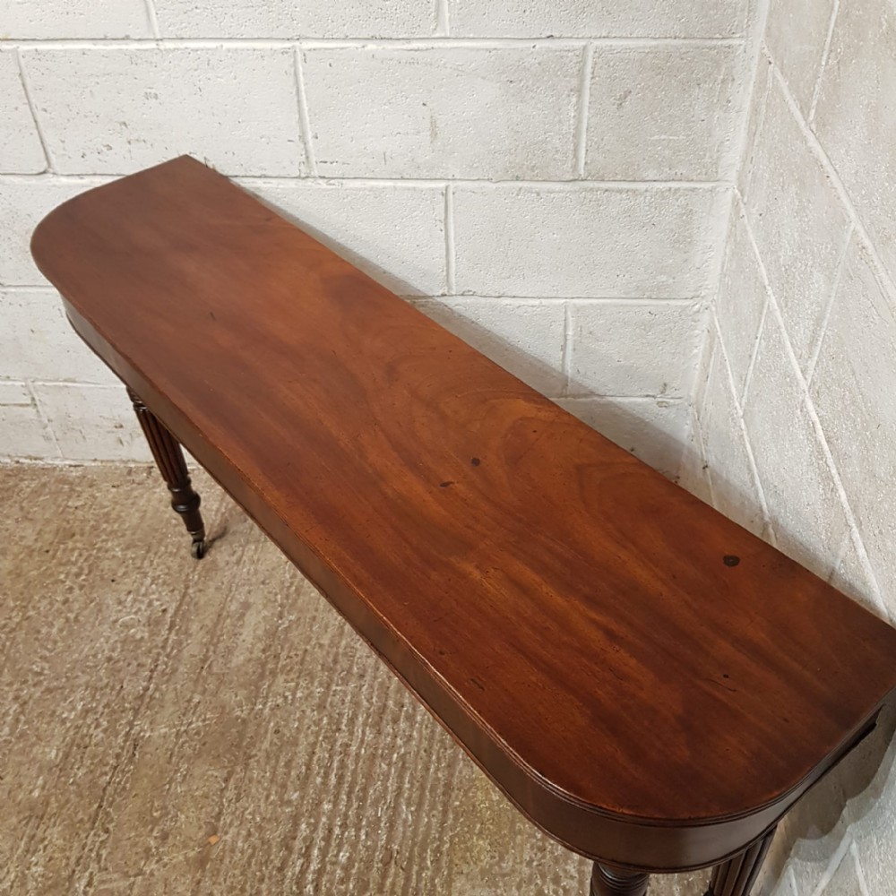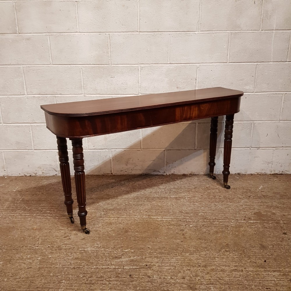 A Regency Mahogany console table and dating from around 1800. This original table has a readed edge to the top with a wide lip underneath and a readed bottom edge. It stands on ring turned and fluted legs on castors.