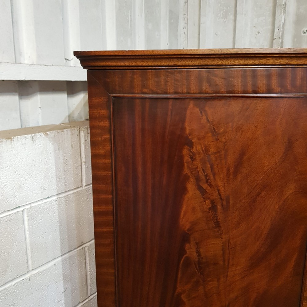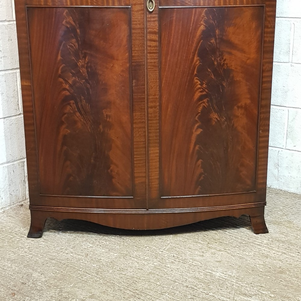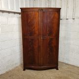 A bow fronted Mahogany triple wardrobe and dating from around 1920. This triple wardrobe has a moulded caddy cornice with two doors to the front both of which has two moulded panels and a cross banded edge to the door frames with original Brass handles. Inside is a rail on the left and a shelf on the right with a rail underneath. It is moulded around the bottom and stands on splayed bracket feet with a shaped frieze in between.