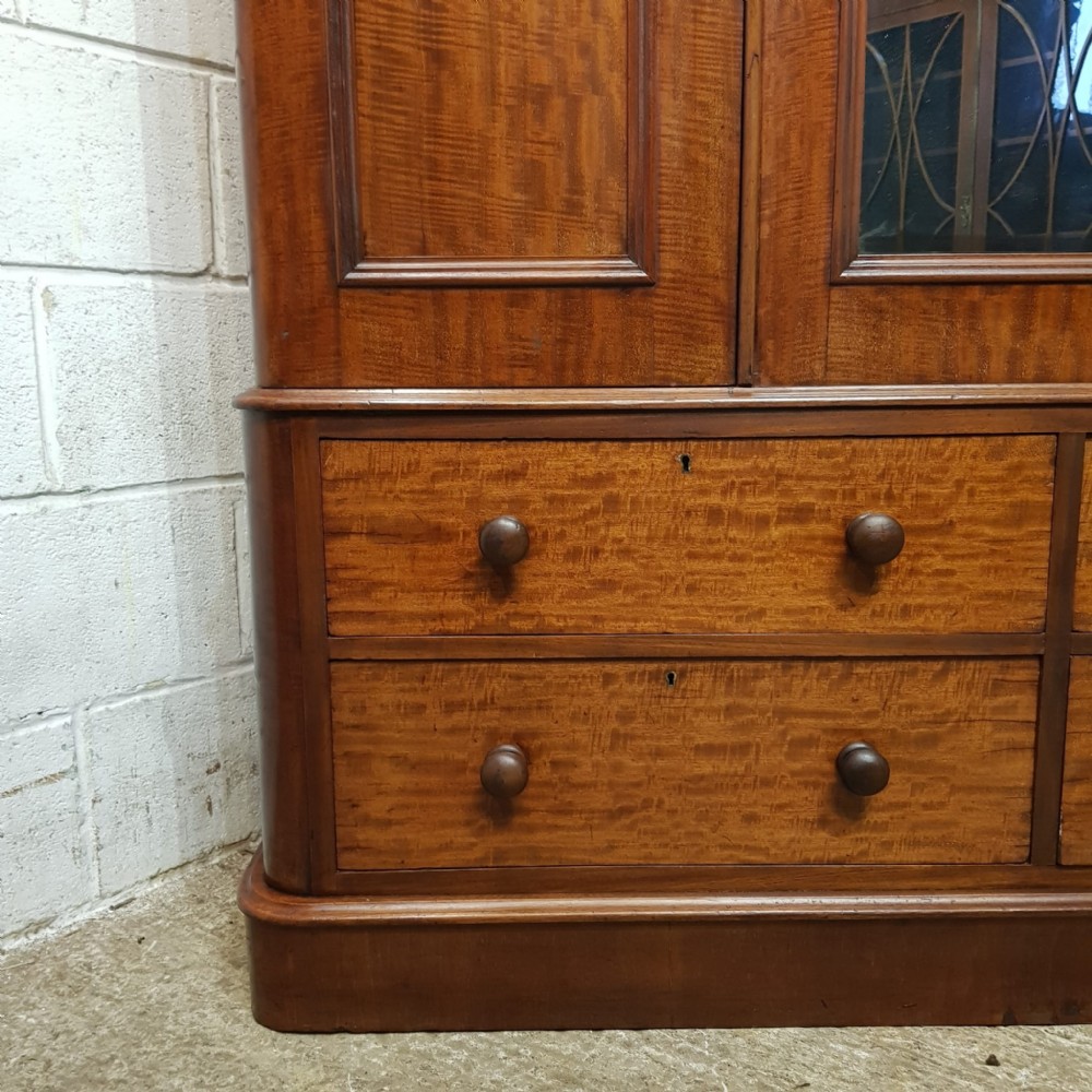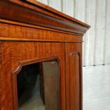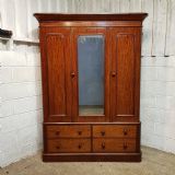 A Victorian Mahogany small triple wardrobe and dating from around 1880. This beautiful piece has a moulded cornice with a lip underneath and features a central mirrored door in very good condition. The doors to each side have a long moulded panel with original nob handles. Behind the left and centre doors is a hanging rail and behind the right hand door are four slide tray drawers. The base is moulded around the top with two rows of two short drawers all of which are Mahogany lined with original nob handles. The wardrobe stands on a plinth base and separates into six pieces for ease of movement.