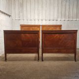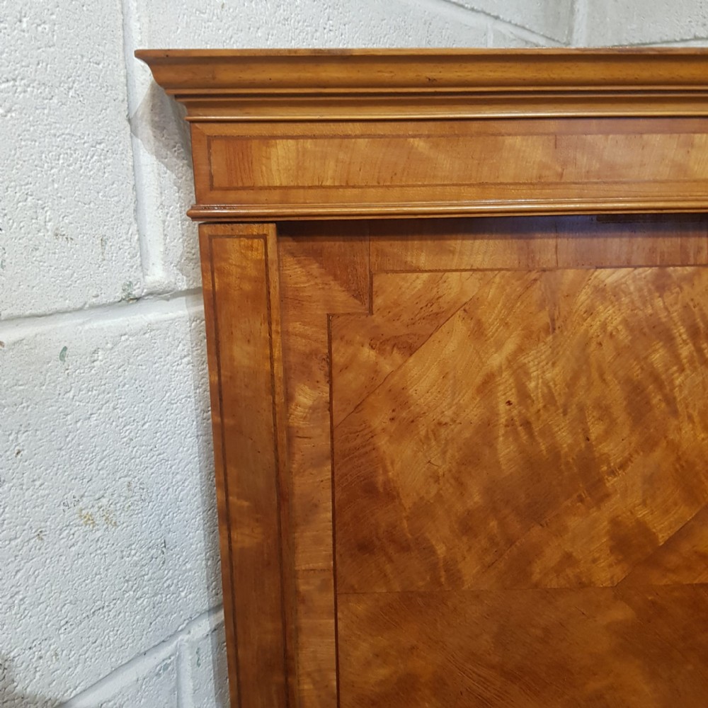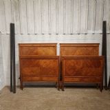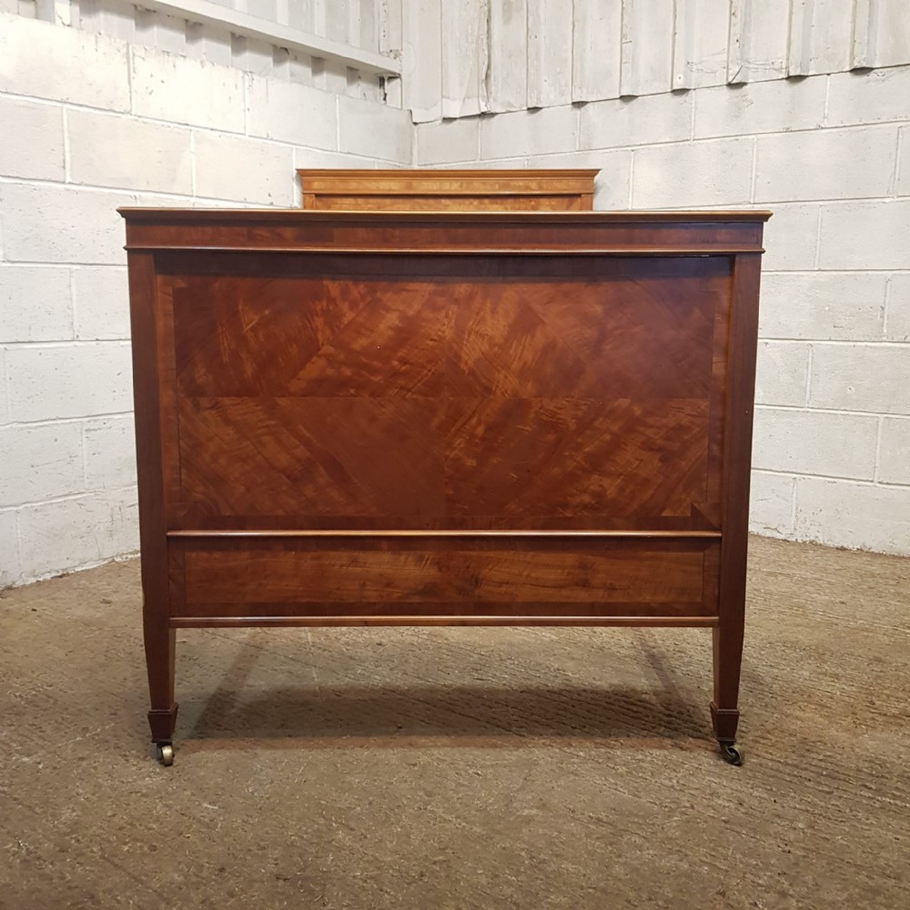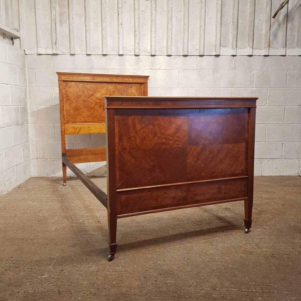 A pair of Satinwood Shapland and Petter single besd and dating from around 1890. This lovely pair of single beds have a strung side rail headboard and moulded strung top rail with a lip underneath with a large cross banded and strung panel and the foot board is the same. They stand on square tapered legs on castors with original Iron screw in side rails.