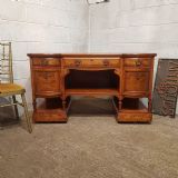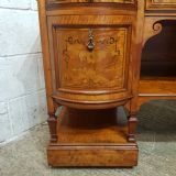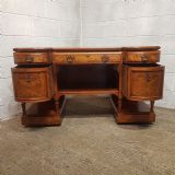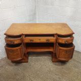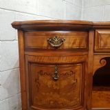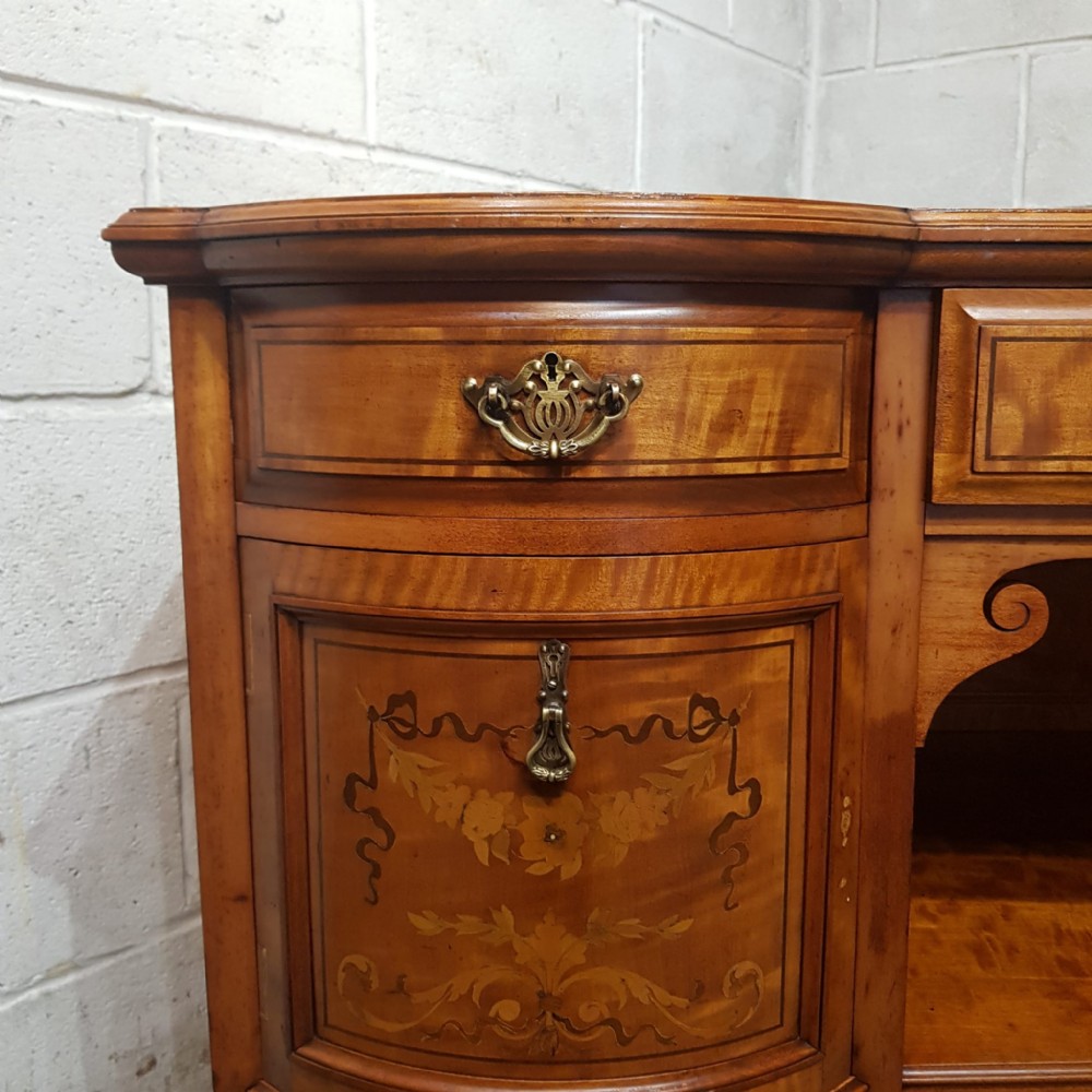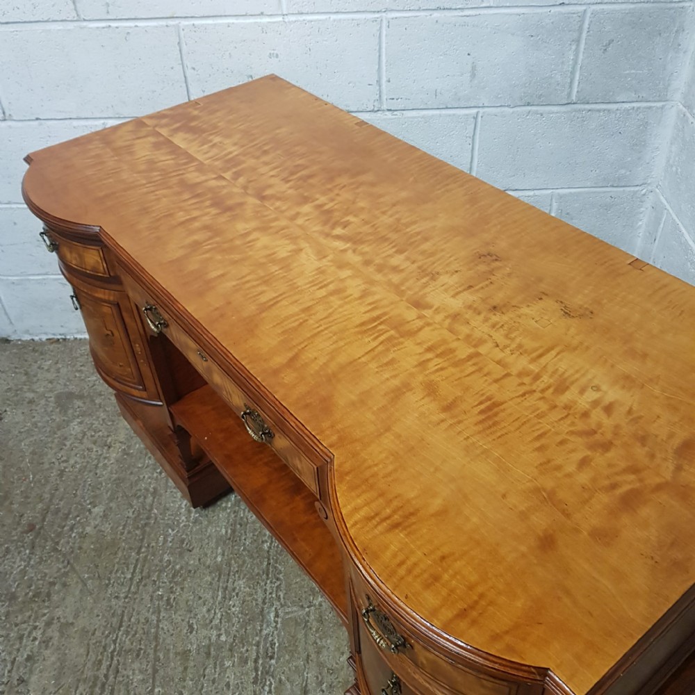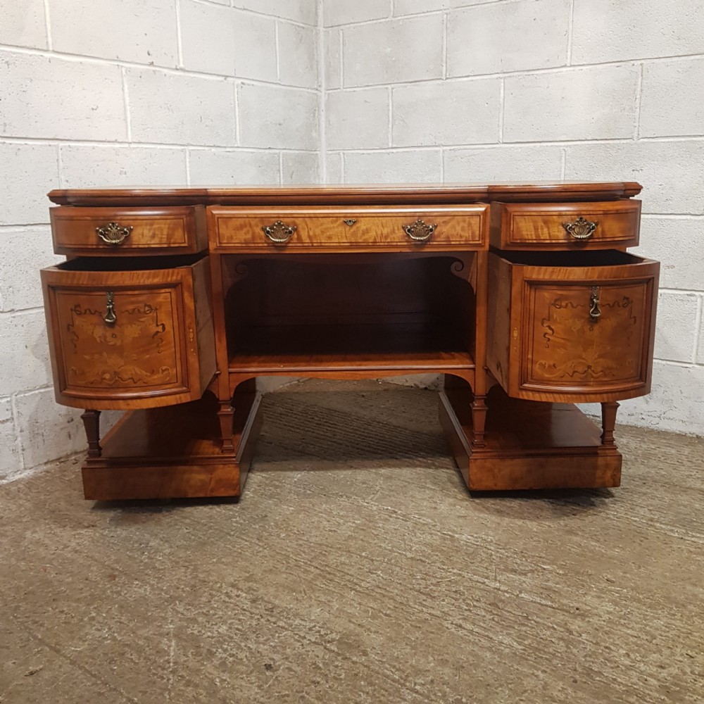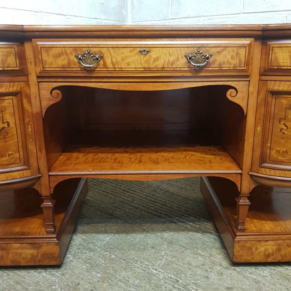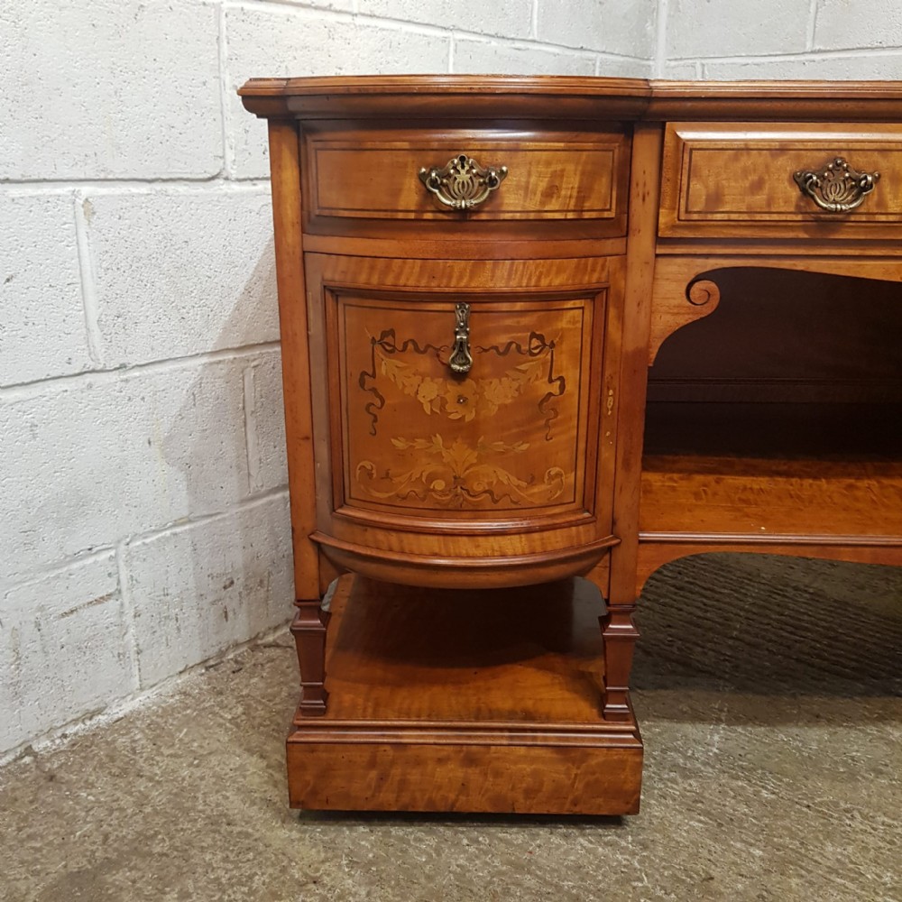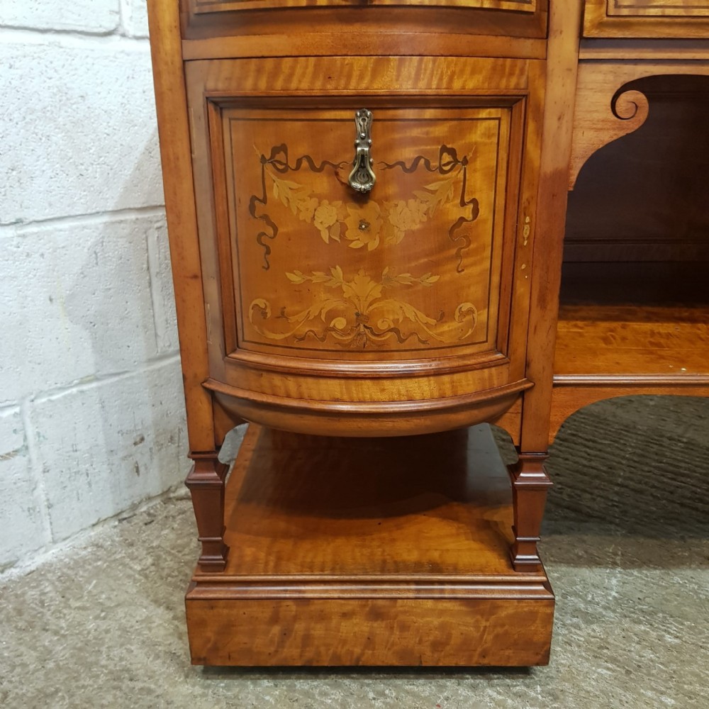 A Shapland and Petter Satinwood dressing table and dating form around 1890. This original piece has a moulded edge to the top with a long drawer to the centre and corner supports, under of which is a shelf. Each end is bow fronted with a drawer to the top both of which are Ash lined with original Brass handles and escutcheons and Ebony style drawer fronts. Under the small drawers is a square deep drawer same as the small ones above apart from the drawer fronts are inlaid. It stands on square moulded legs on a plinth with a shelf.