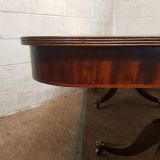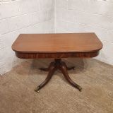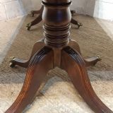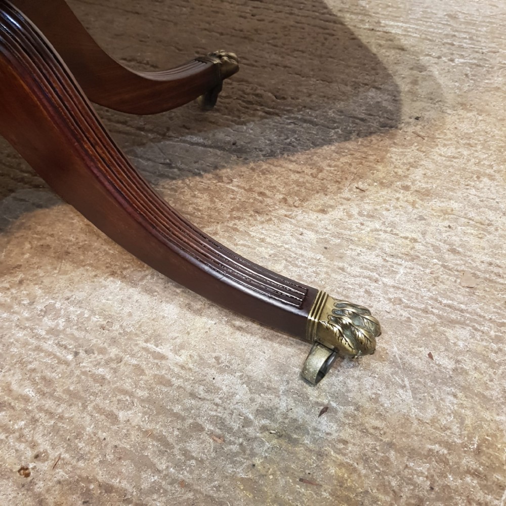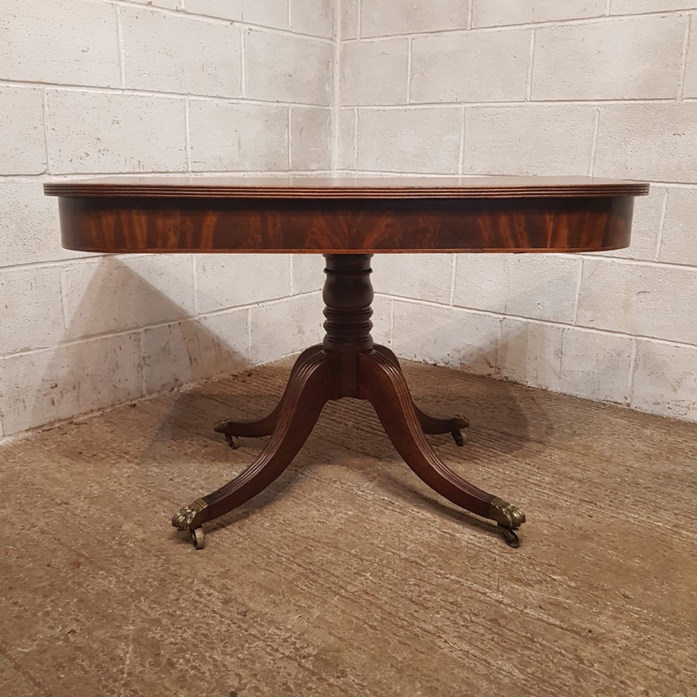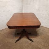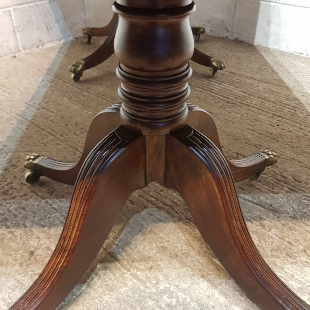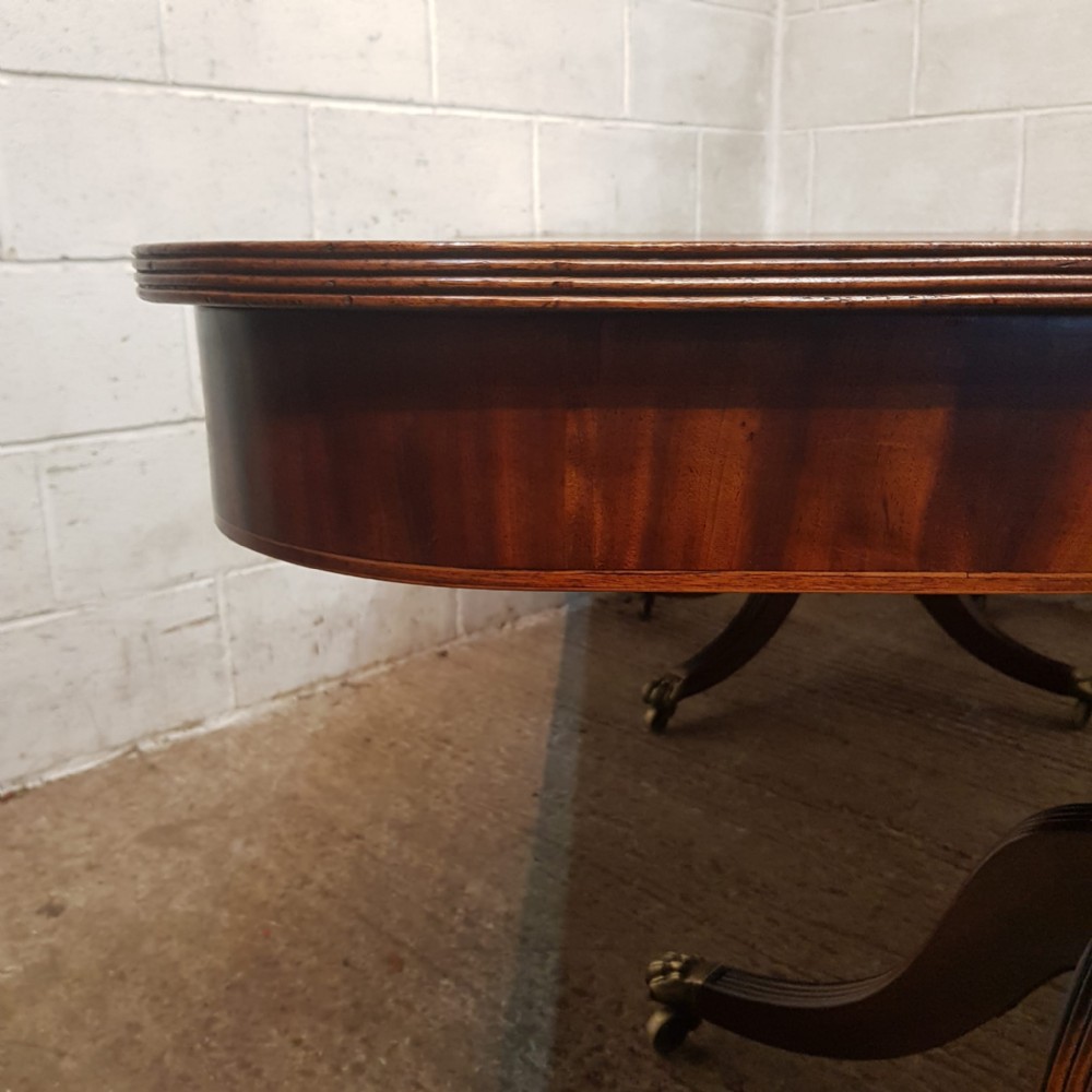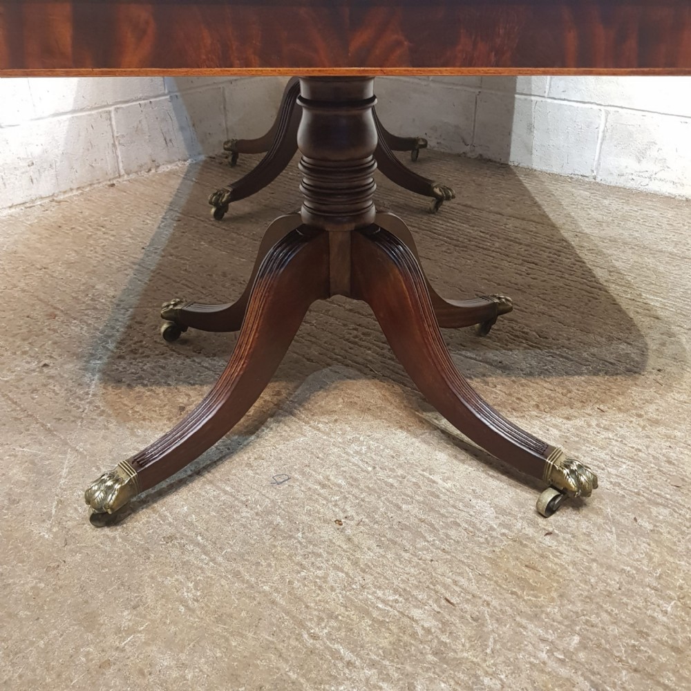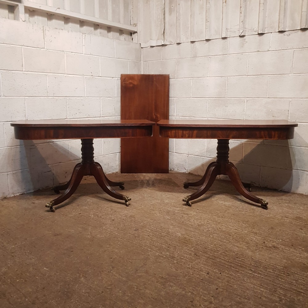 A Regency Mahogany twin pillar dining table and dating from around 1800 - seats 8 comfortably. This twin pillar dining table has a readed edge to the top with a wide lip underneath with an inlaid bottom edge. The pillars have a turned central support on four shaped and readed legs on original Brass paw castors. The two ends can also be used as side tables.