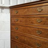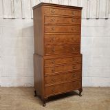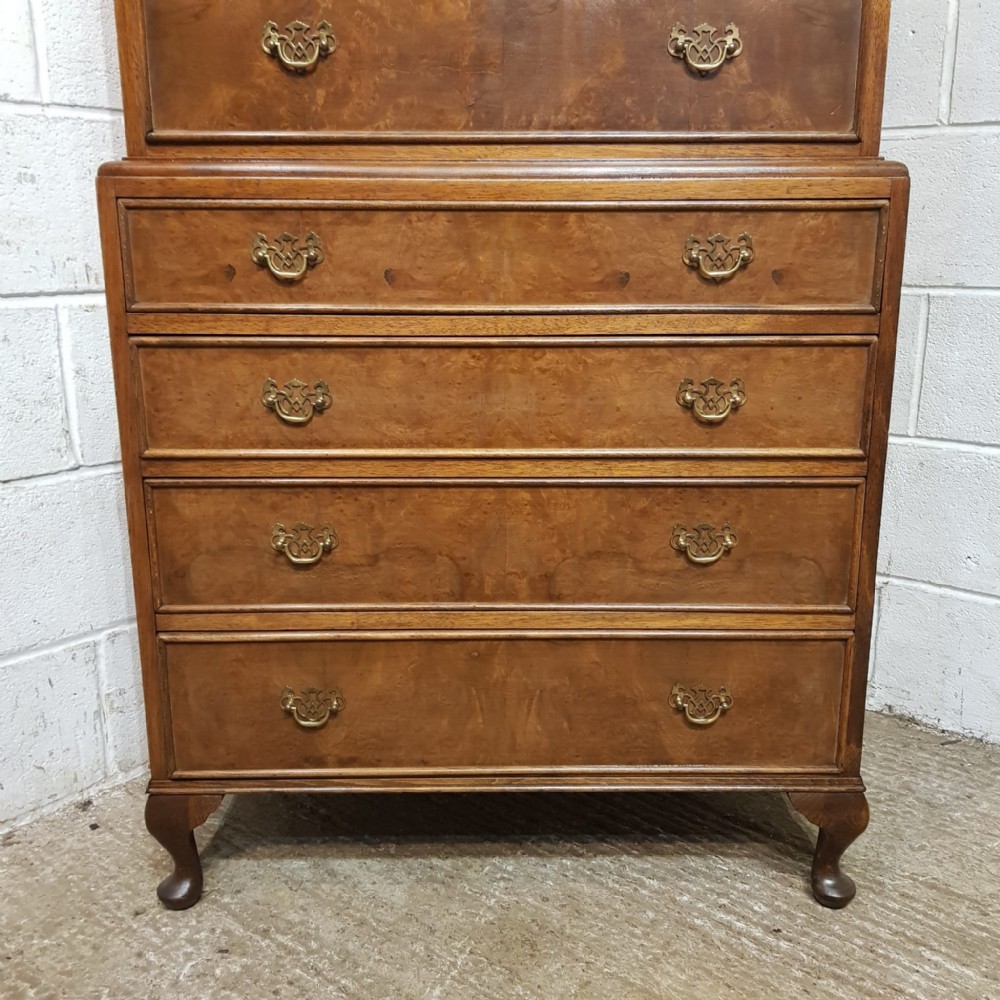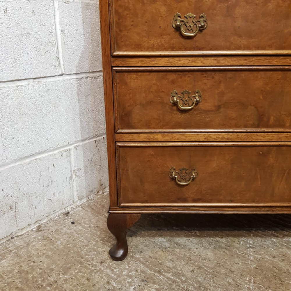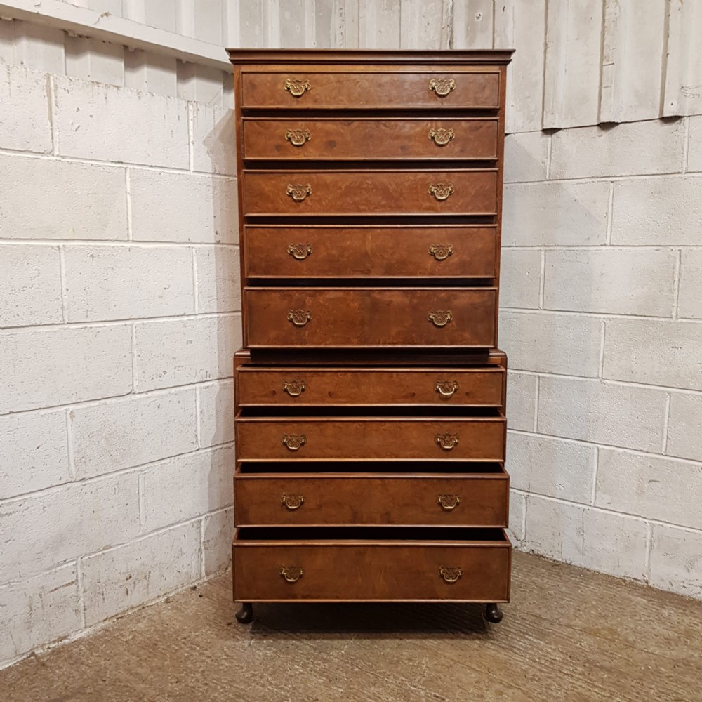 A Walnut chest on chest and dating from around 1920. This lovely piece has a moulded cornice with five long graduating drawers underneath all of which are Mahogany lined with original Brass handles and Burr Walnut drawer fronts. The base is moulded around the top with four long graduating drawers which are the same as above. It is moulded around the bottom and stands on short cabriole legs.