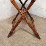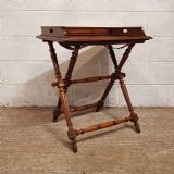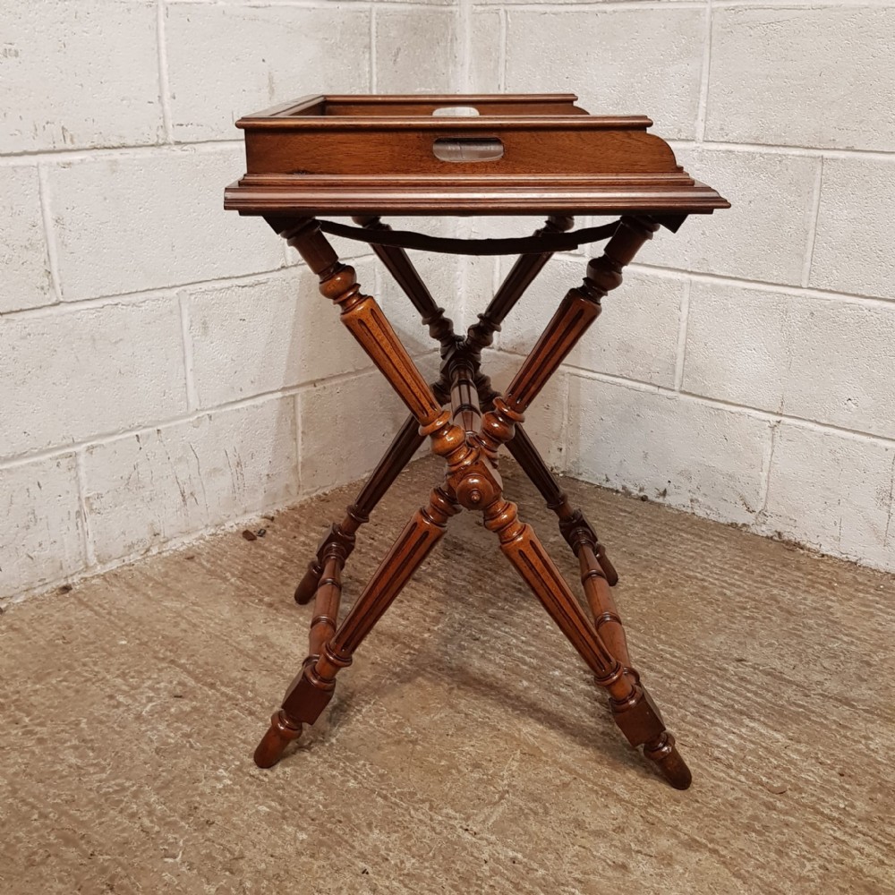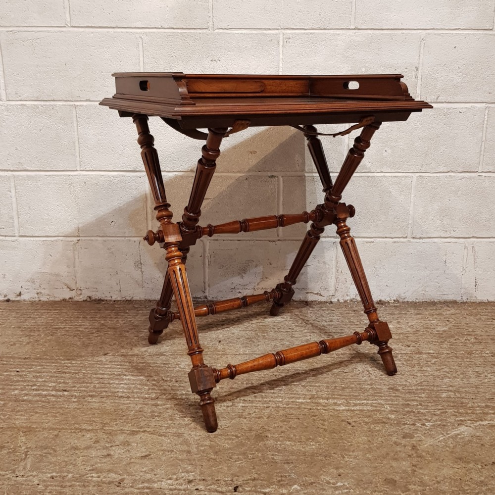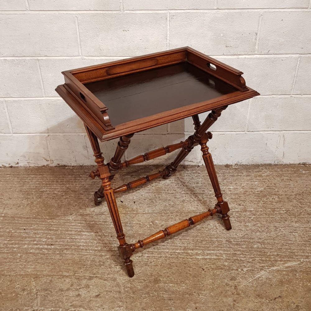 An antique Walnut butlers tray on original stand and dating from around 1890. This piece has a moulded gallery back and sides with hand holes to each side for serving. The stand has turned and fluted legs, turned cross stretchers and finials. The tray lifts off and the stand folds for easy storage.