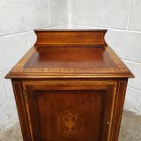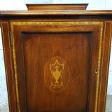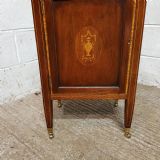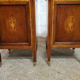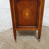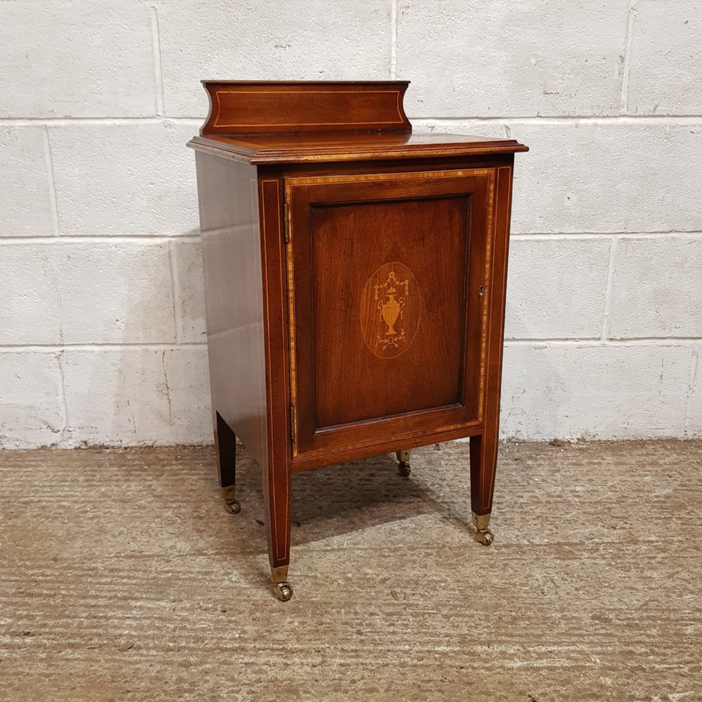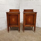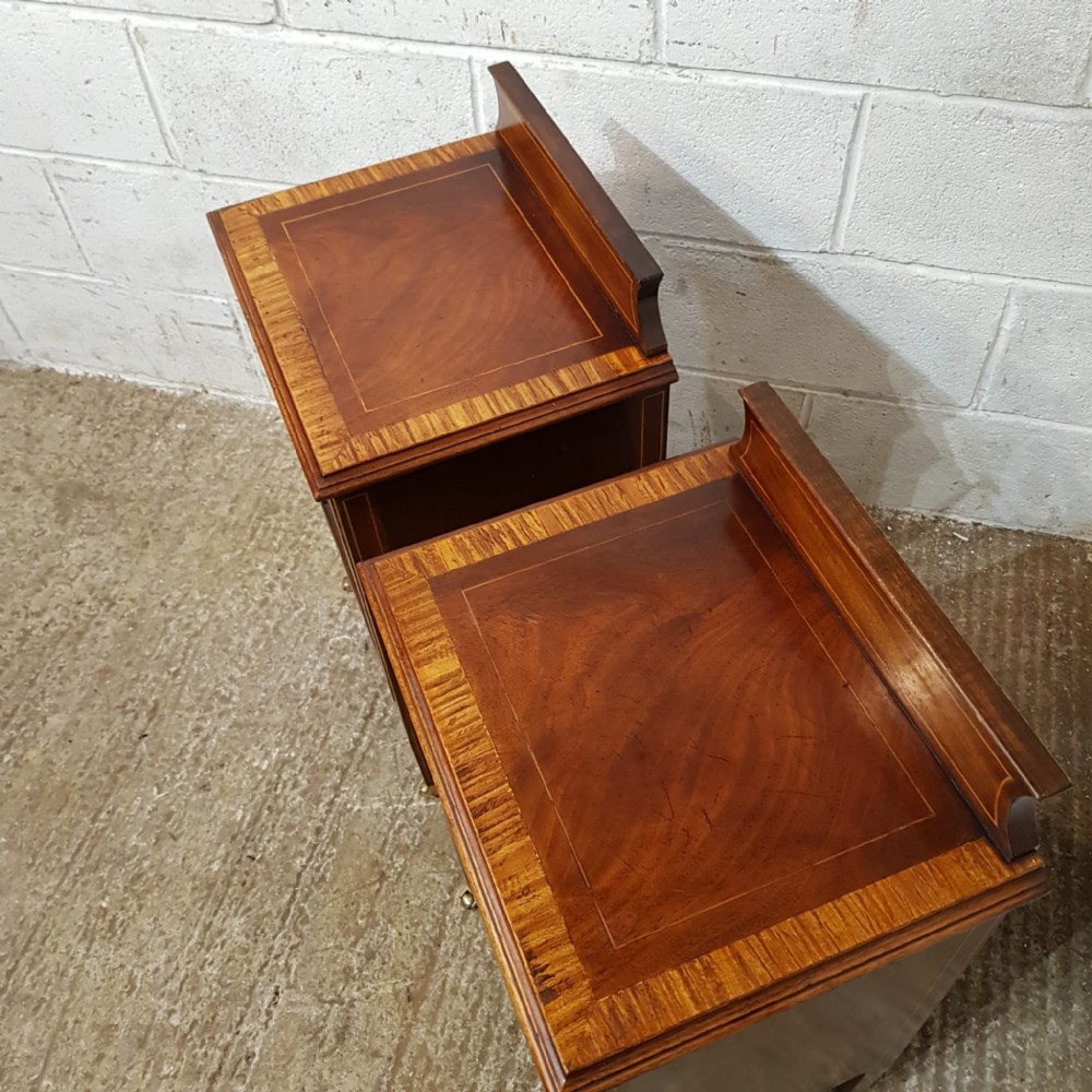 A pair of Edwardian Mahogany and Satinwood bedside cabinets and dating from around 1900. These beautiful pair of bedside cabinets have a Satinwood strung gallery back and a Satinwood Strung cross banded and moulded edge. The door fronts have a Satinwood cross banded edge and an inlaid moulded panel door with a shelf inside. It stands on Satinwood strung tapered legs on Brass shoe castors.