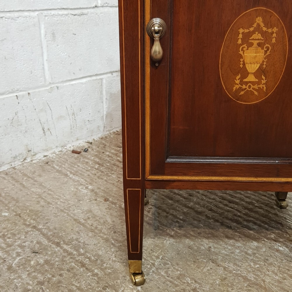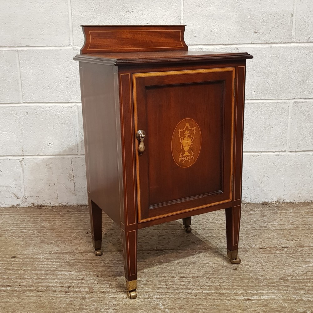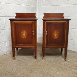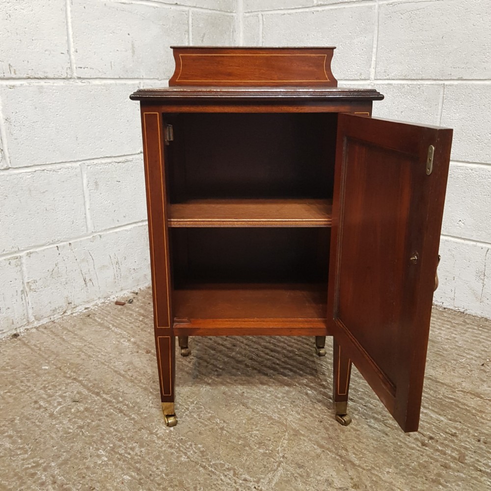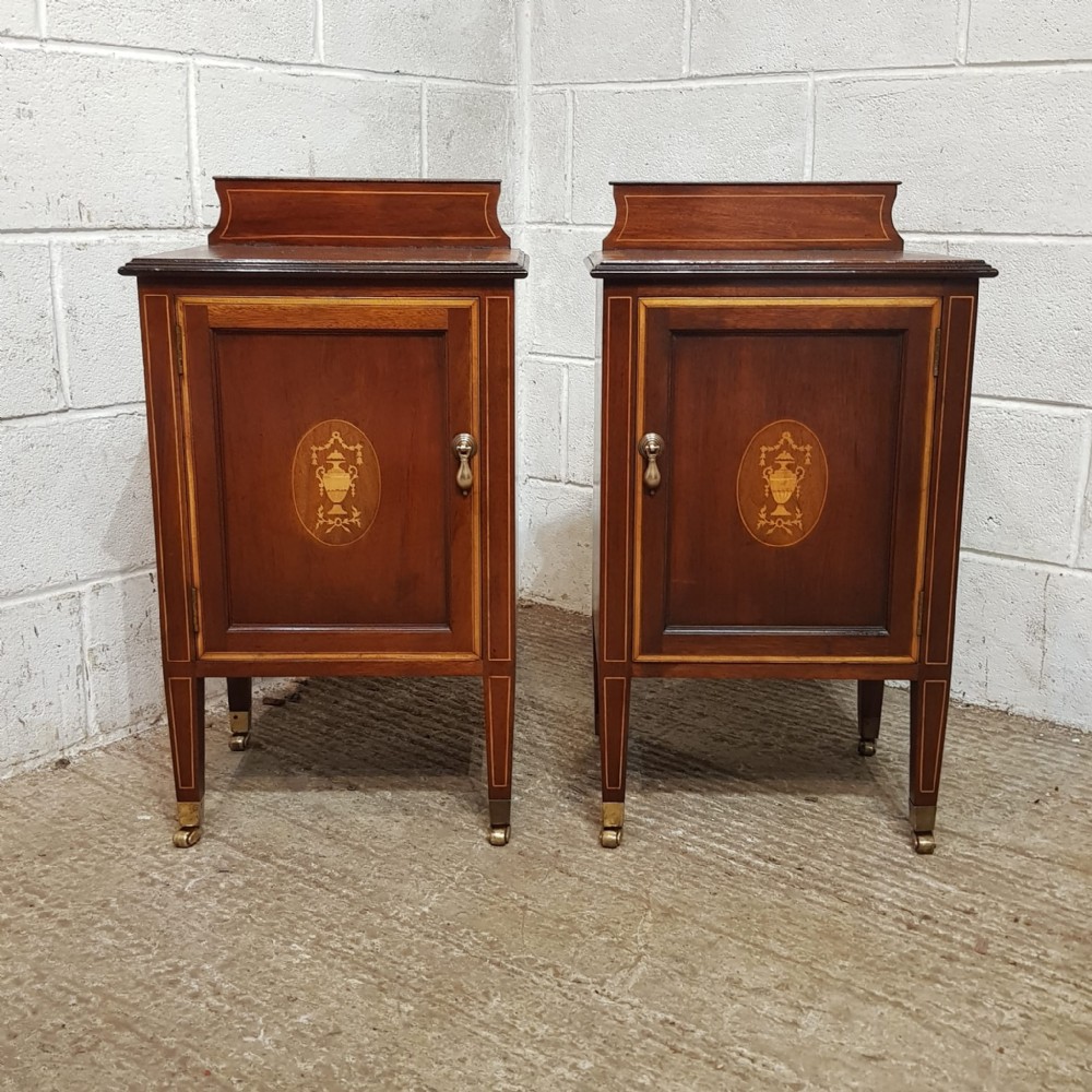 A pair of Edwardian Mahogany bedside cabinets and dating from around 1900. These lovely bedside cabinets have satinwood strung and shaped gallery backs, satinwood cross banded and moulded edge to the top with a single satinwood strung door to the front and a satinwood inlaid oval panel to the centre with Brass handles. It has a singular shelf inside. They stand on square tapered satinwood strung legs on Brass shoe castors.