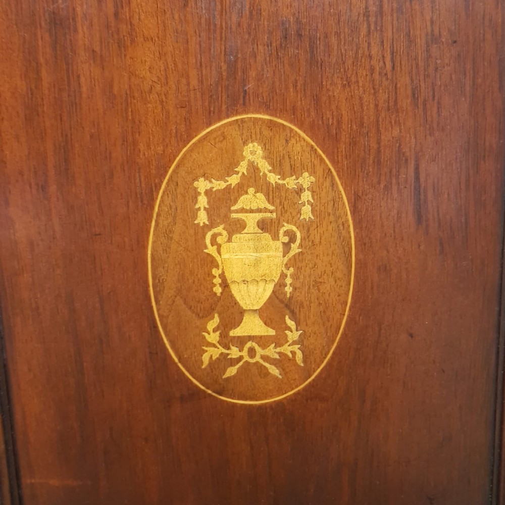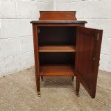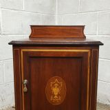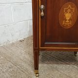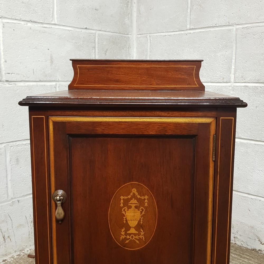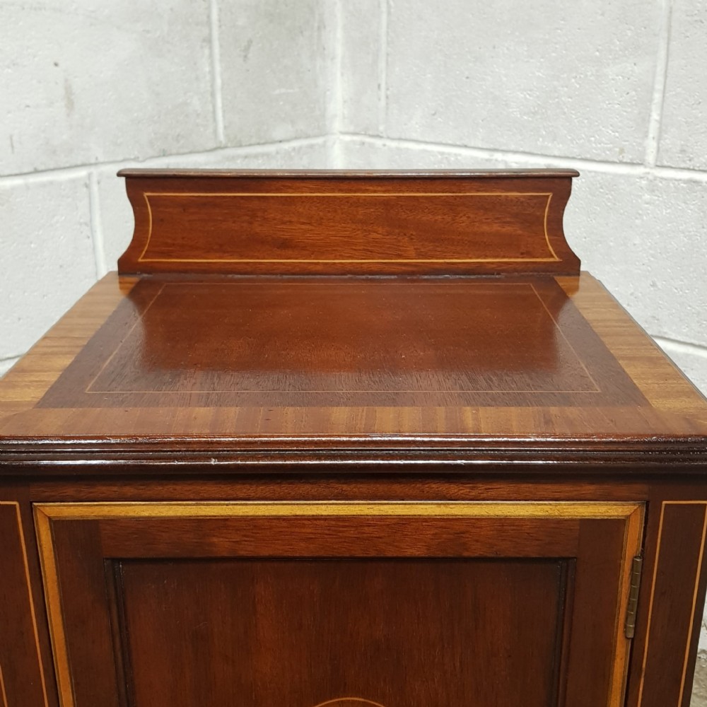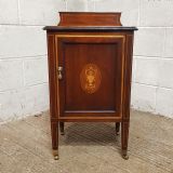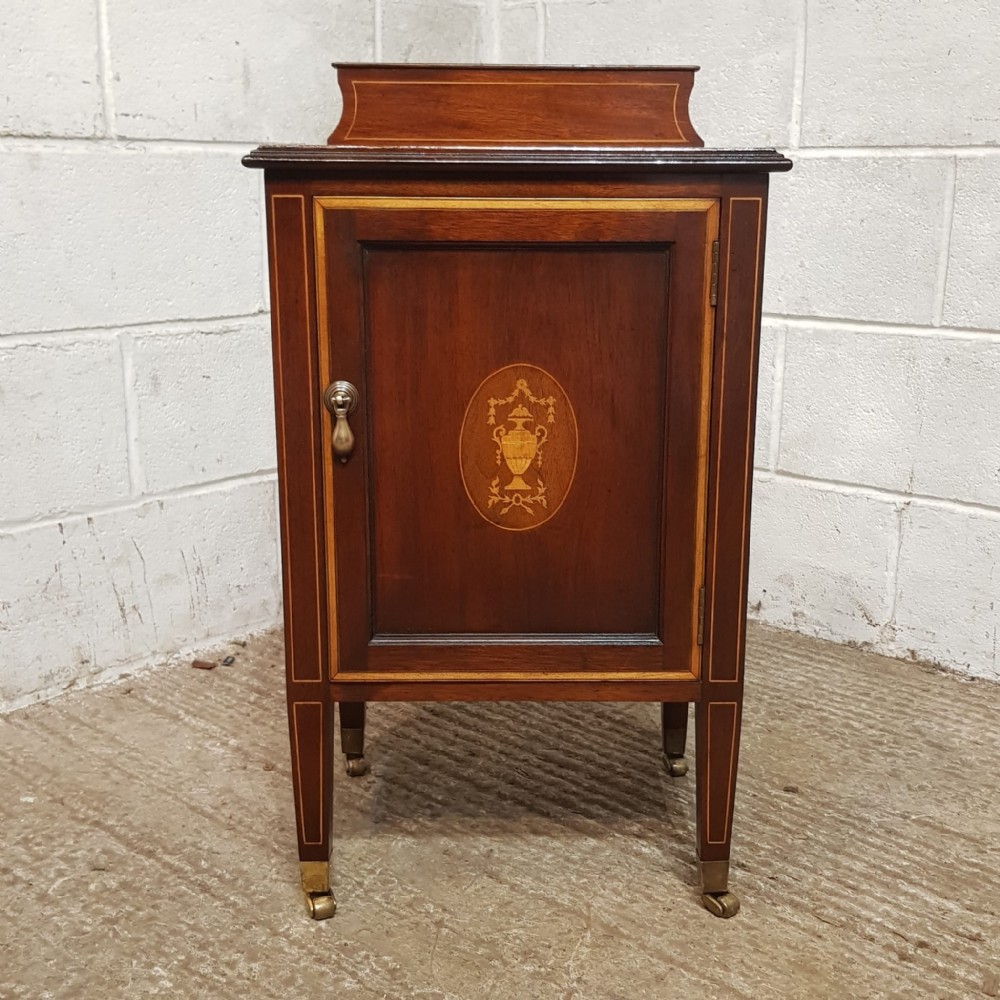 A pair of Edwardian Mahogany bedside cabinets and dating from around 1900. These lovely bedside cabinets have satinwood strung and shaped gallery backs, satinwood cross banded and moulded edge to the top with a single satinwood strung door to the front and a satinwood inlaid oval panel to the centre with Brass handles. It has a singular shelf inside. They stand on square tapered satinwood strung legs on Brass shoe castors.