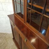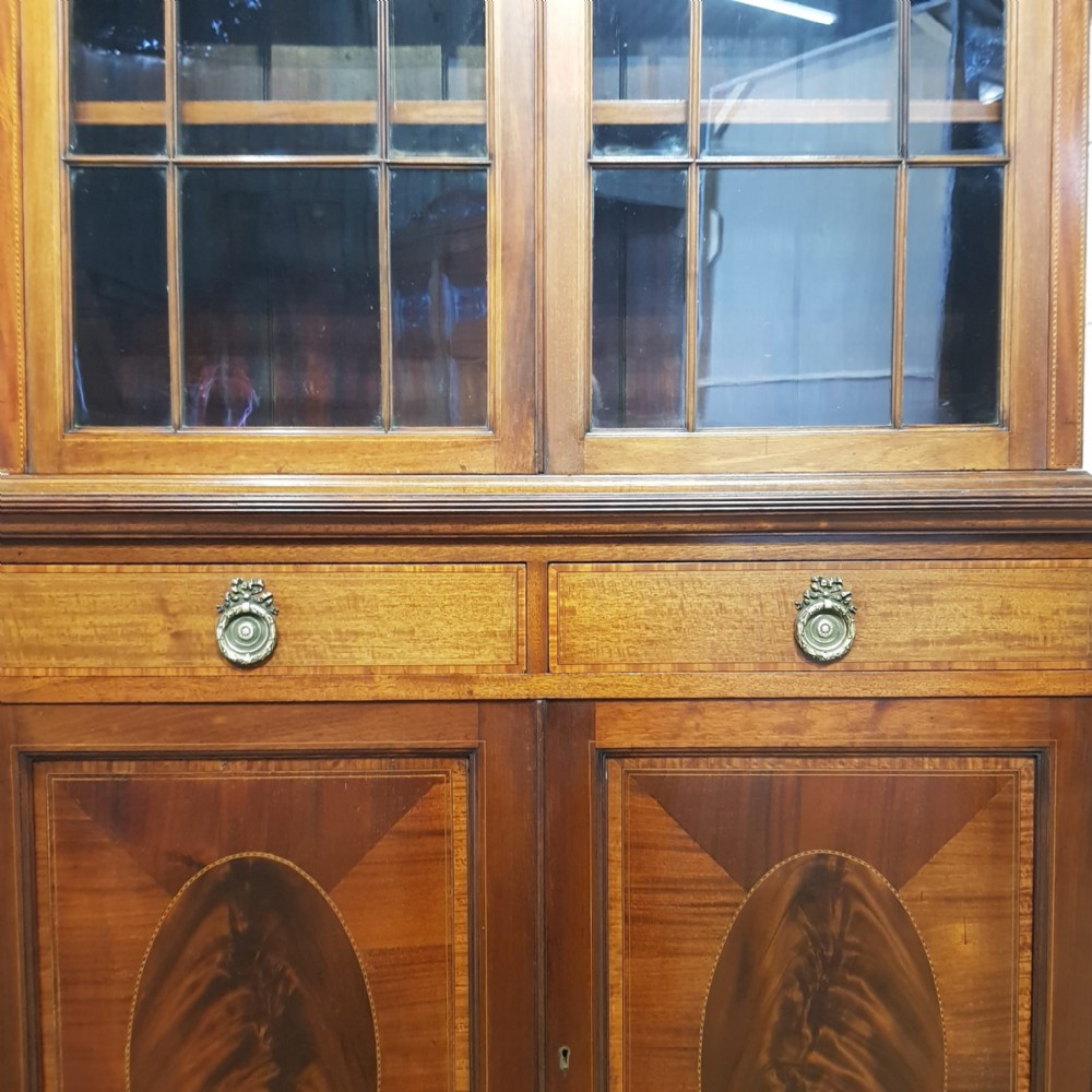 An Edwardian Mahogany library bookcase and dating from around 1910. This bookcase has a dental moulded satinwood strung cornice and lip. It has two astragal glazed doors with a key and three fully adjustable shelves inside. The base is moulded around the top with two short drawers which are Mahogany lined with original Brass handles and a satinwood strung edge to the drawer fronts. Underneath these are two doors each of which has a cross banded moulded panel with a sating wood strung oval panel to the centre with a key and a shelf inside. It is moulded around the bottom and stands on a plinth base and the top lifts off the base.