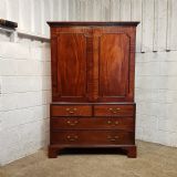 A Regency Mahogany clothes press and dating fro around 1810. This lovely example has a moulded cornice top with two doors underneath both with a moulded panel with a key. Inside is a hanging rail. The base is moulded around the top with two short drawers above two long graduating drawers all of which are Oak lined with original Brass handles. It is moulded around the bottom and stands on bracket feet and the top lifts off the base for ease of movement.