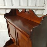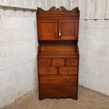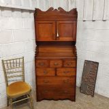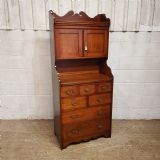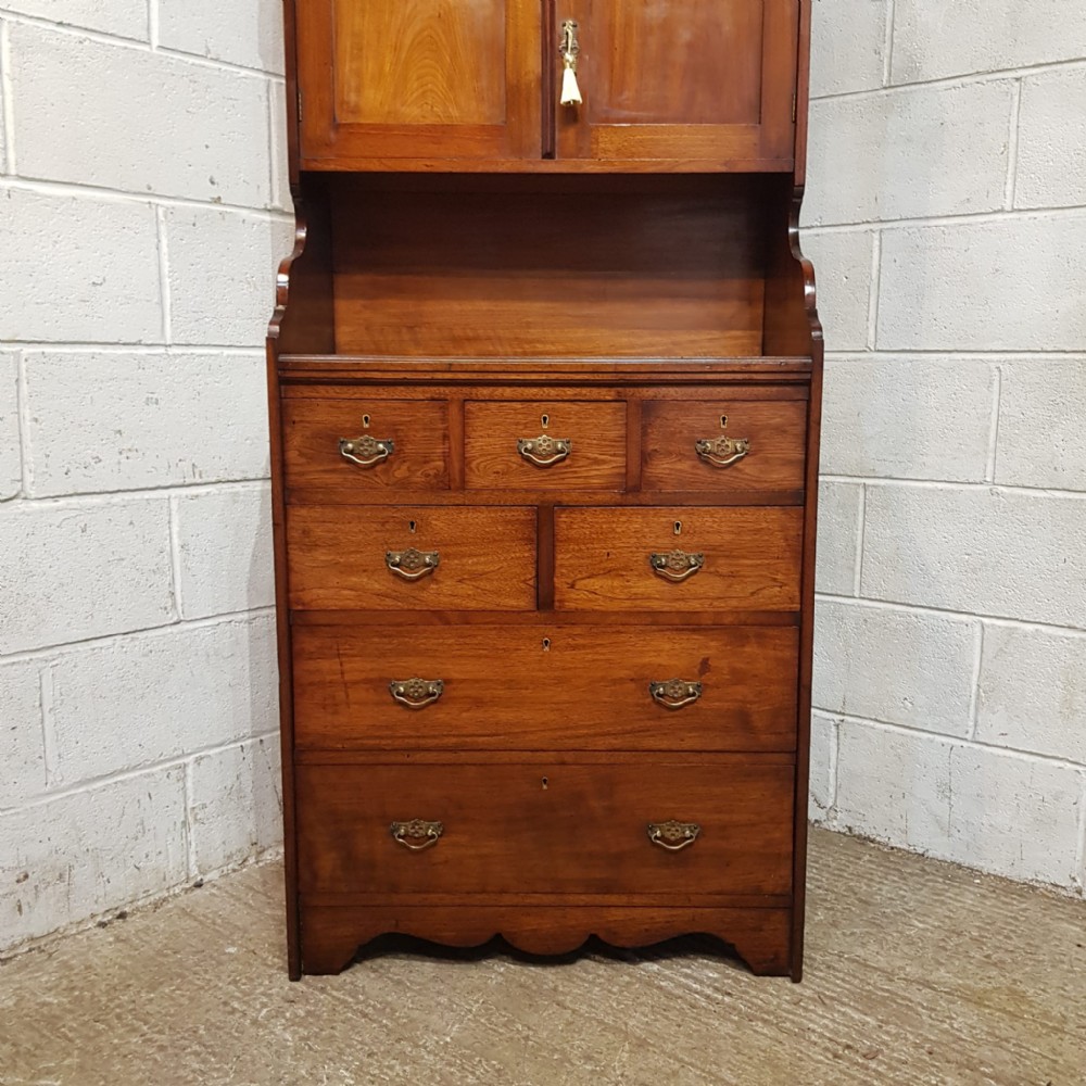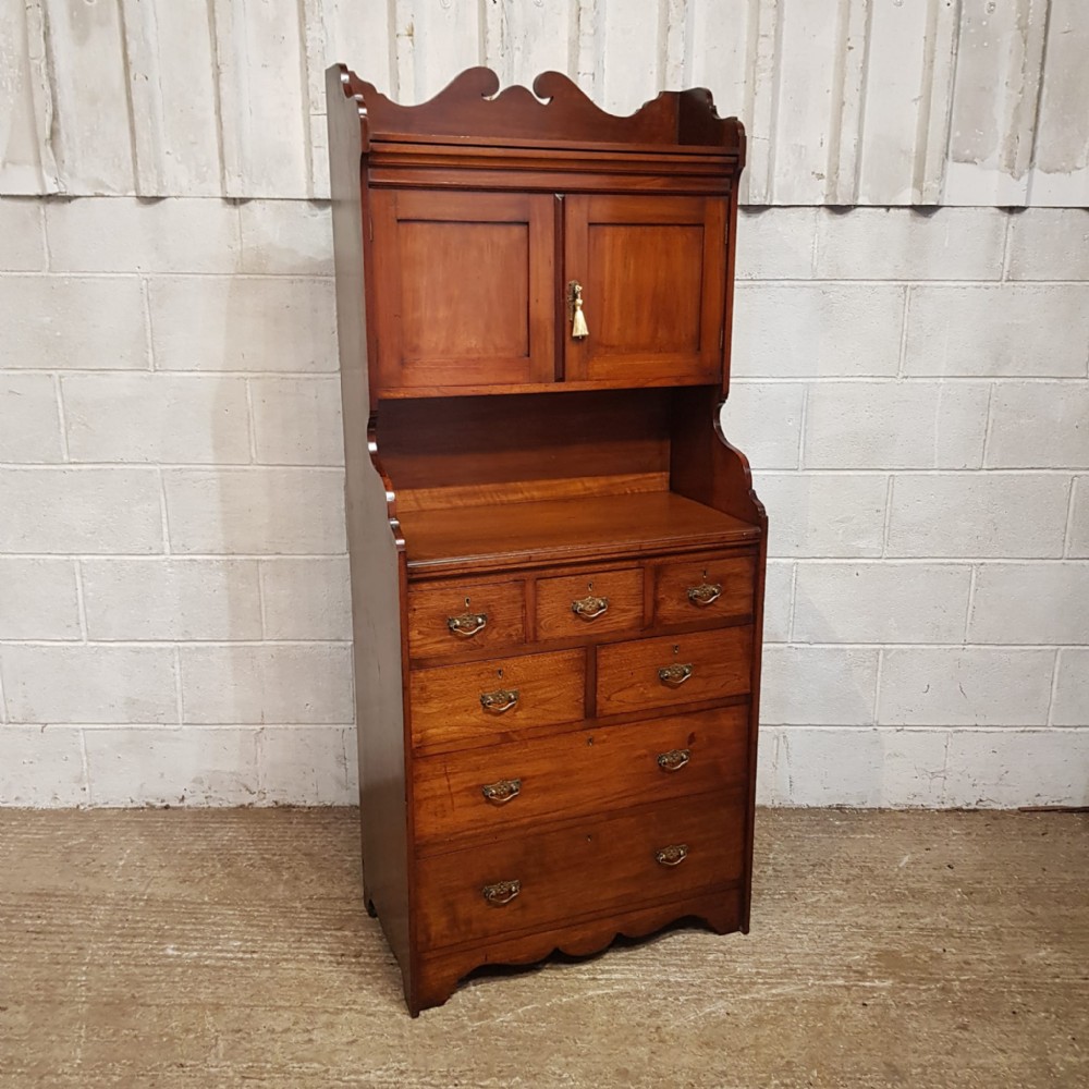A late Victorian Mahogany gentleman's dressing chest and dating from around 1890. The top to this original piece has a small cupboard with two moulded panel doors and a key. Above the cupboard is a shaped gallery back and sides. The cupboard sits on shaped supports. The top of the base has a moulded edge and then three small drawers above two short drawers which are above two long graduating drawers. All are Oak lined with original Brass handles. It stands on bracket feet with a shaped frieze in between and is in one full piece.