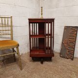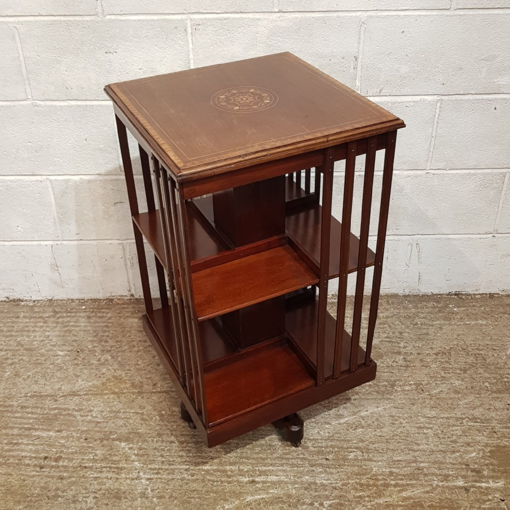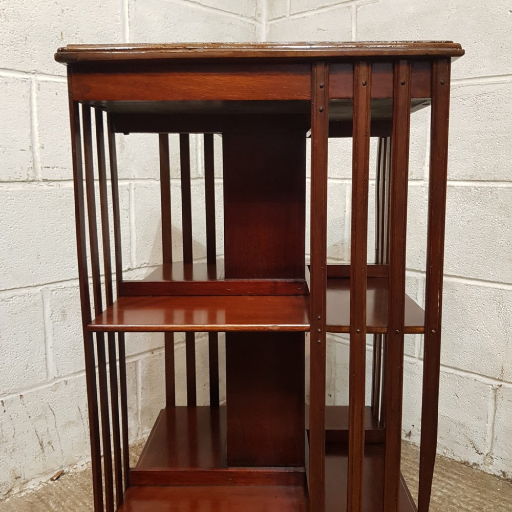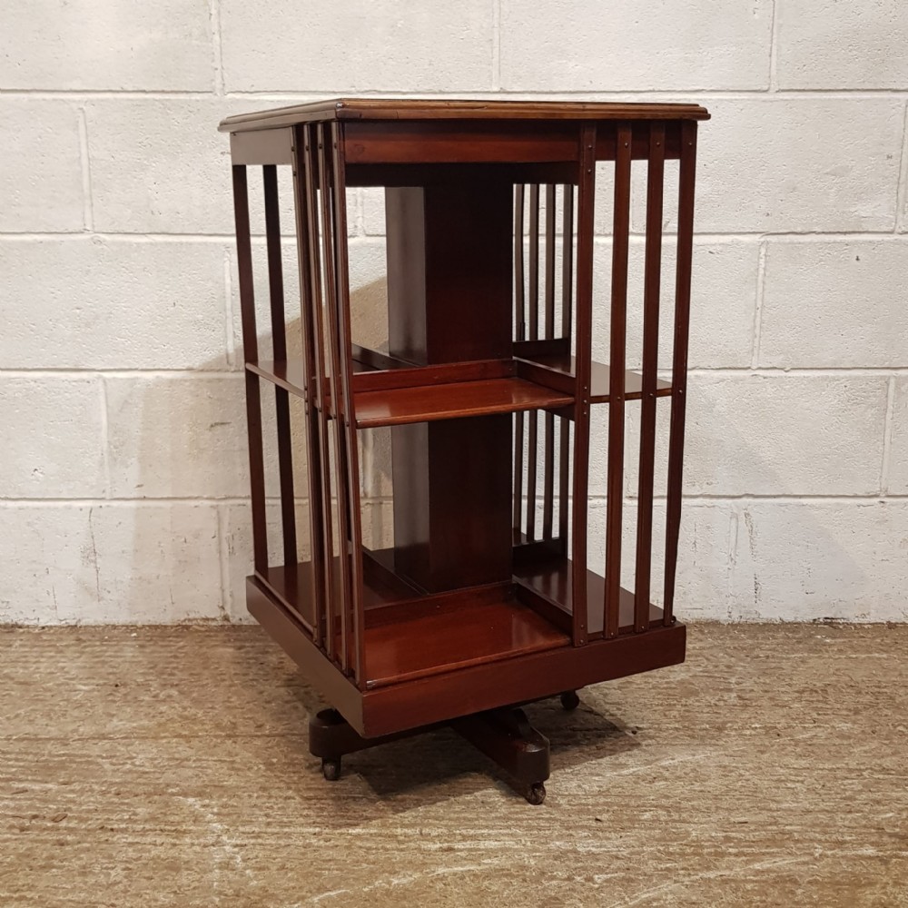 An Edwardian Mahogany revolving bookcase and dating from around 1900. This wonderful example has a Satin wood and cross banded moulded edge to the top which also has an inlaid centre. It has two tiers of shelves with readed rails and a plinth base which stands on a quad form base on castors.