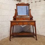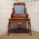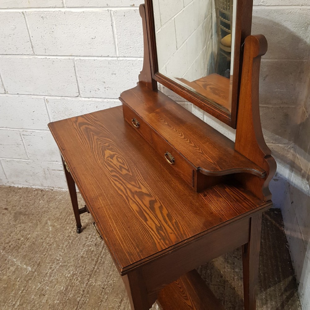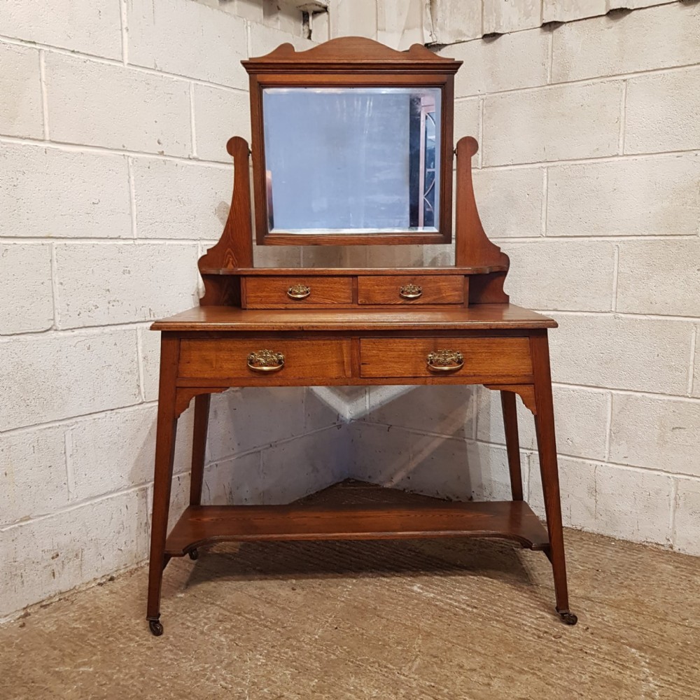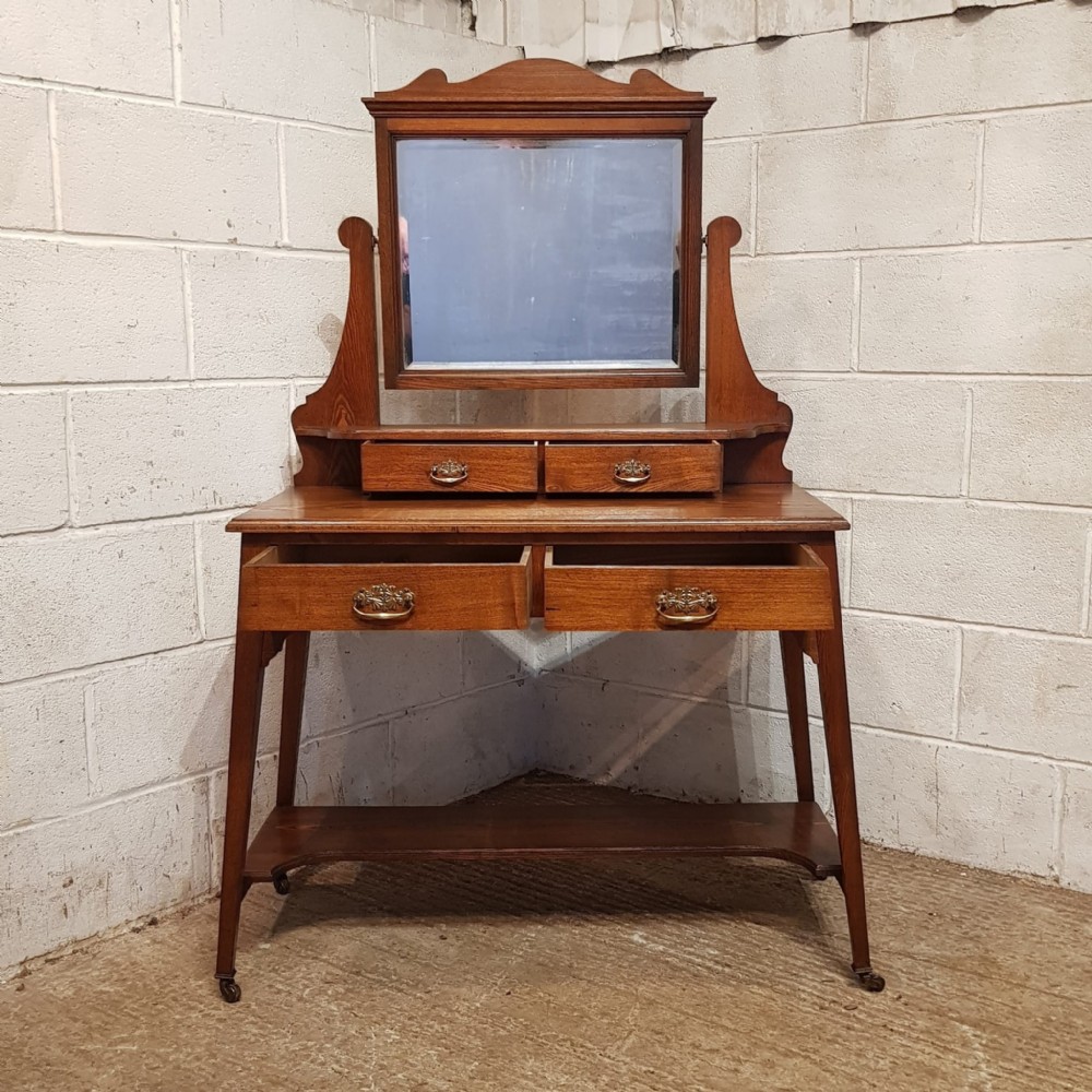 An Oak Art's & Craft's dressing table and dating from around 1900. This dressing table has a bevelled mirror framed mirror with a pediment above on shaped mirror supports which lead down to a shelf with two small drawers underneath it. It has a moulded edge to the top with two drawers underneath and all drawers are Oak lined with original Brass handles. The dressing table stands on square tapered and splayed legs on castors and has a shelf on the bottom.