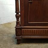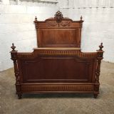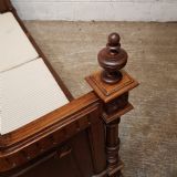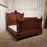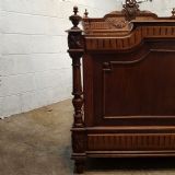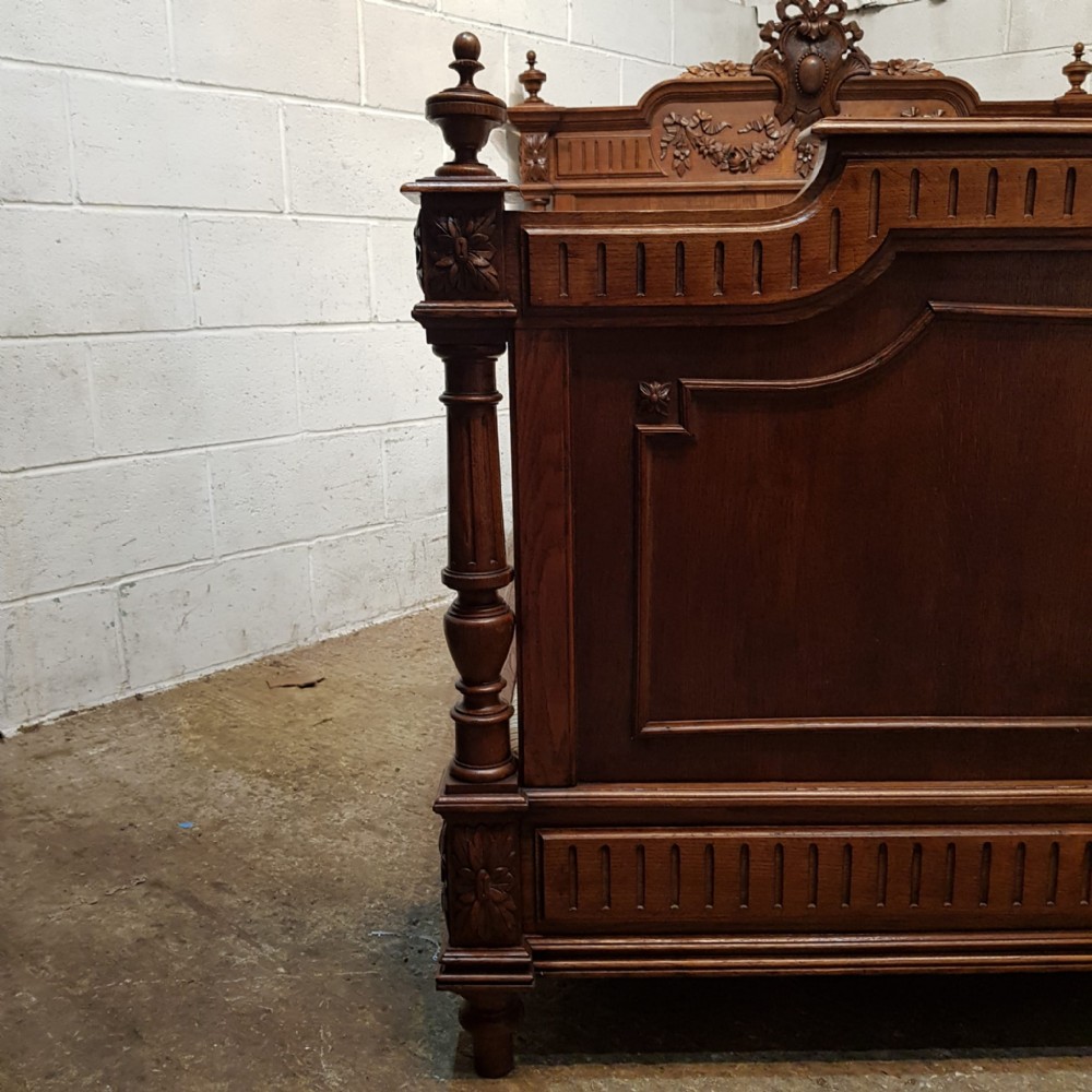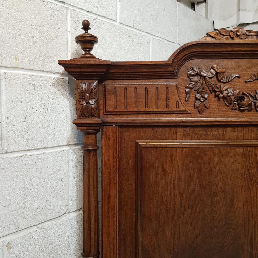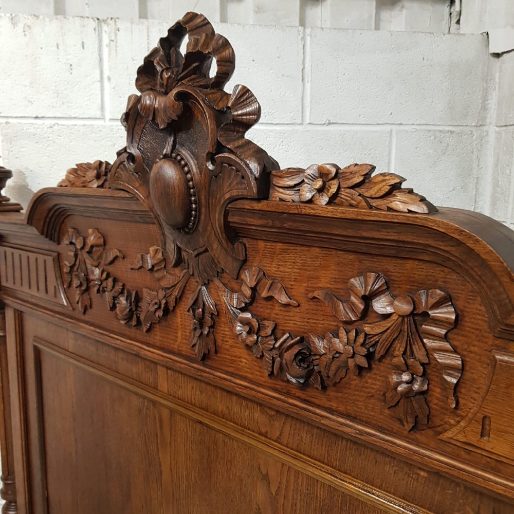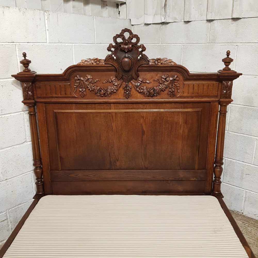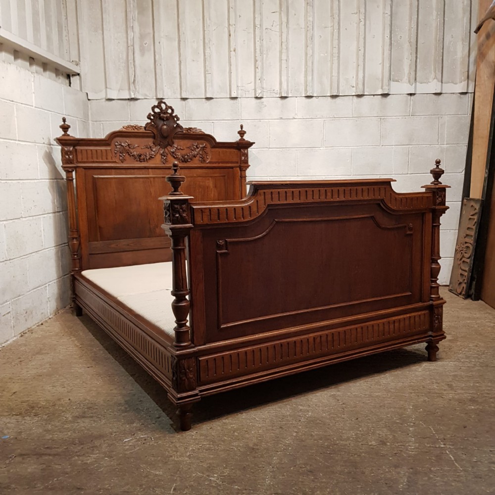 A French carved Oak double bed and dating from around 1890. This original and stunning piece has a turned and carved column to each end of the head board with a turned finial. The top of the head board is heavily carved with ribbons and swags. Underneath is a moulded panel. The foot board has the same columns with a chip carved top rail and a moulded column underneath. Both stand on turned feet with original moulded and chip carved side rails and drop in base and it takes a standard double mattress.