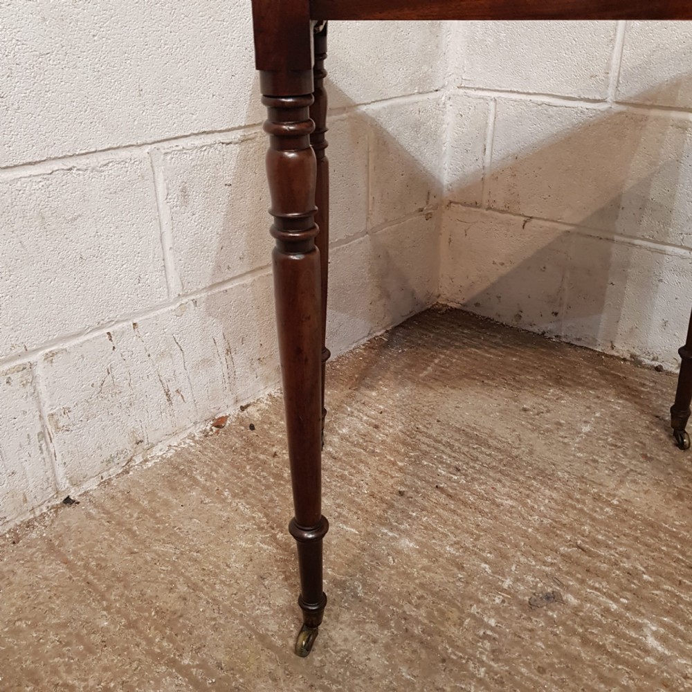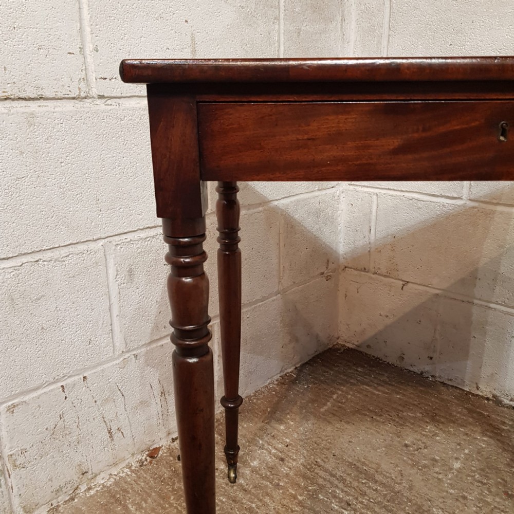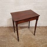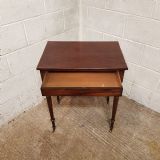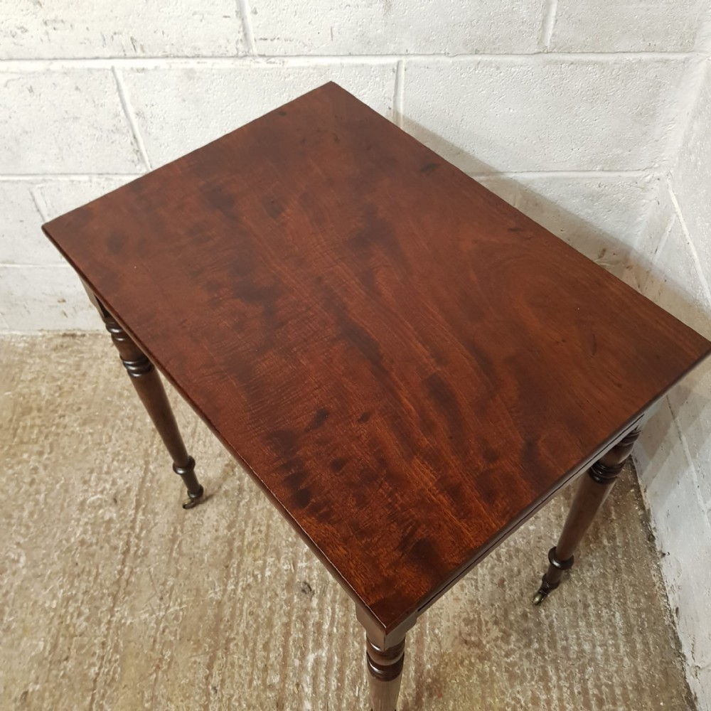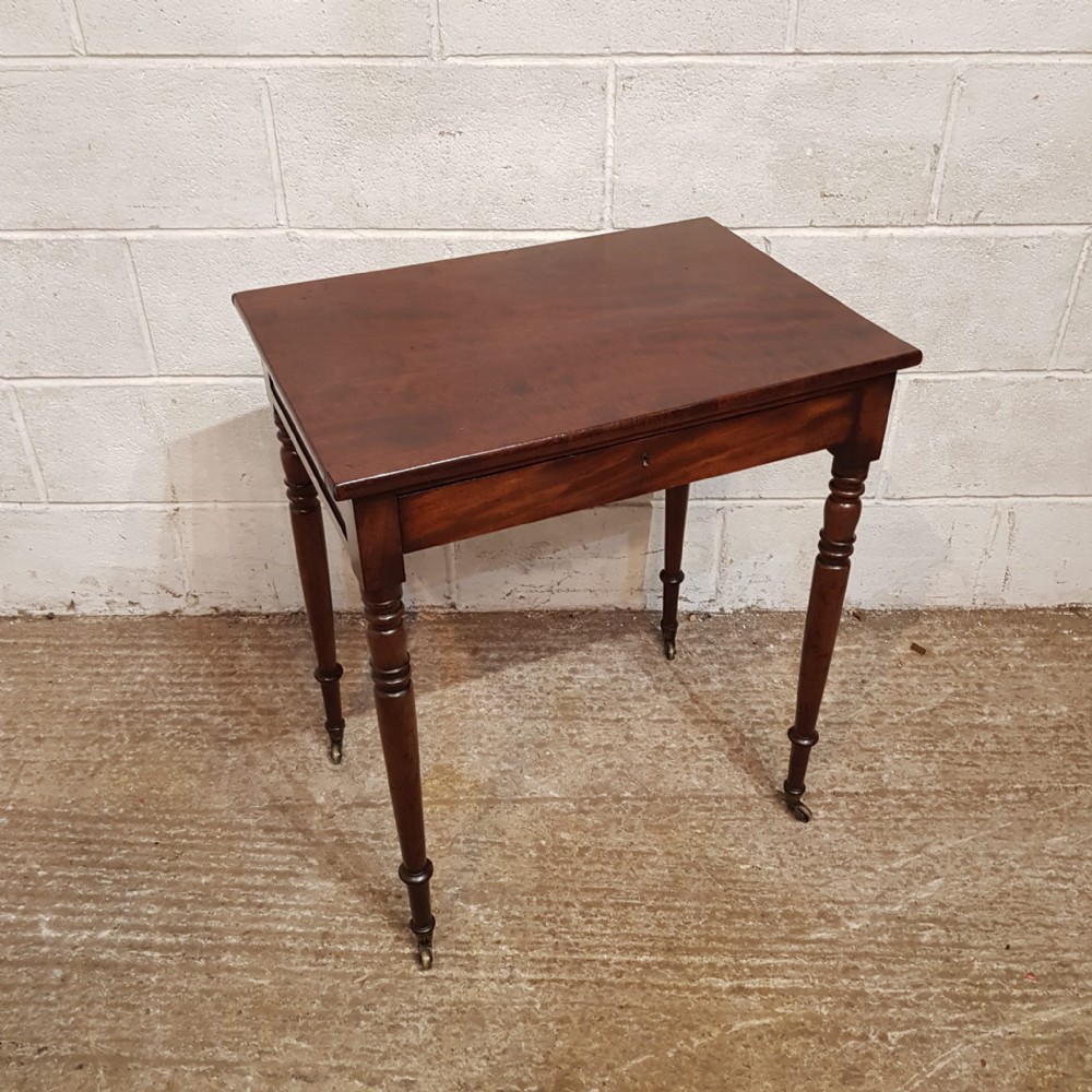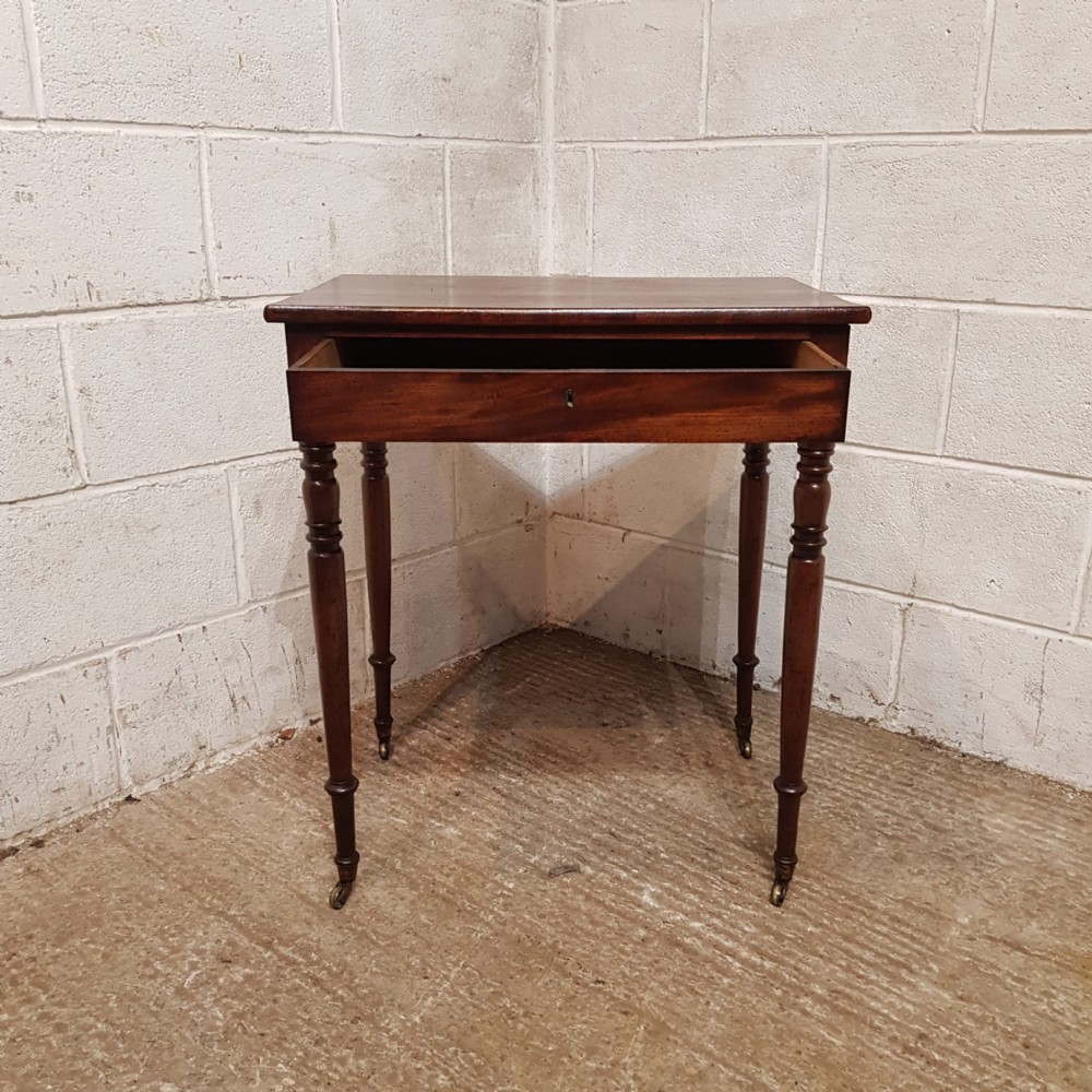 A Regency Mahogany small side table and dating from around 1810. This side table has a rounded edge to the top with a long frieze drawer underneath which is Mahogany lined. The table stands on ring turned legs on castors.
