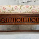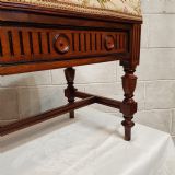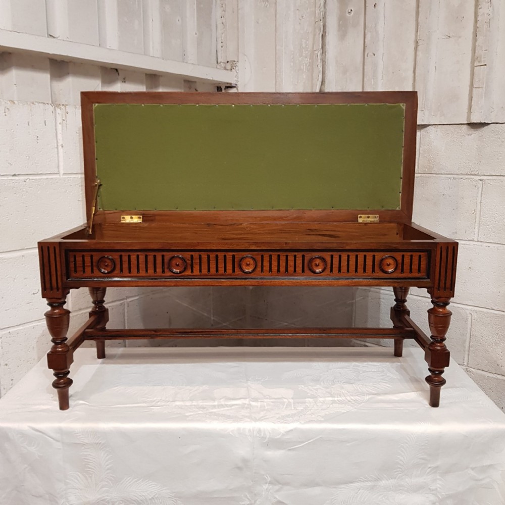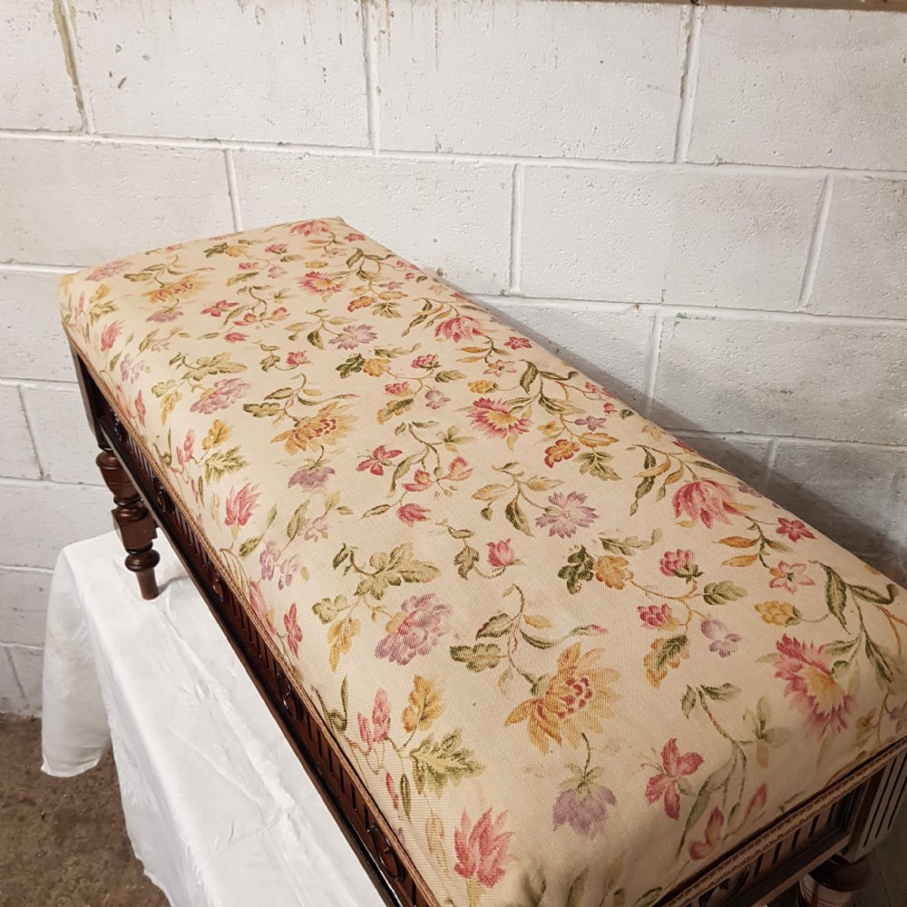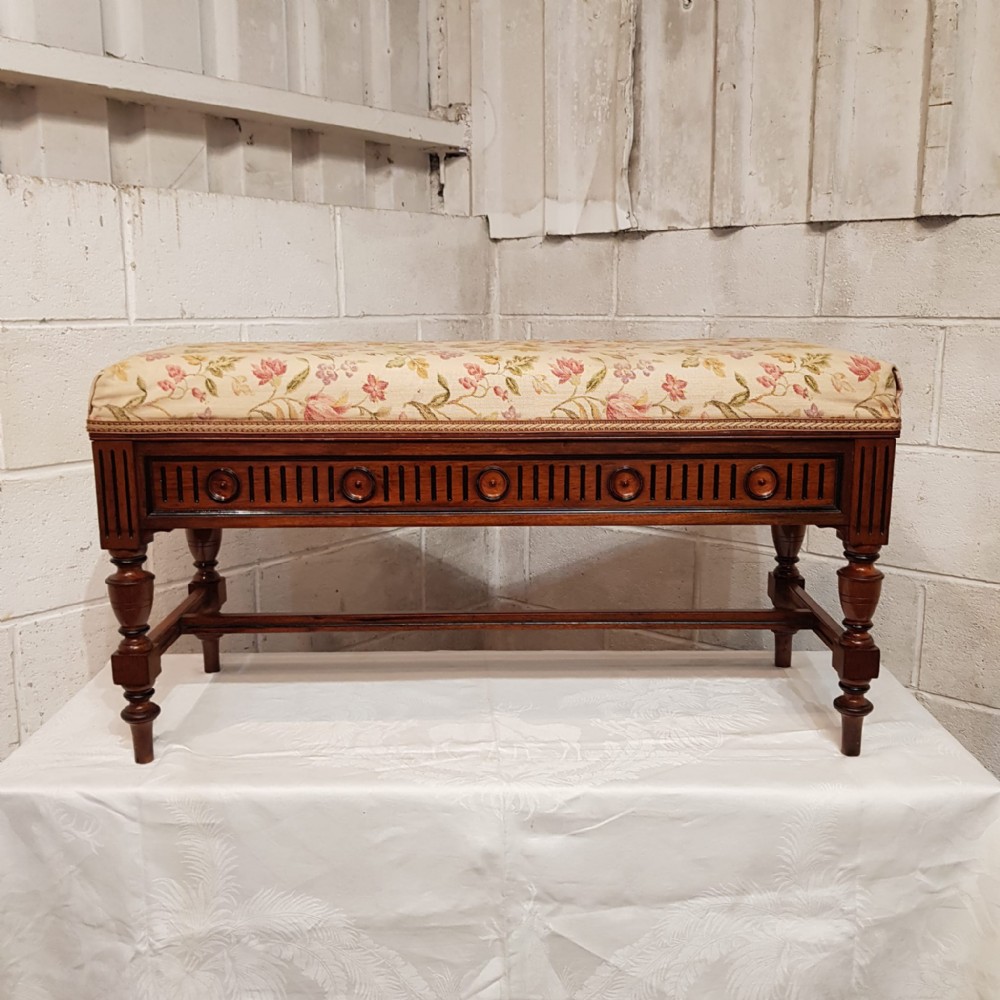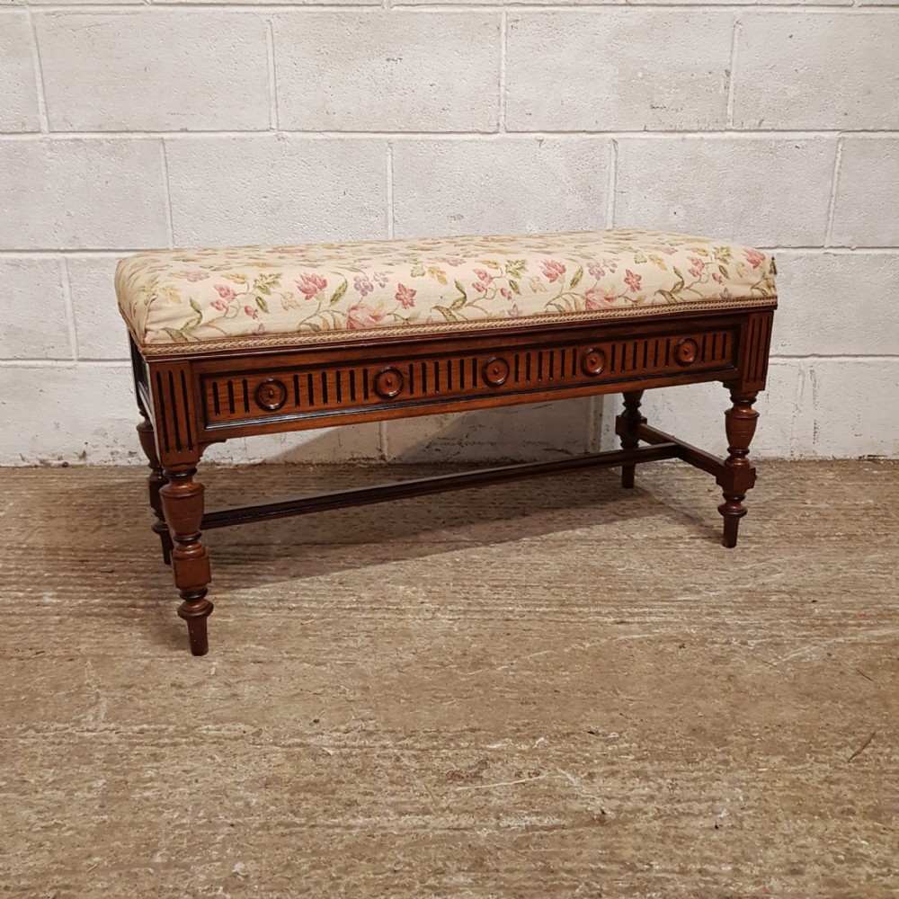 An Oak and Ebony duet piano stool and dating from around 1810. This piano stool has a deep padded seat in very good condition and has a carved frieze that goes all the way around with rounded spandrells. It stands on turned legs and feet with moulded cross stretchers between.