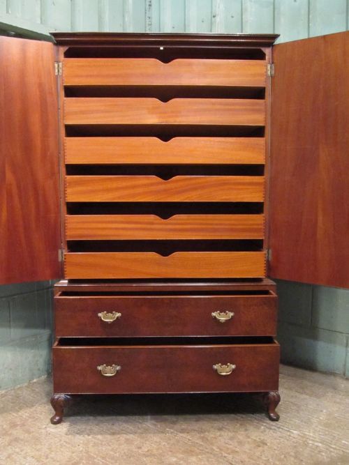 Burr Walnut Queen Anne Style Linen Clothes Press and dating from around 1920. Constructed from quality walnut it has a polished top with cross banded and moulded edge above two doors with moulded arched panels of Burr walnut with original brass handle and key. Internally there are six mahogany sliding drawers. To the base there are two long drawers both of which are mahogany lined with original brass handles and burr walnut fronts. It stands on lovely cabriole legs with moulded shell to the shoulder and on a pad foot.