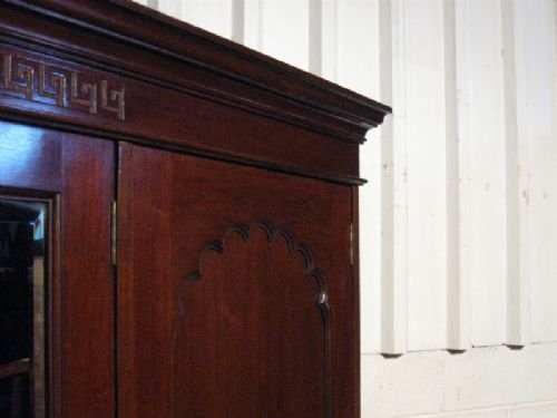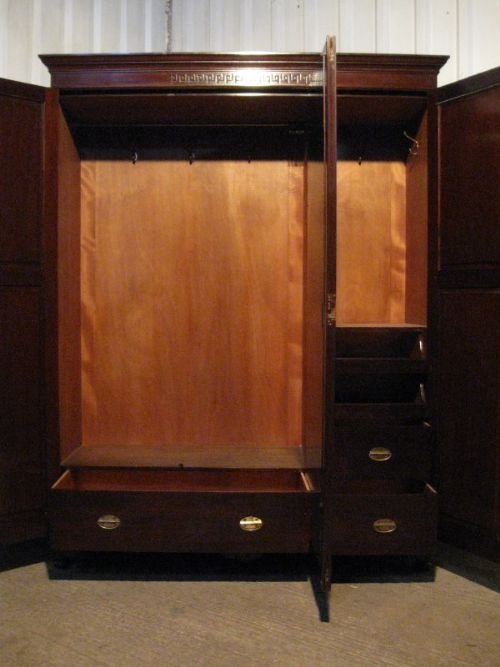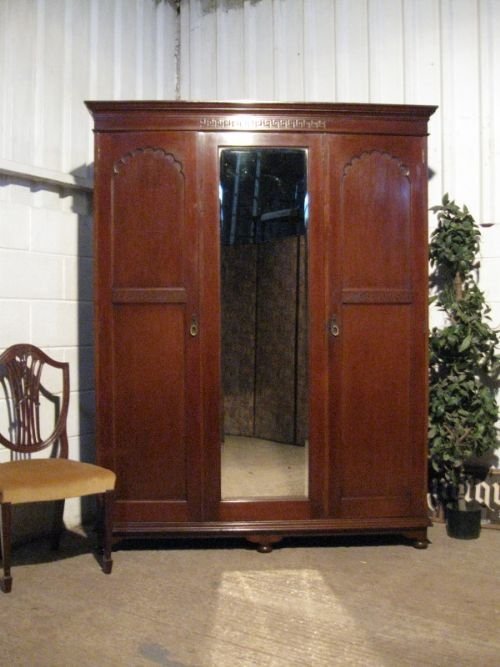 THIS IS A SUPERB QUALITY ANTIQUE EDWARDIAN SMALLER TRIPLE WARDROBE ARMOIRE AND DATING FROM AORUND 1900. IT HAS A CORNICE TOP WITH DEEP FRIEZE AND GREEK KEY CARVING TO THE CENTRE. THERE IS A FULL LENGTH BEVELLED EDGE MIRRORED DOOR TO EITHER SIDE OF WHICH IS A PANELLED DOOR WITH MOULDED PANELS TO THE TOP AND GREEK KEY CARVED PANEL TO THE CENTRE ALL THE DOORS HAVE THEIR ORIGINAL BRASS HANDLES. INTERNALLY THERE IS DOUBLE HANGING SPACE TO ONE SIDE WITH BRASS RAIL AND ORIGINAL BRASS HOOKS AND TO THE OTHER SIDE THERE IS HANGING SPACE WITH BRASS RAIL AND HOOKS AND THERE ARE TWO SLIDING MAHOGANY TRAYS ABOVE TWO DRAWERS ALL OF WHICH ARE MAHOGANY LINED AND WITH ORIGINAL BRASS HANDLES. IT STANDS ON A PLINTH BASE ON BUN FEET.