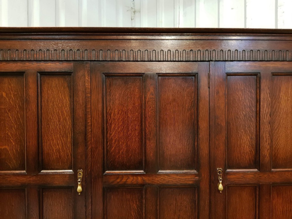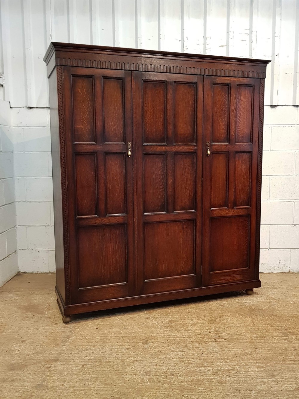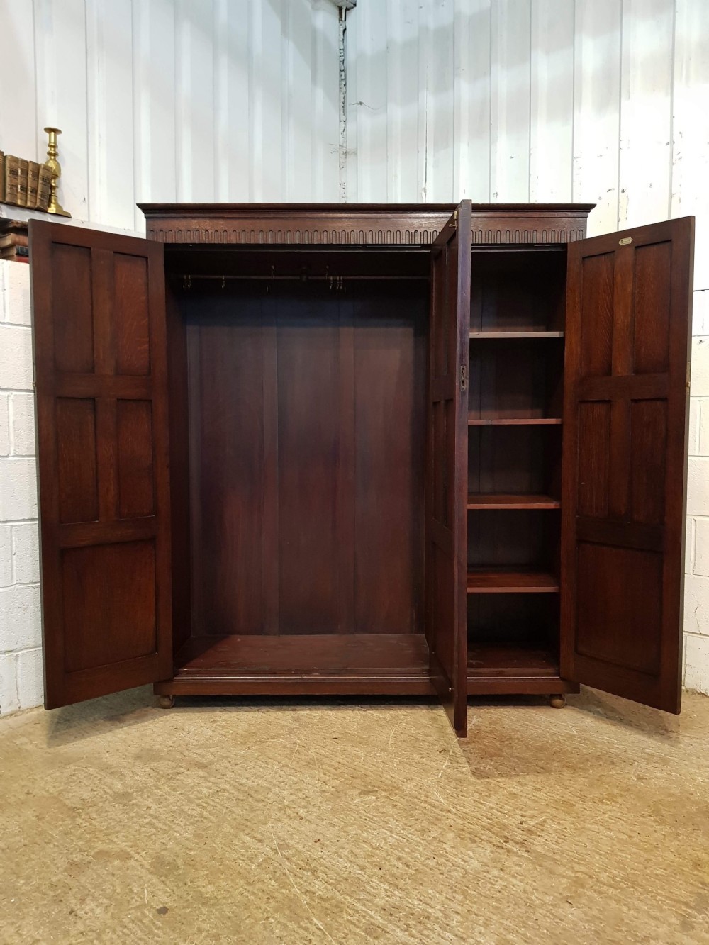 Antique Edwardian Oak Triple Wardrobe dating from around 1900 and by the esteemed furniture makers Waring & Gillow. Of excellent quality and being solid oak it has a cornice top above a carved linen fold frieze and with three full length panelled doors with original brass drop handles. Internally there is double full length hanging space and to one side there are four removable shelves. The whole standing on a deep plinth base on castors. Separates into five pieces for ease of transporting,