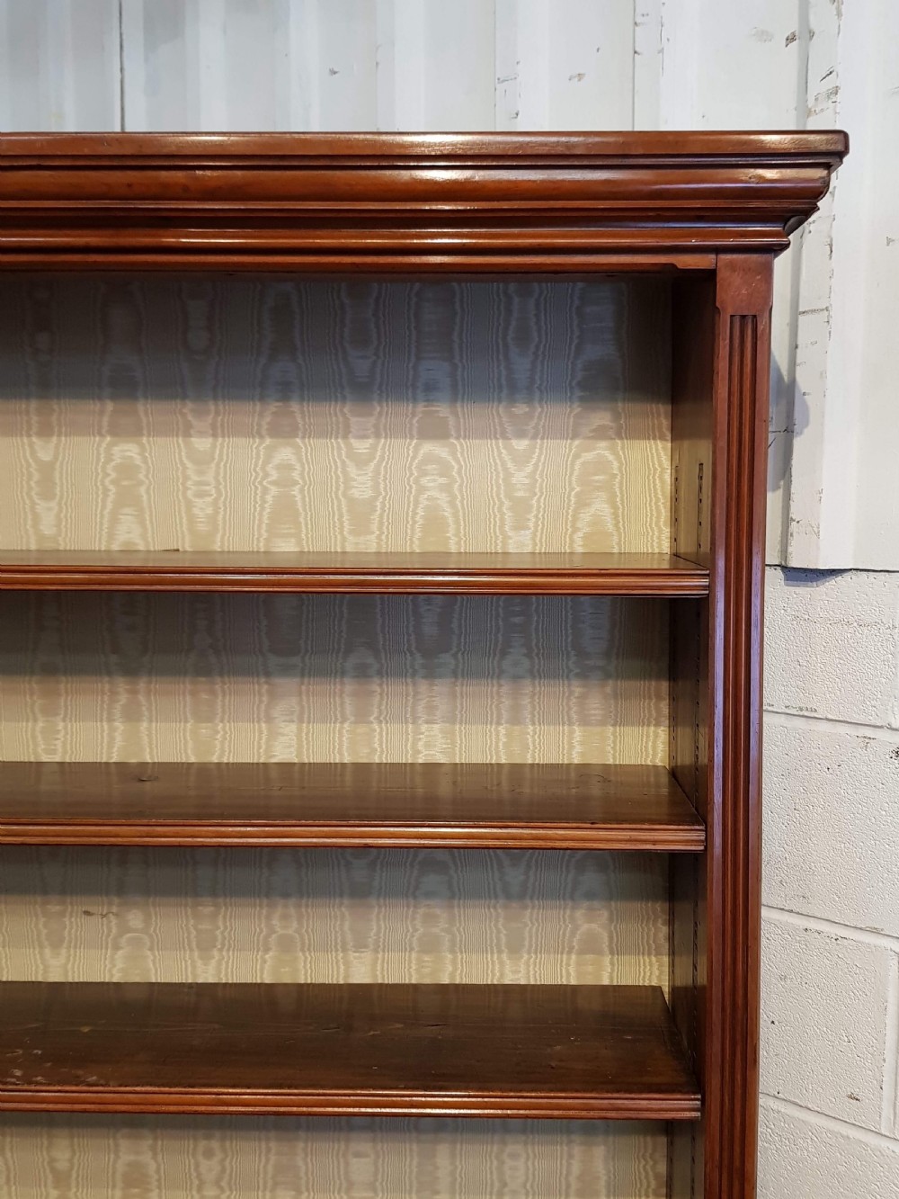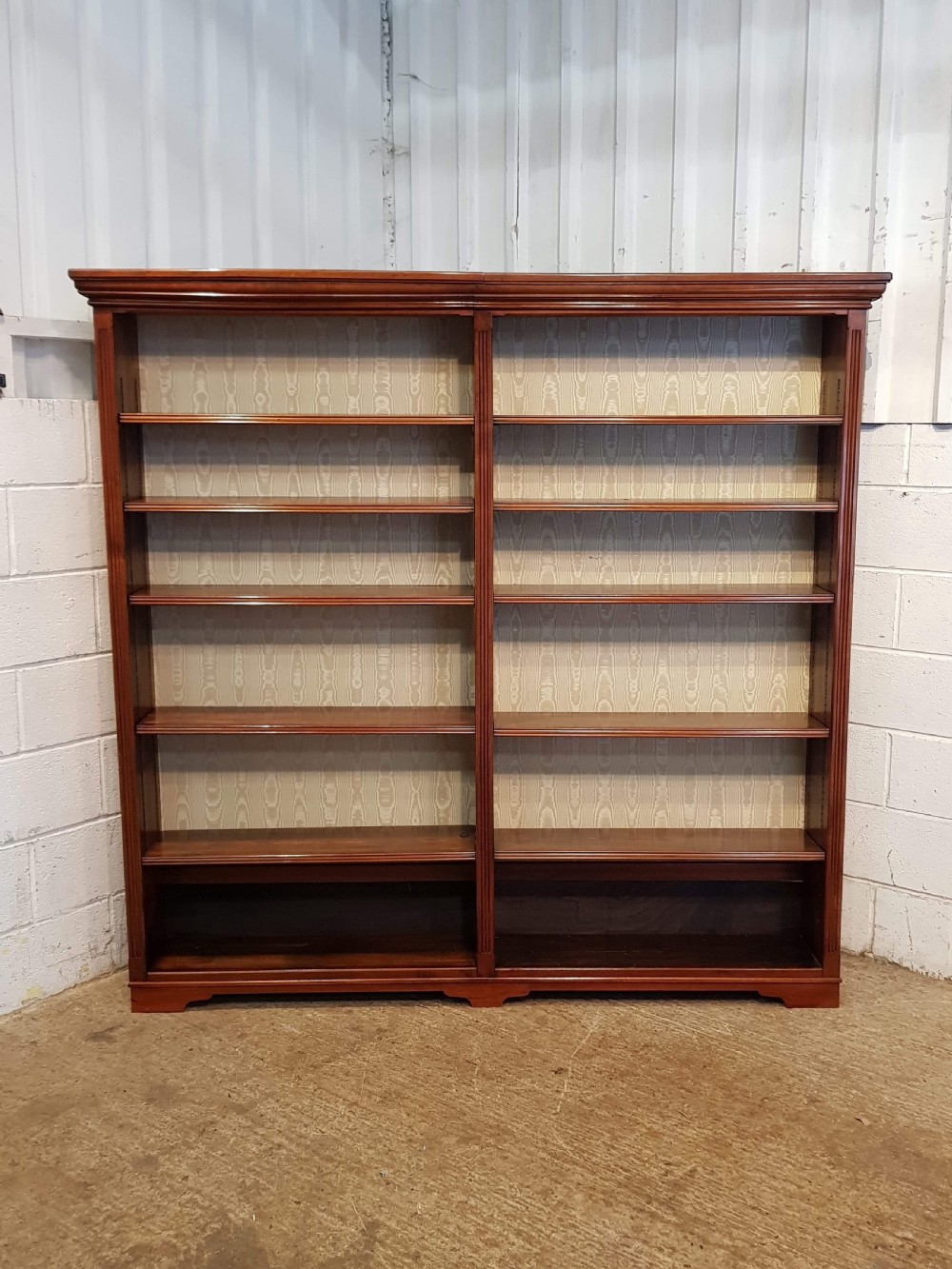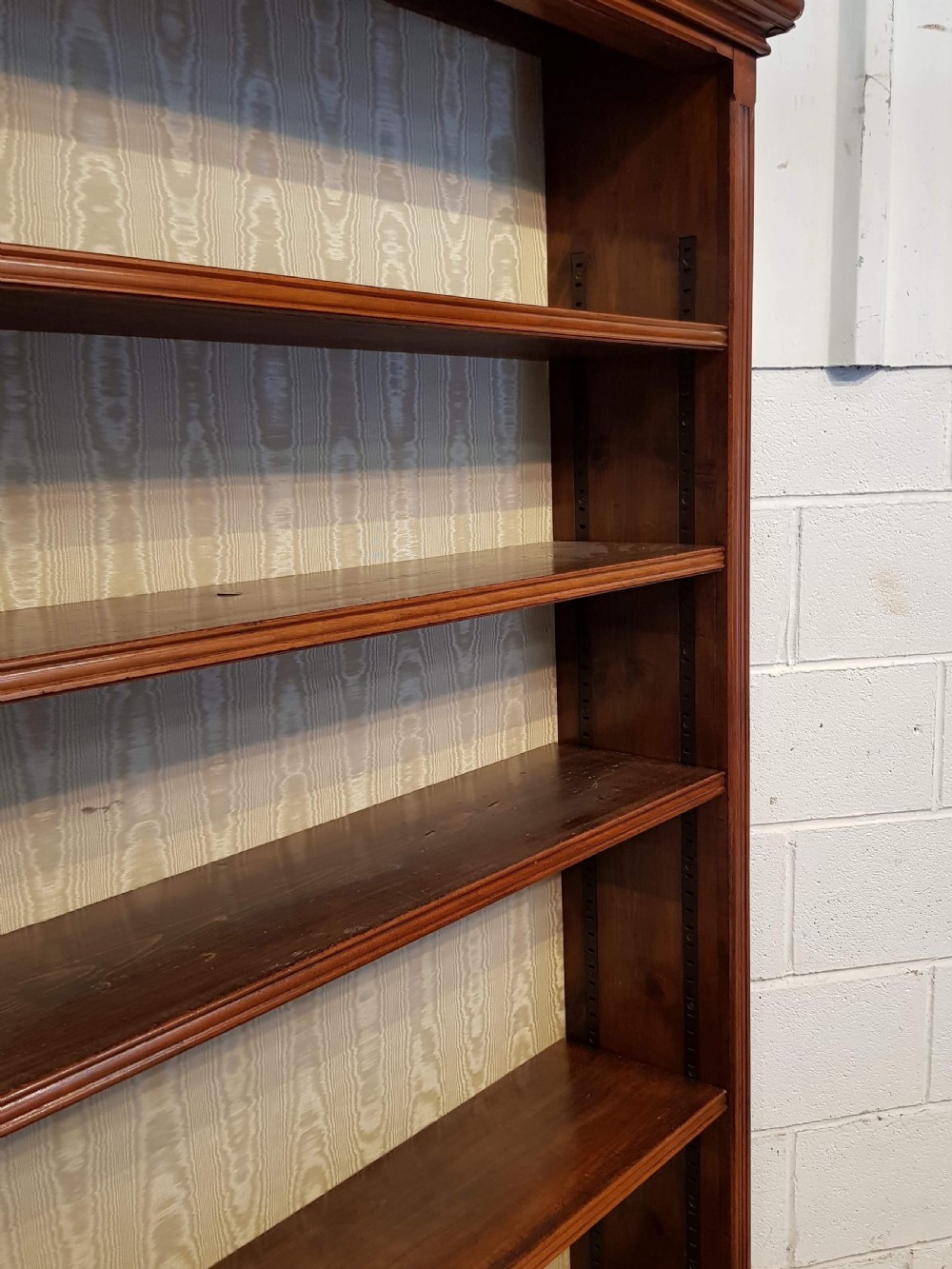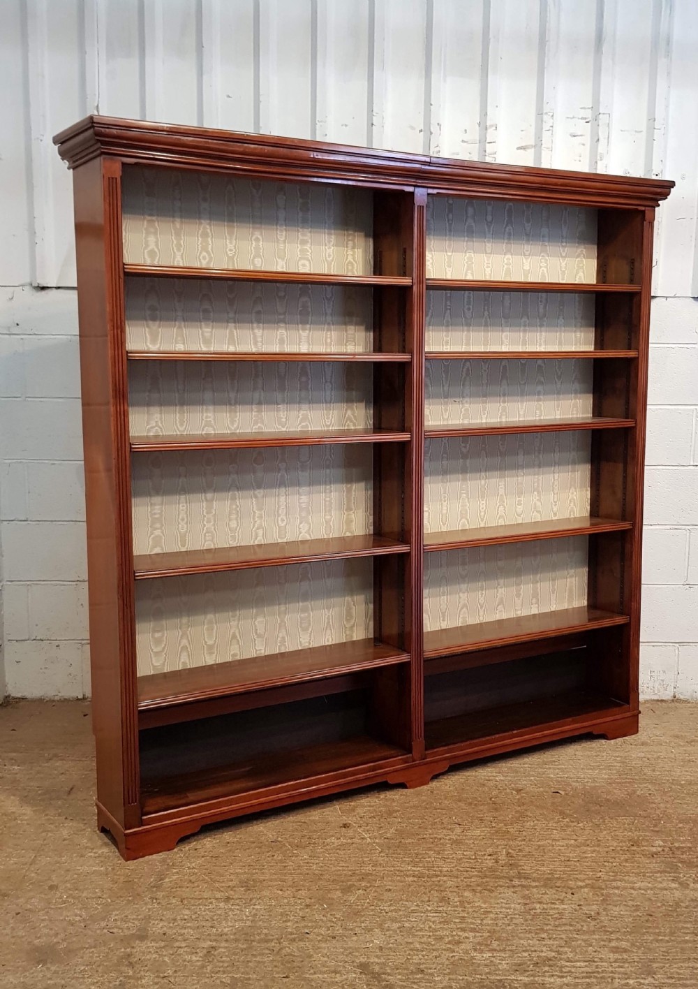 Antique Late Victorian Walnut Large Open Bookcase and dating from around 1890. Constructed from quality walnut it has a cornice top above a central moulded Walnut divider flanked on either side by five original and fully adjustable shelves with moulded edging and above two open compartments. The back has been lined in a quality watered satin fabric and the whole standing on a shaped and moulded plinth base. A very nice bookcase in excellent condition.