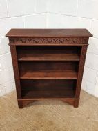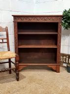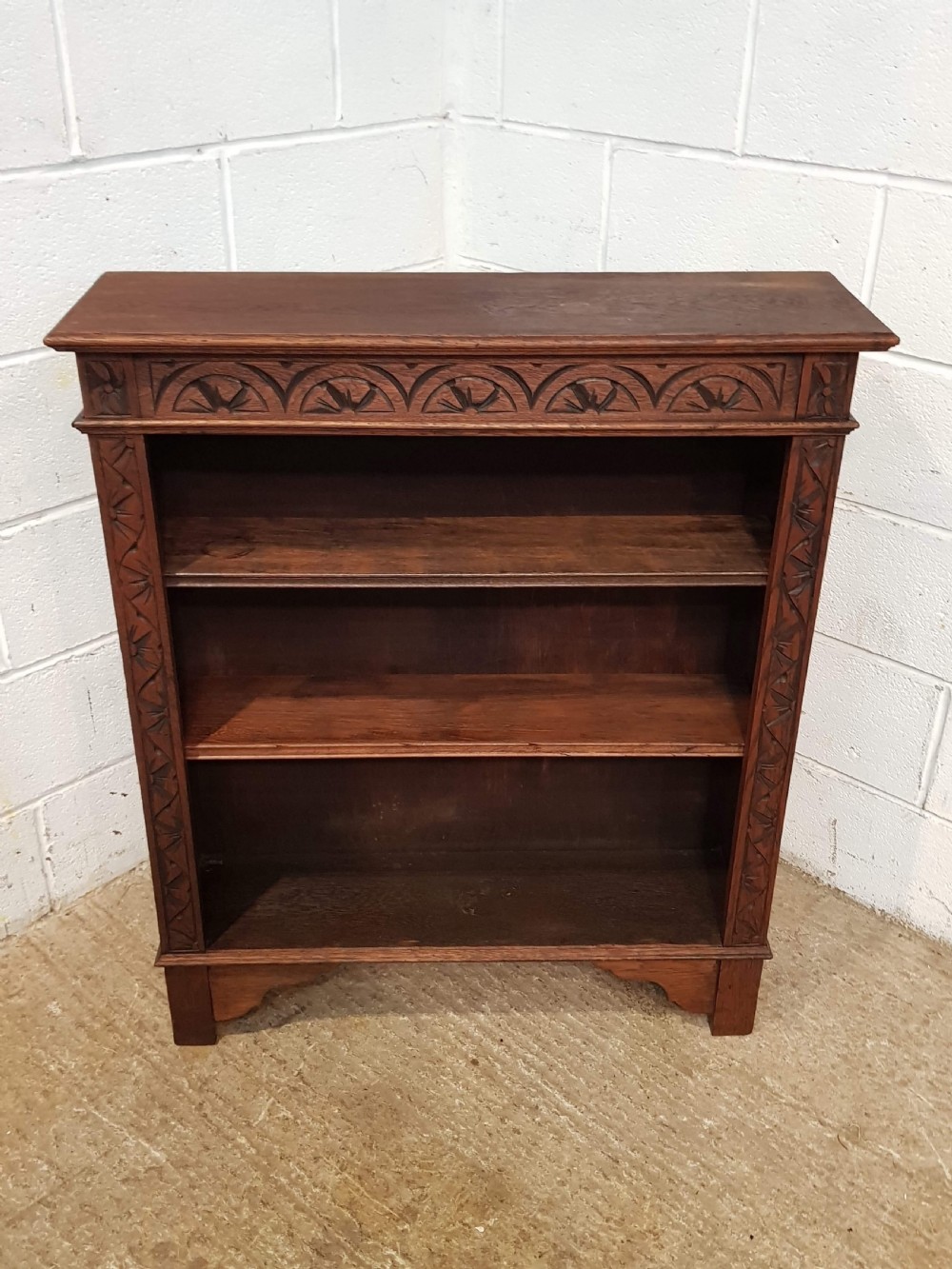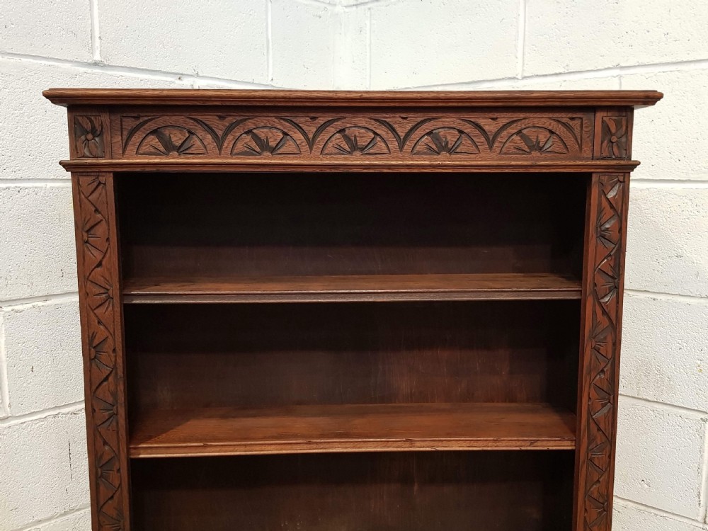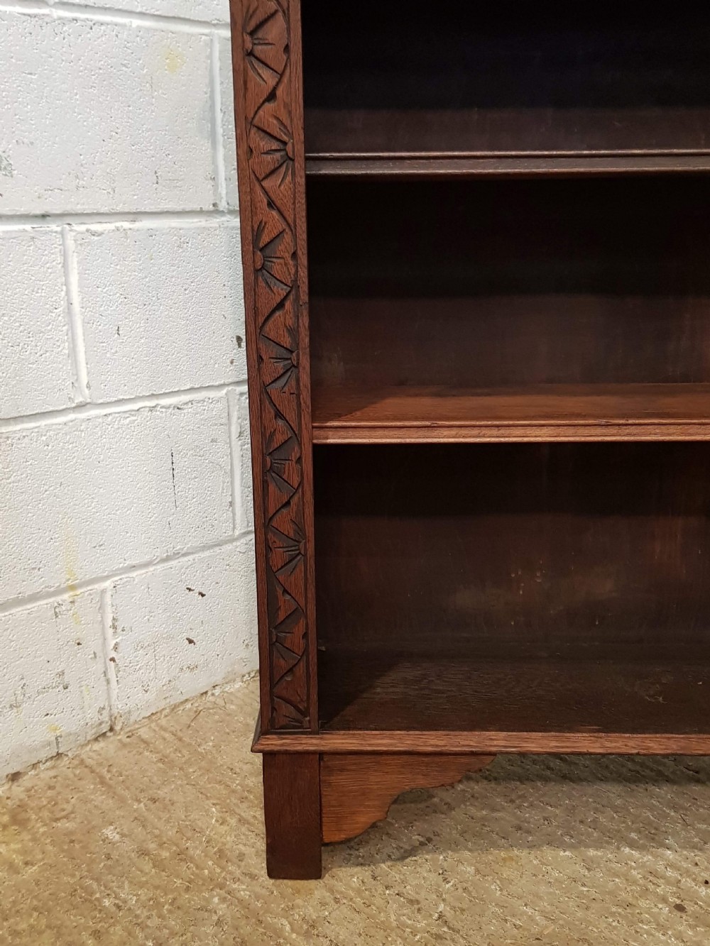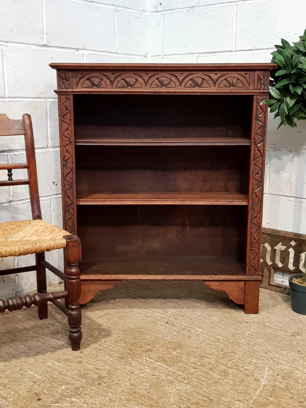Antique Victorian Carved Oak Bookcase and dating from around 1880. Constructed from solid oak it has a moulded edge to the top above a deep carved frieze and is carved to each side. There are two fully adjustable original shelves and it stands on shaped bracket feet.