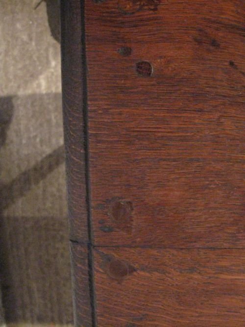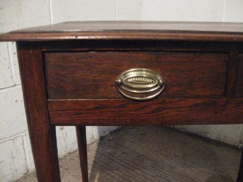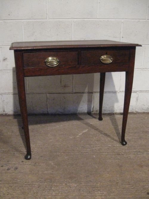 POSSIBLE FREE DELIVERY PLEASE ENQUIRE ABOUT THIS LOVELY ANTIQUE GEORGE 111 PEG JOINED OAK SIDE TABLE DATING FROM AORUND 1780. THE PLANK TOP WITH MOULDED EDGE IS PEG JOINED TO THE FRAME (PLEASE SEE PHOTOS) WITH TWO DRAWERS TO THE FRONT BOTH OF WHICH ARE PINE LINED AND WITH ORIGINAL BRASS HANDLES IT STANDS ON TAPERING LEGS ON A PAD FOOT.
