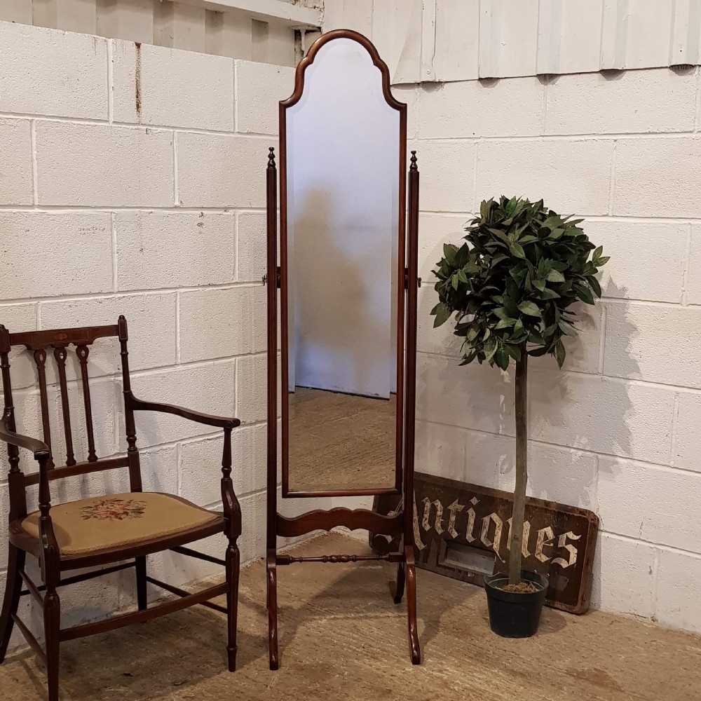 Antique Queen Anne Stye Mahogany Cheval Mirror dating from around 1920. Co strutted from quality mahogany it has a bevelled and shaped mirror set within a mahogany arched frame on squared tapering and reeded supports with turned finials. It is supported on splayed legs on a pad foot joined by a shaped splatt and turned stretcher.