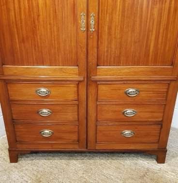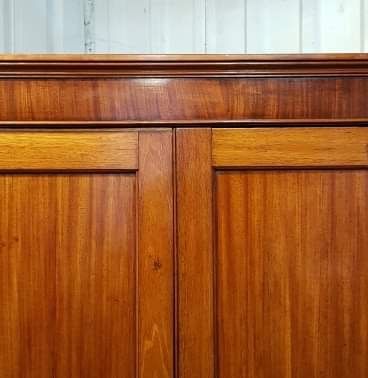 Channel Island Wardrobes were inspired by the French Armoire and were made with the ease of moving them about the house in mind rather than taking them on campaign. The sides have tenons to both the top and bottom, fitting to mortice joints to the base and cornice. When the material covered, panelled back board is unscrewed from the sides, the cornice can be lifted off and in turn the sides with hinged doors from the base. To disassemble it further, the doors can be unscrewed from their hinges.