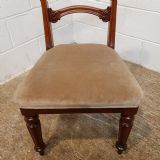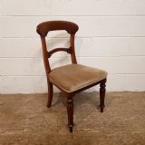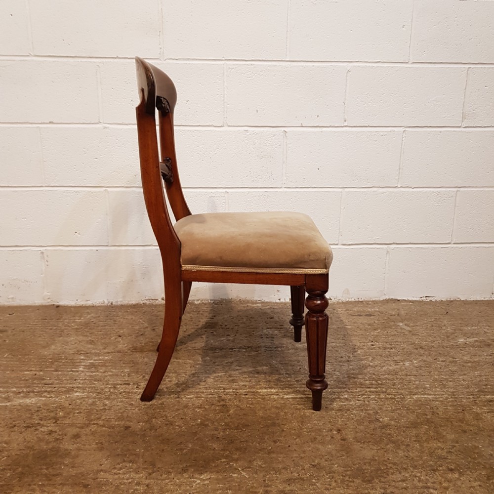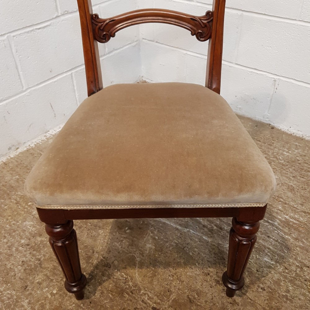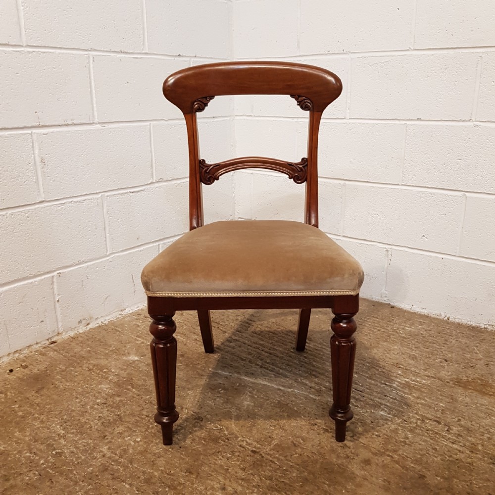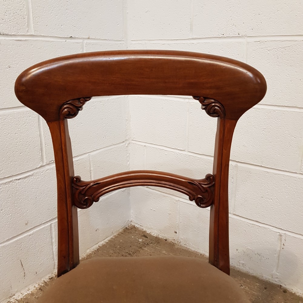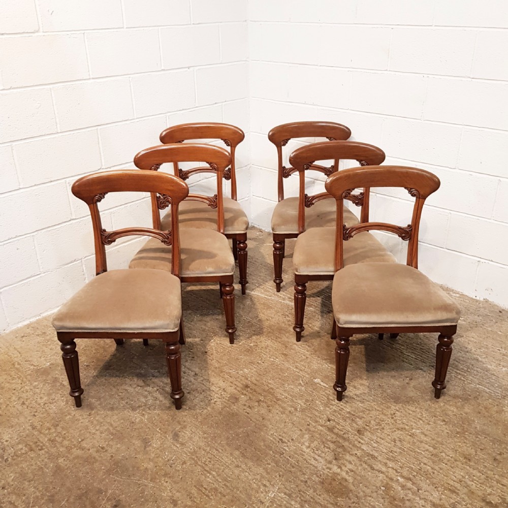 Antique Set Six Victorian Mahogany Bar Back Dining Chairs and dating from around 1880. Constructed from quality mahogany with each chair having a curved deep bar back with carved mouldings and above a central curved bar support also with carved mouldings and above a stuff over seat covered in a quality velvet fabric in good condition. They are raised on a turned and fluted leg.
